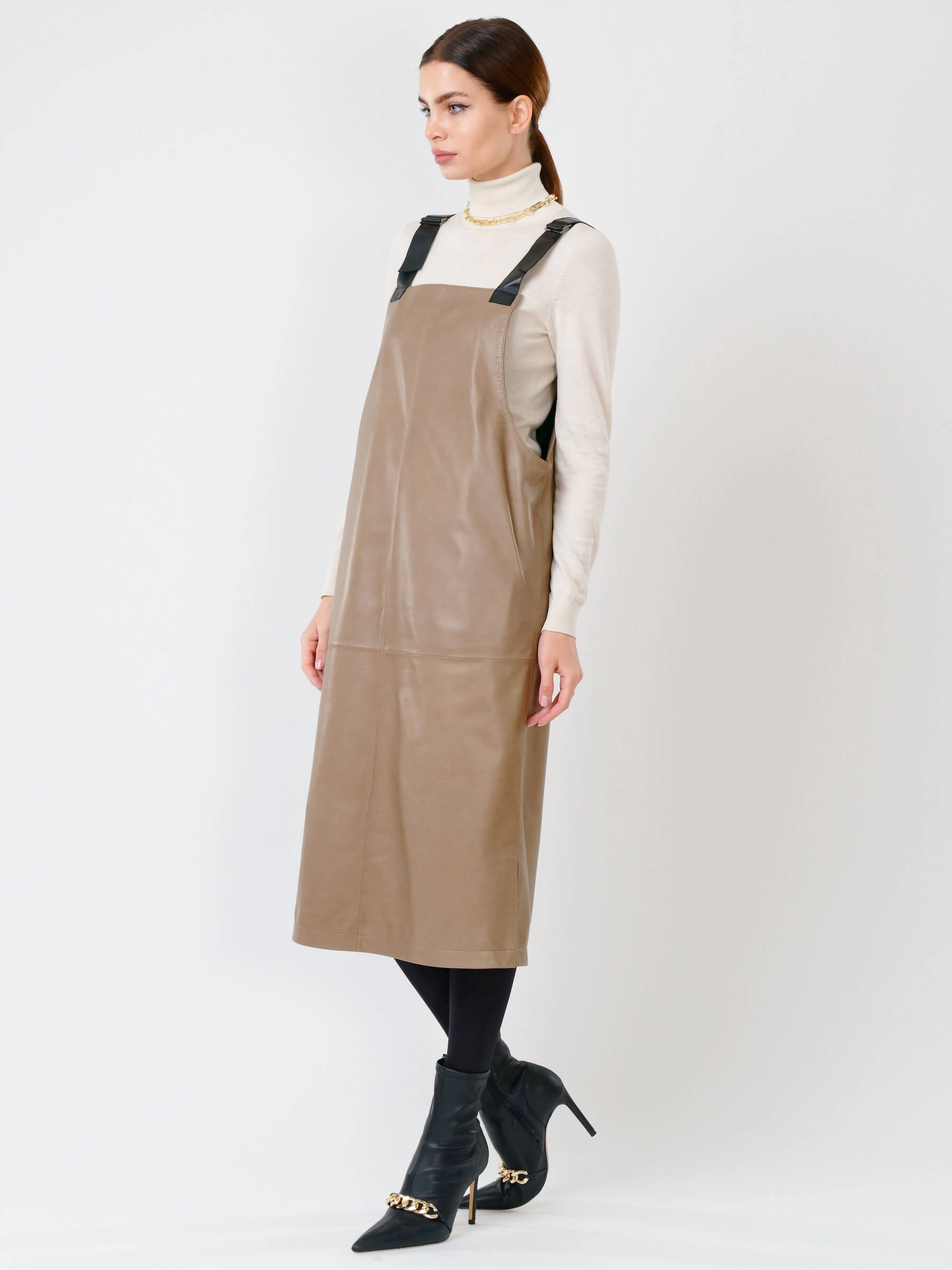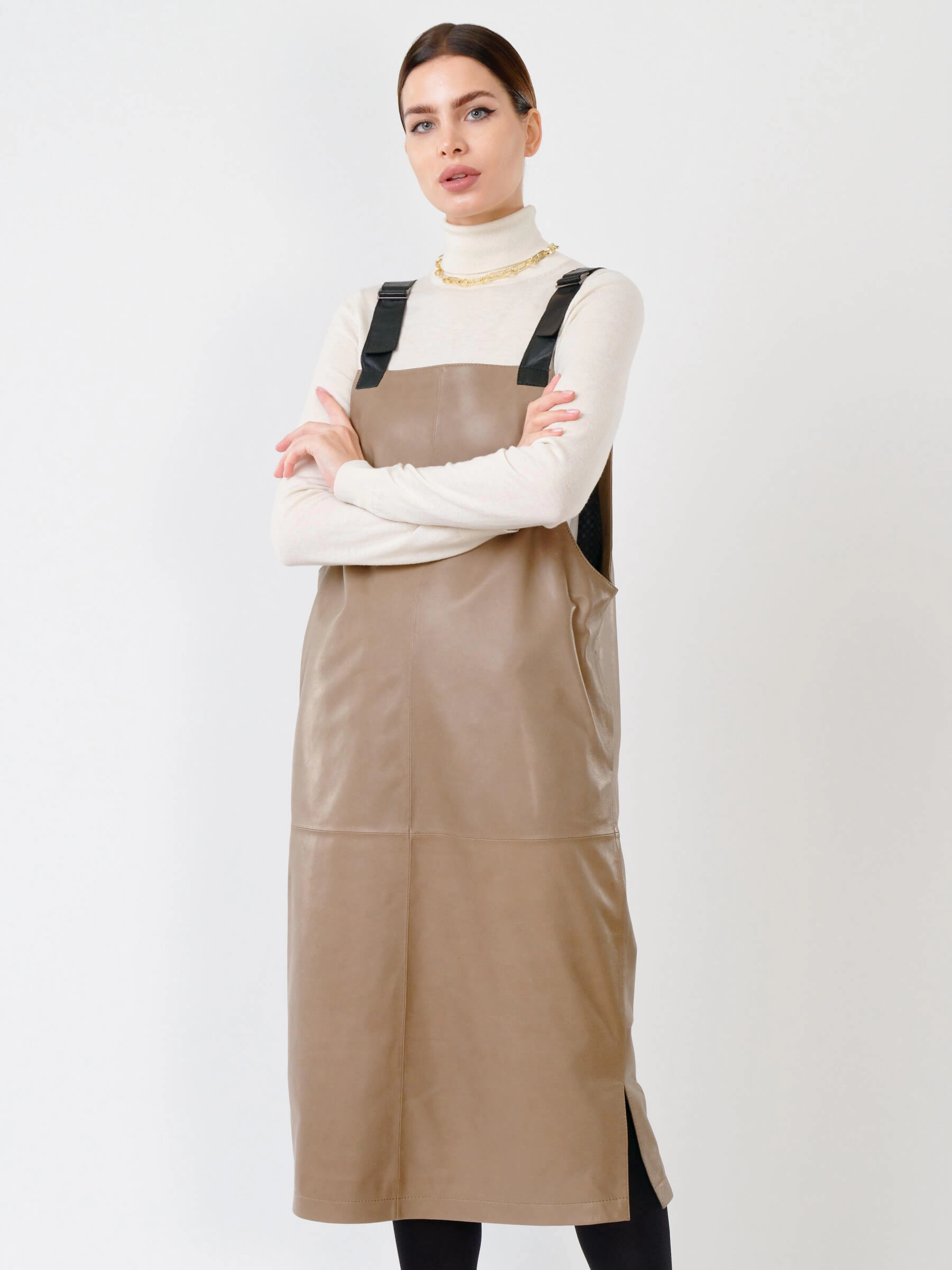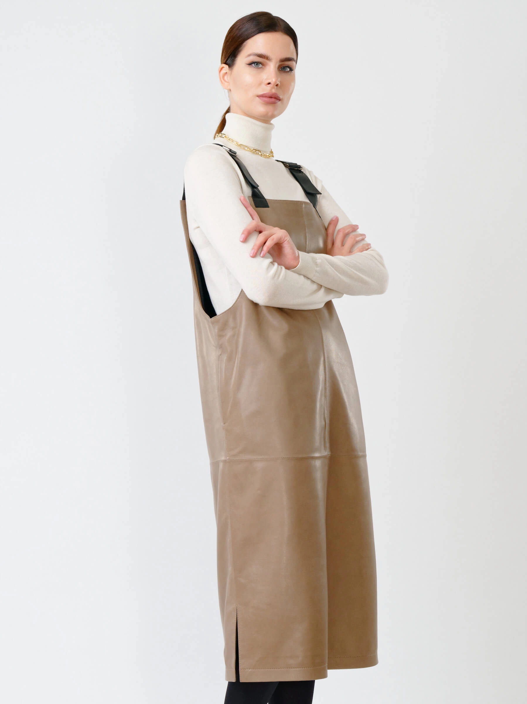 Серо-коричневый кожаный сарафан длиной 98 см из натуральной органической кожи. Прямой крой с широкими лямками создает элегантный силуэт, а глубокие боковые разрезы обеспечивают легкость движения. В отличие от аналогов, эта модель полностью лишена фурнитуры - молнии и застежки заменяет продуманная конструкция из цельного кожного полотна. При обработке материала применялась особая технология дубления растительными экстрактами, благодаря чему кожа сохранила природную мягкость и приобрела гипоаллергенные свойства. Тактильные качества превосходят обычную кожу - поверхность напоминает струящийся шелк, но с характерной благородной текстурой.