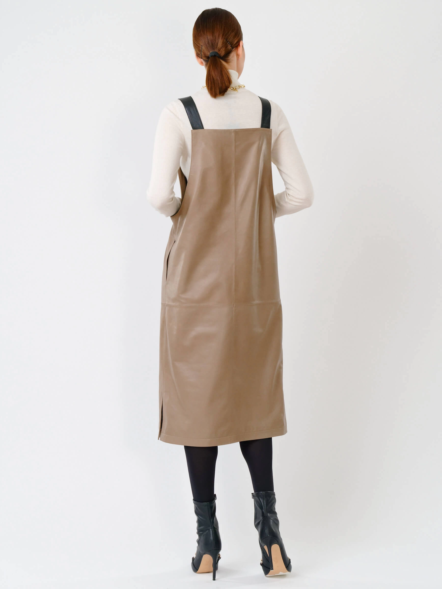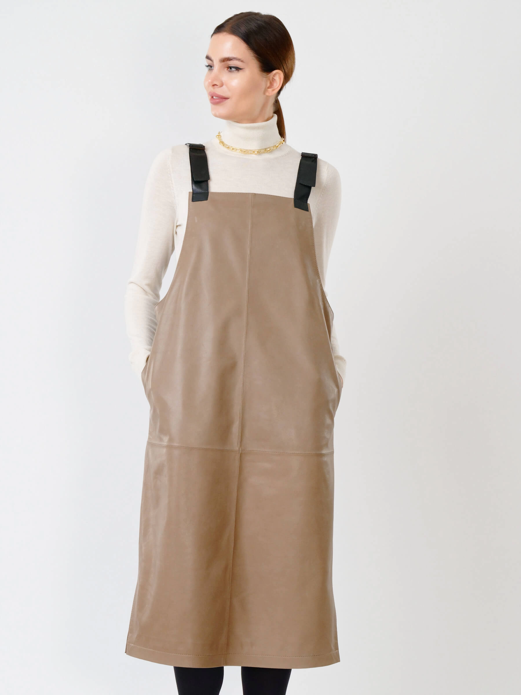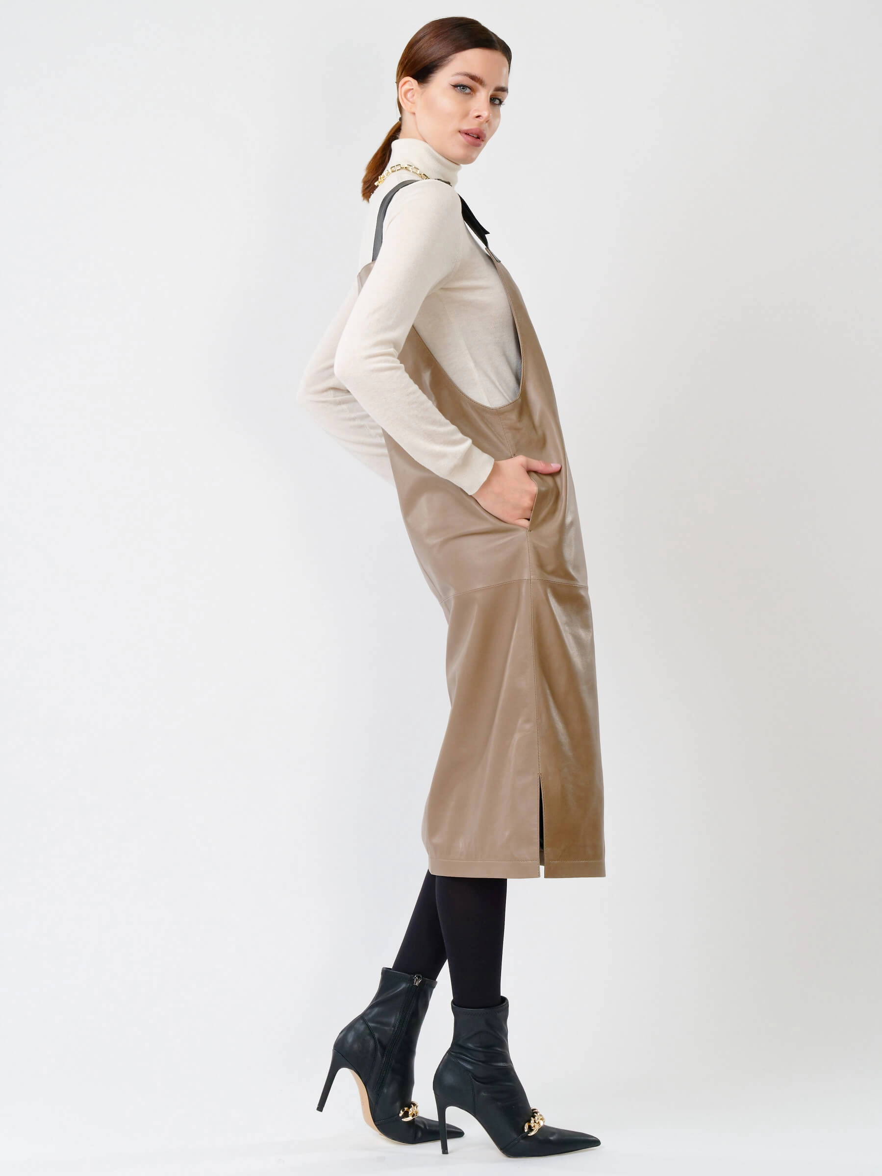 Серо-коричневый кожаный сарафан длиной 98 см из натуральной органической кожи. Прямой крой с широкими лямками создает элегантный силуэт, а глубокие боковые разрезы обеспечивают легкость движения. В отличие от аналогов, эта модель полностью лишена фурнитуры - молнии и застежки заменяет продуманная конструкция из цельного кожного полотна. При обработке материала применялась особая технология дубления растительными экстрактами, благодаря чему кожа сохранила природную мягкость и приобрела гипоаллергенные свойства. Тактильные качества превосходят обычную кожу - поверхность напоминает струящийся шелк, но с характерной благородной текстурой.
