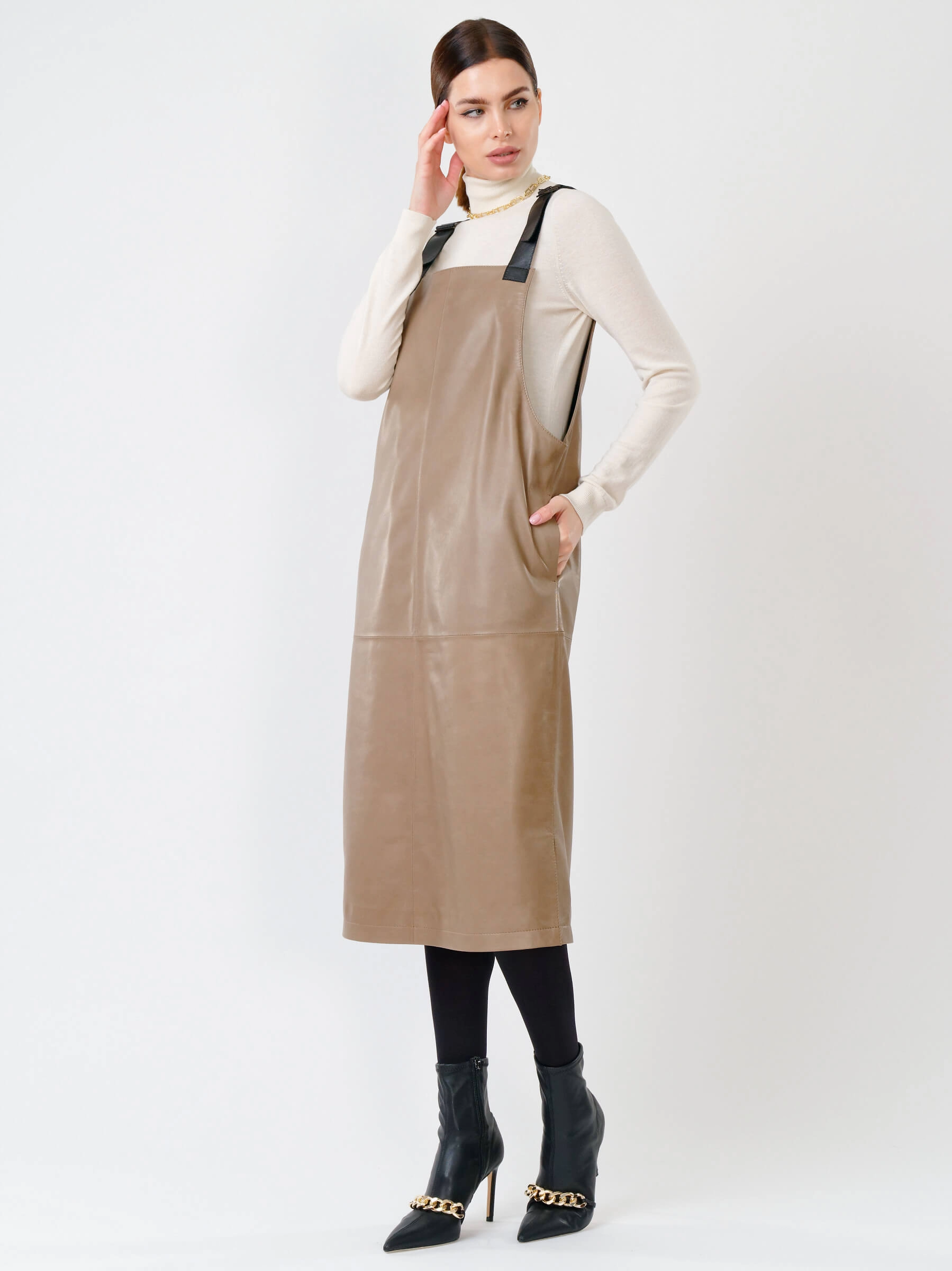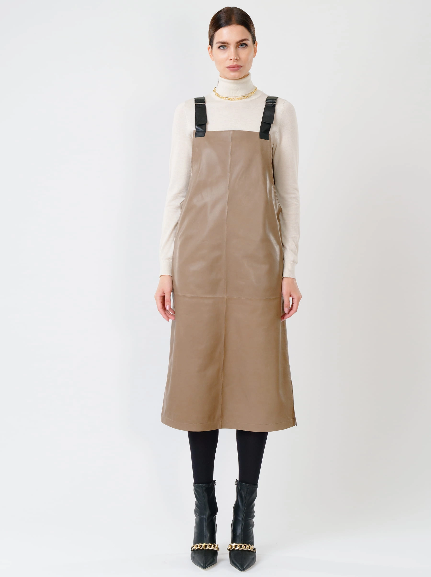 Товар кожаный сарафан 01, серо-коричневый, размер 44, артикул 85271 выполнен из натуральной кожи с застежкой бретели. Рассчитан на сезон: демисезон. Длина изделия 98 см, силуэт прямой.