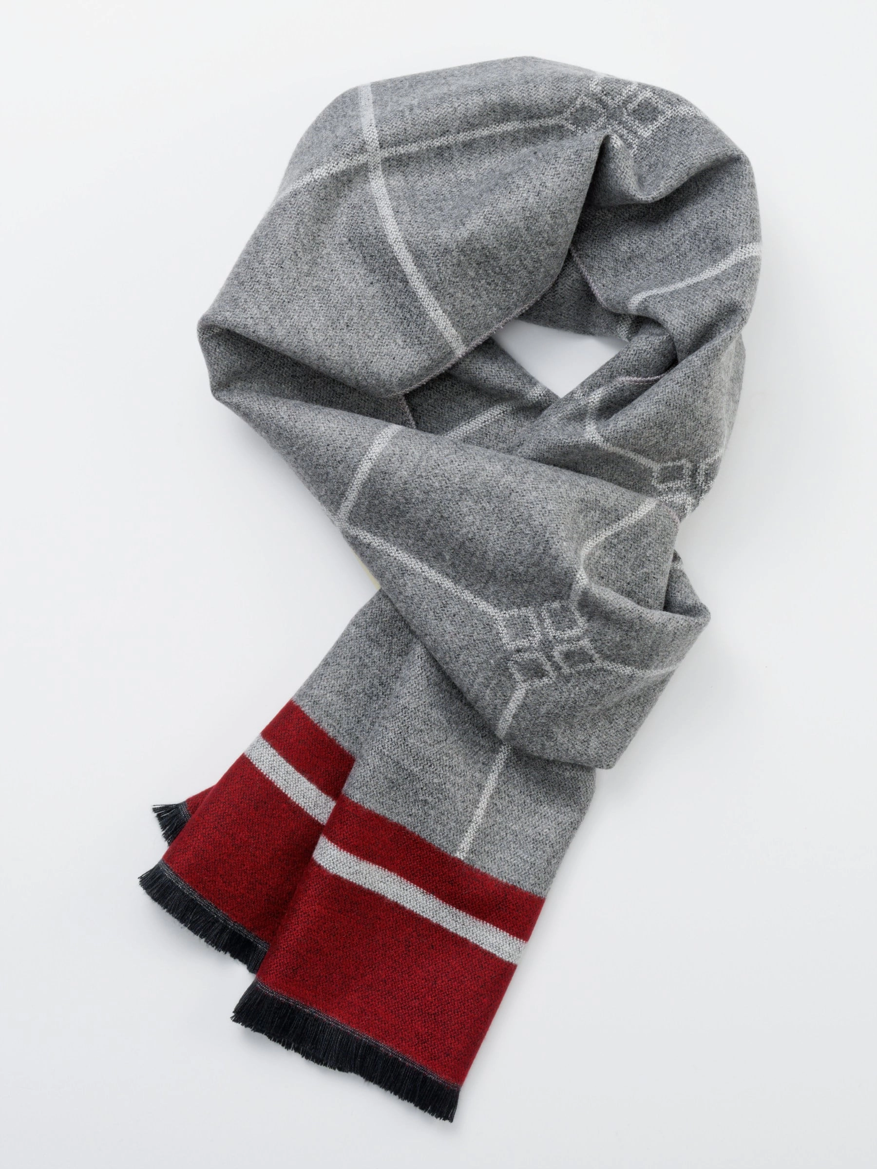 Очень лаконичный и выдержанный серый шарф с бордовым кантом поддержит настроение как лаконичного наряда, так и непринужденного образа. Аксессуар выполнен из мягкого кашемира с экологически чистым и современным материалом Modal.