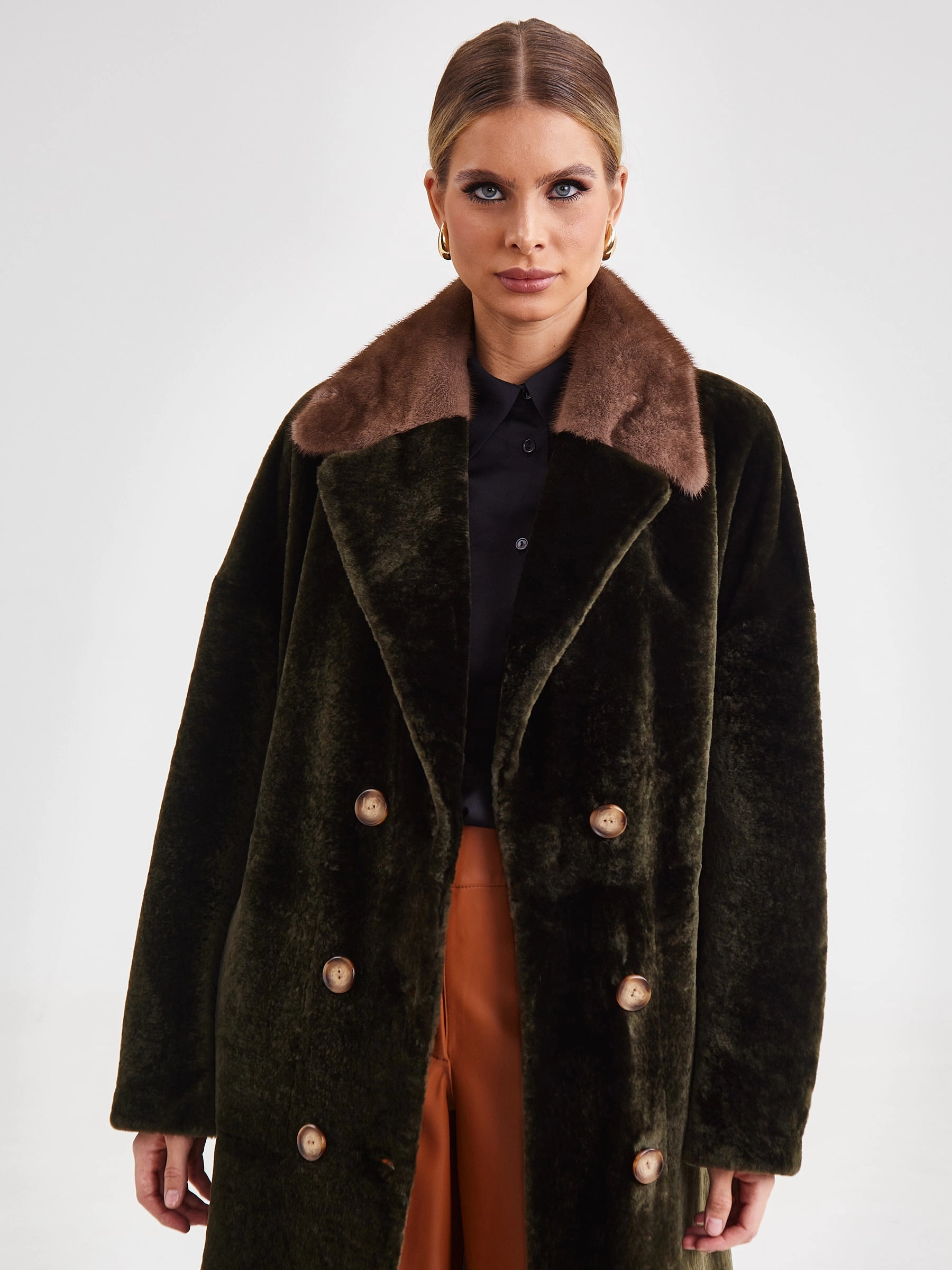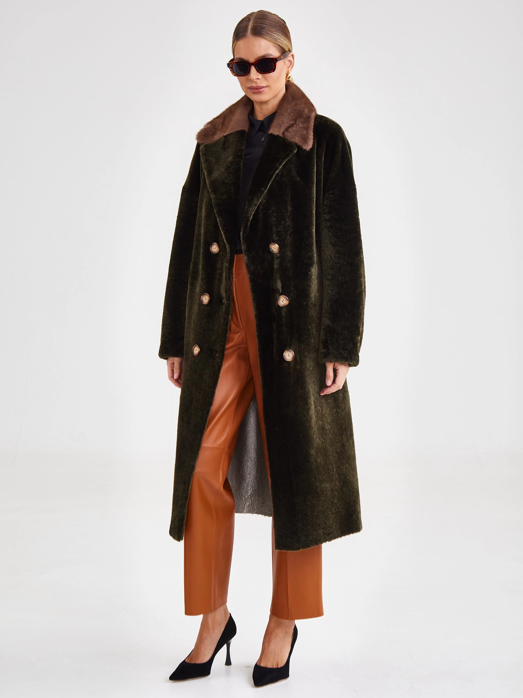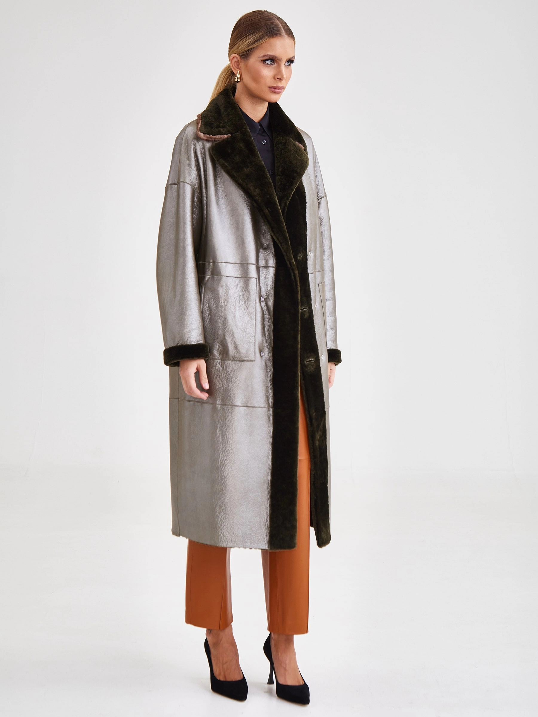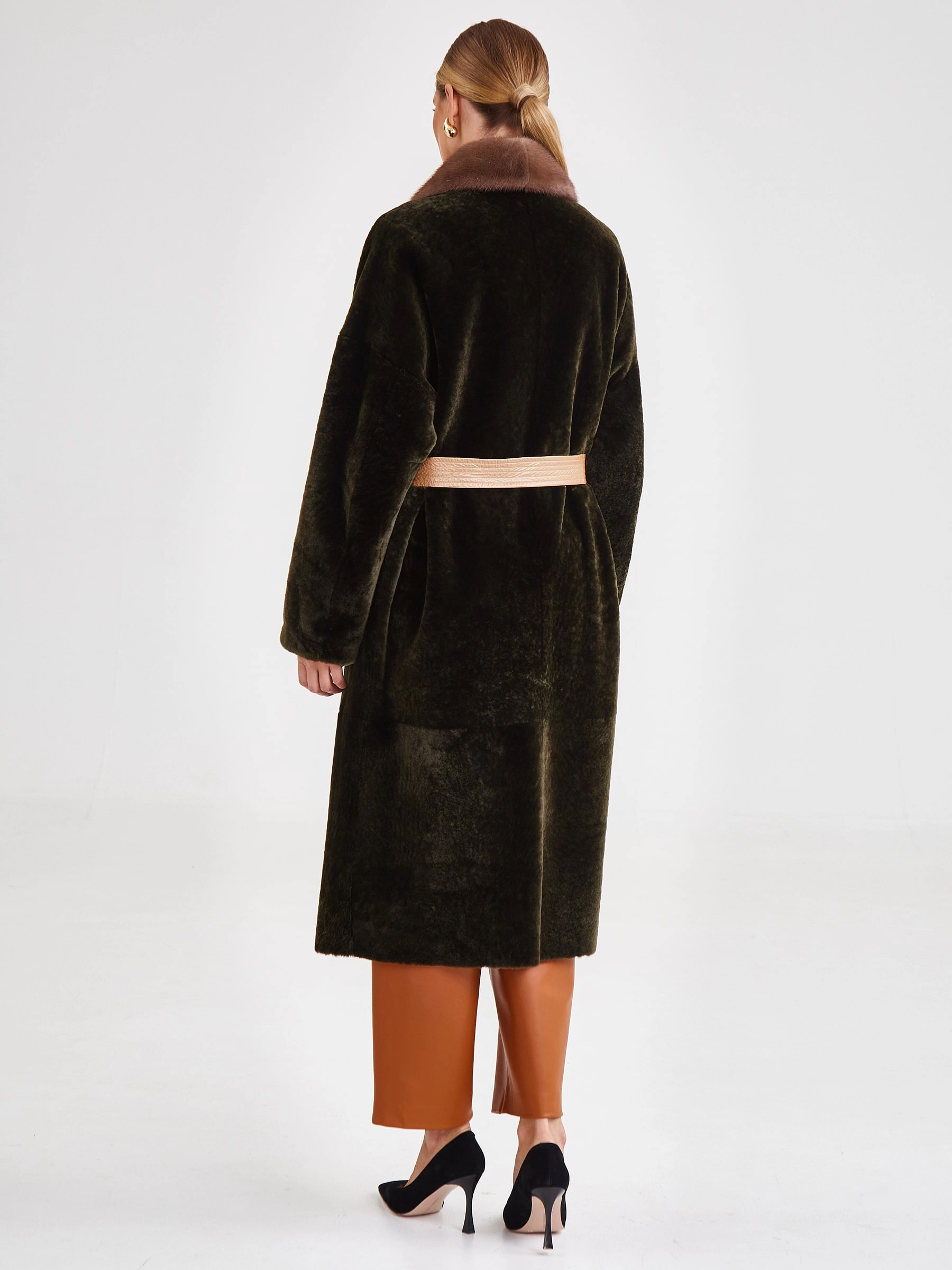 Двубортная двусторонняя шуба из овчины «астраган» и меха норки премиум-класса представляет собой превосходный пример актуальной классики. Эта удлинённая модель (свыше 90 см) прямого кроя со спущенными плечами и широкими лацканами сшита из мягкой плотной овчины: одна сторона — гладкая кожа, а другая — тёплый густой мех. Благодаря особой обработке швов изделие легко трансформируется в элегантную шубу. Застёжка на пуговицы, английский воротник из норки и контрастный пояс из натуральной кожи завершают образ, делая эту шубу универсальным и роскошным выбором для повседневной носки осенью и зимой. Совет стилиста: носите её как лаконичное пальто с джинсами скинни и грубыми ботинками для дерзкого образа в стиле кэжуал или наденьте поверх вечернего платья, добавив лоска любому выходу.