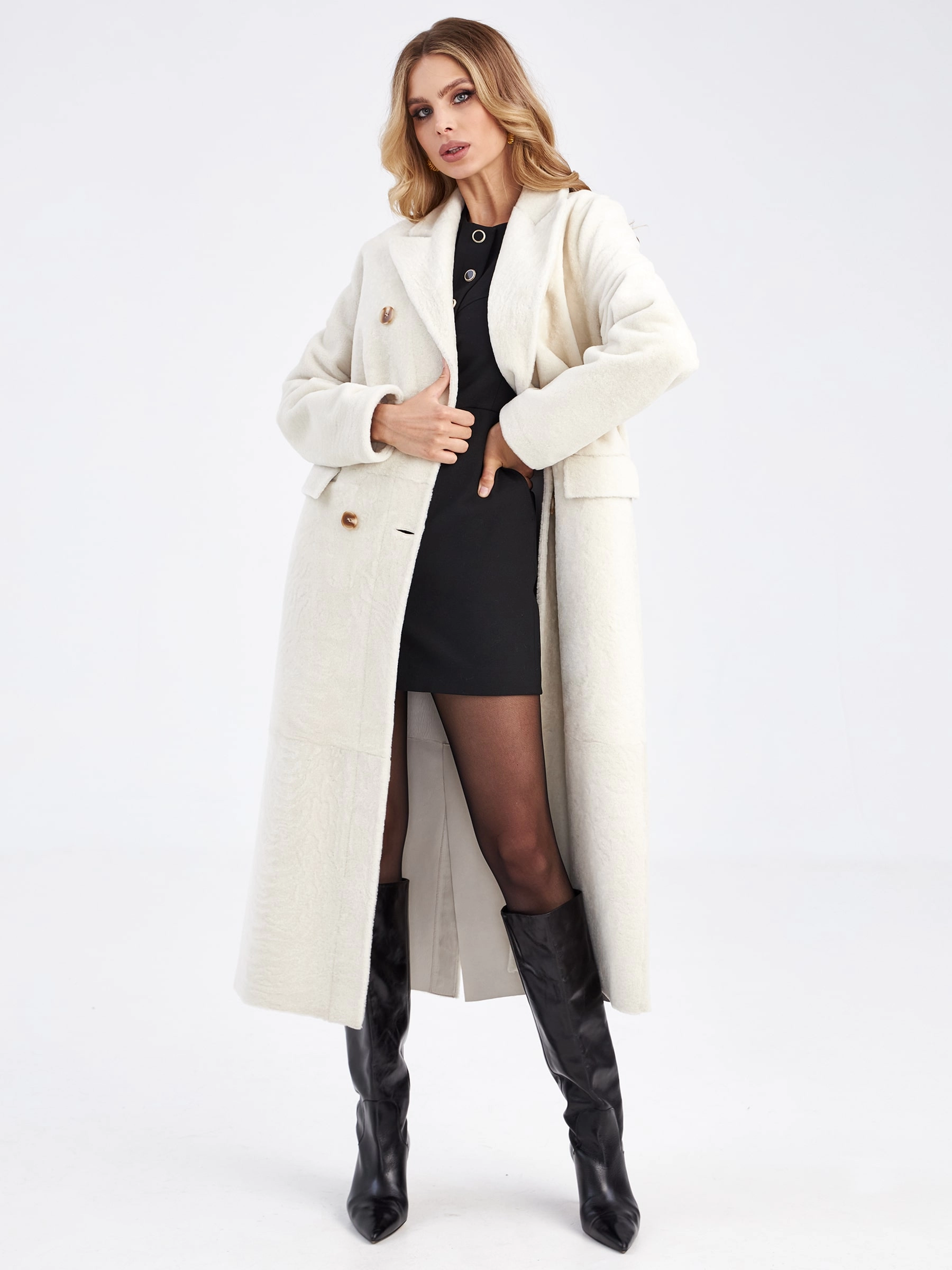 Двубортная женская длинная шуба из астрагана премиум класса 2047, белая, размер 48, артикул 13730