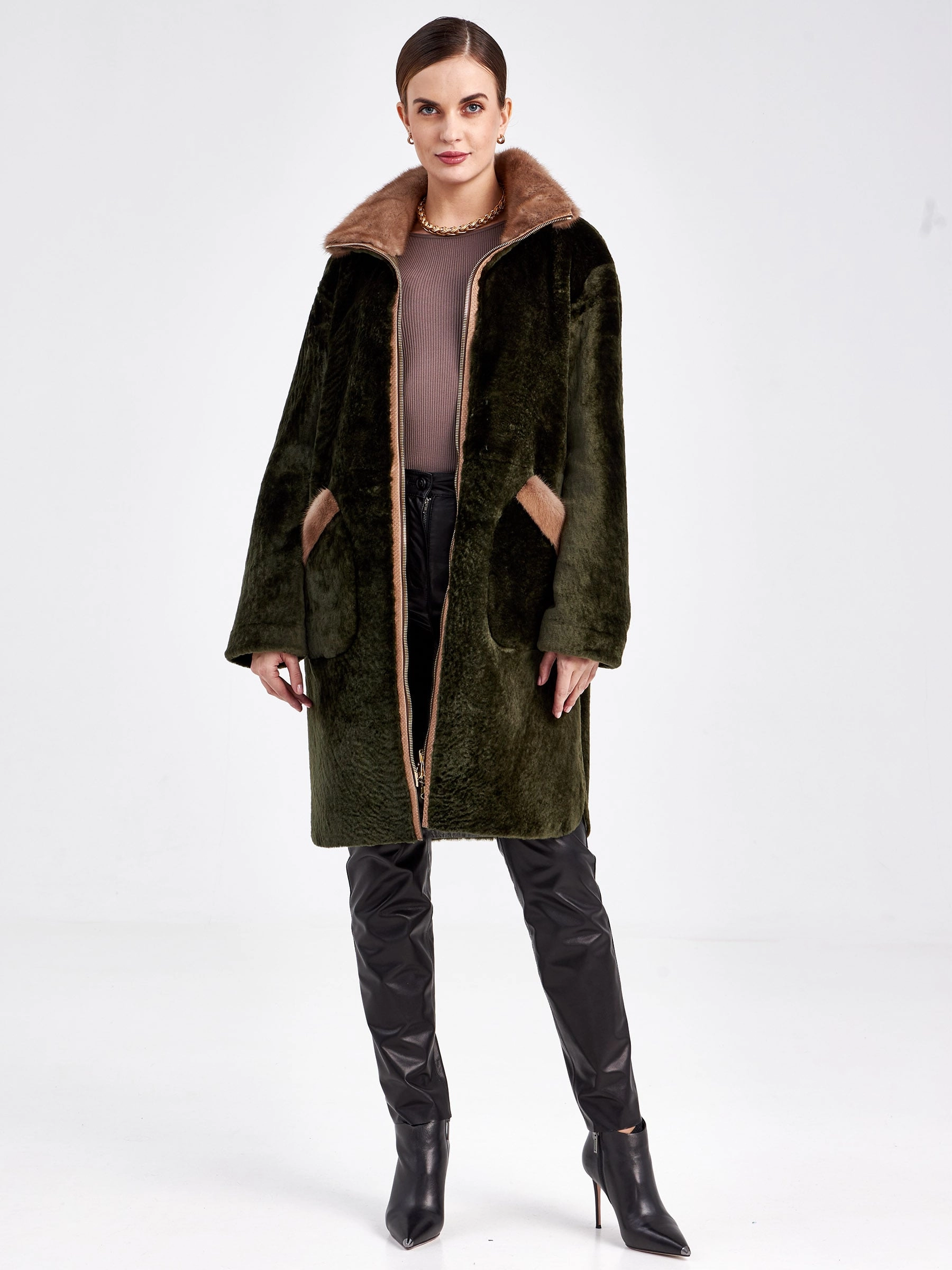 Женская двусторонняя шуба из овчины «астраган» с мехом норки премиум-класса — это идеальный сплав стиля и практичности. Модель создана для тех, кто ценит комфорт и функциональность. Удлинённый (свыше 90 см) прямой крой со спущенными плечами обеспечивает расслабленную посадку и универсальность. Изделие выполнено из нежной стриженой овчины: с одной стороны — гладкая кожа, с другой — плотный тёплый мех. Благодаря особой обработке швов шубу можно легко трансформировать в двустороннюю модель. Пальто застёгивается на двухзамковую молнию и дополнена высоким воротником-стойкой из густой норки для дополнительной защиты от холода. Декоративные элементы — кожаный кант и меховая отделка на больших накладных карманах — подчёркивают аккуратный дизайн. Это идеальный вариант для повседневной носки в холодное время года. Совет стилиста: наденьте её как двустороннее пальто с прямыми джинсами и высокими сапогами для стильного городского лука или носите как классическую шубу с платьем-миди и лакированными лодочками для элегантно