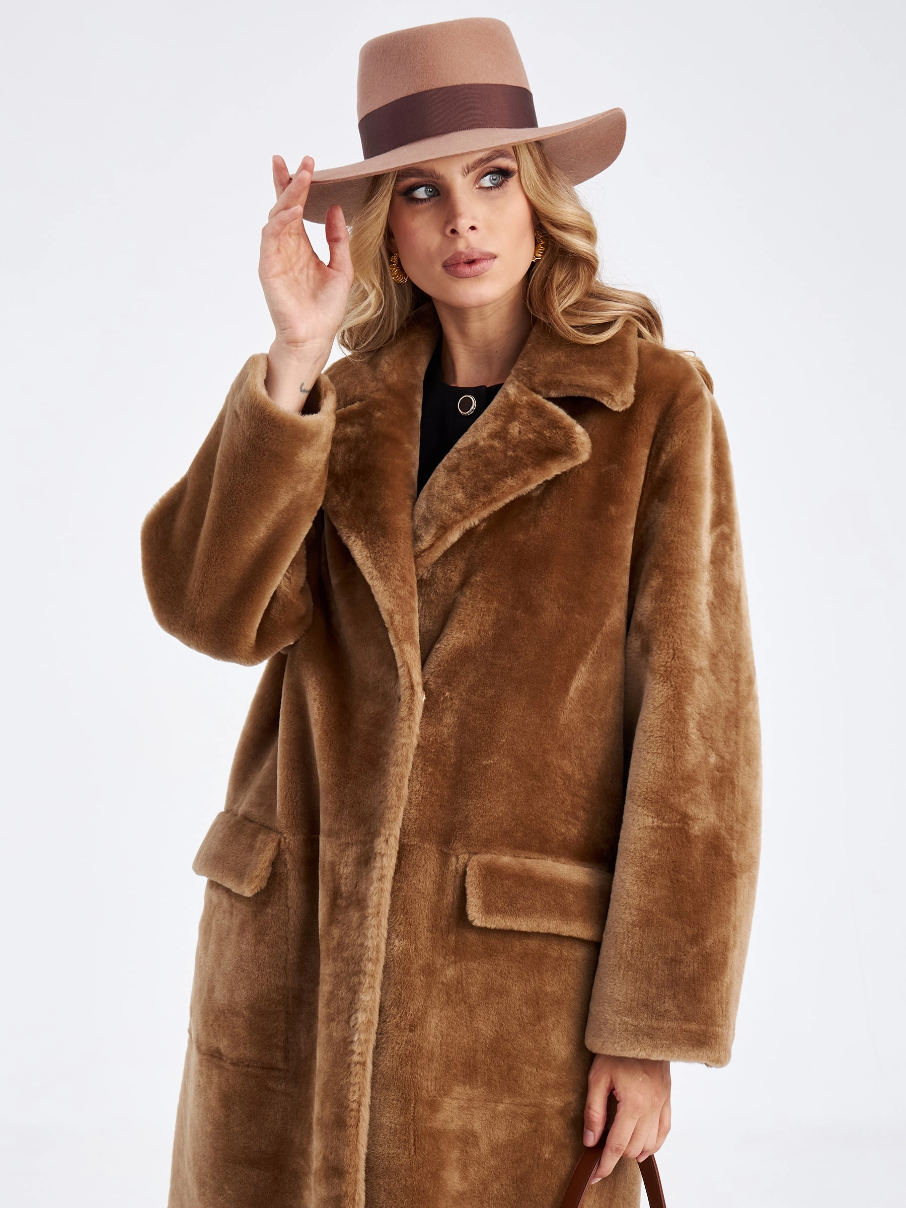 Шуба из овчины прямого кроя с английским воротником. Застежка-кнопки. Модель дополнили двумя большими карманами. Просто и элегантно. Длинный кожаный пояс сформирует приталенный силуэт.