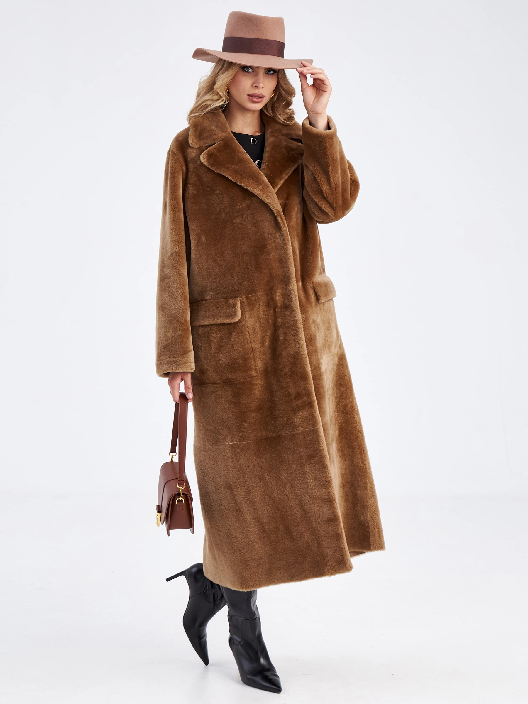 Товар женская двусторонняя шуба из меховой овчины премиум класса 2030, коричневая, размер 44, артикул 13720 выполнен из овчина "мерино" с застежкой кнопки. Рассчитан на сезон: осень-зима. Длина изделия 125 см, силуэт прямой.