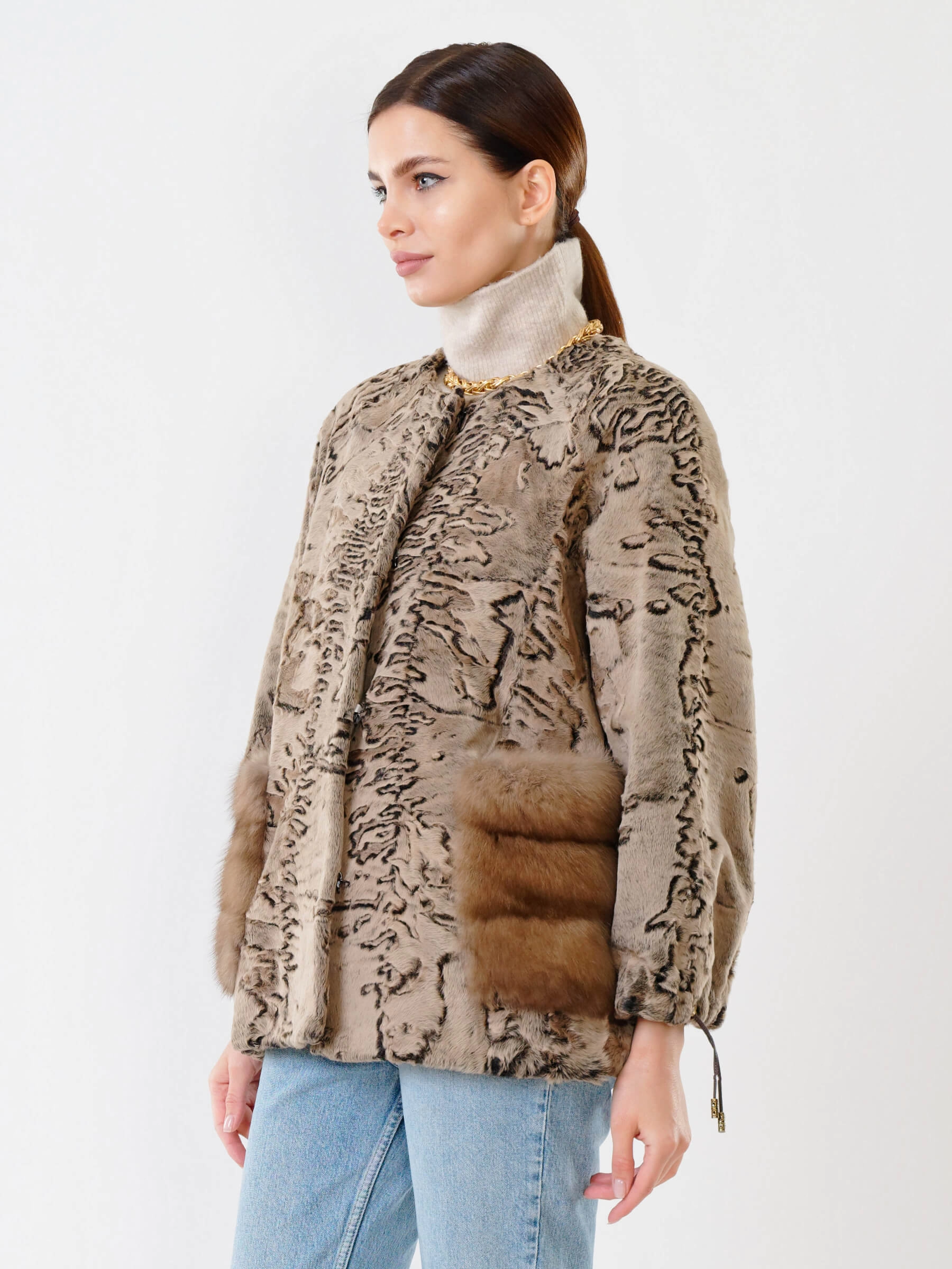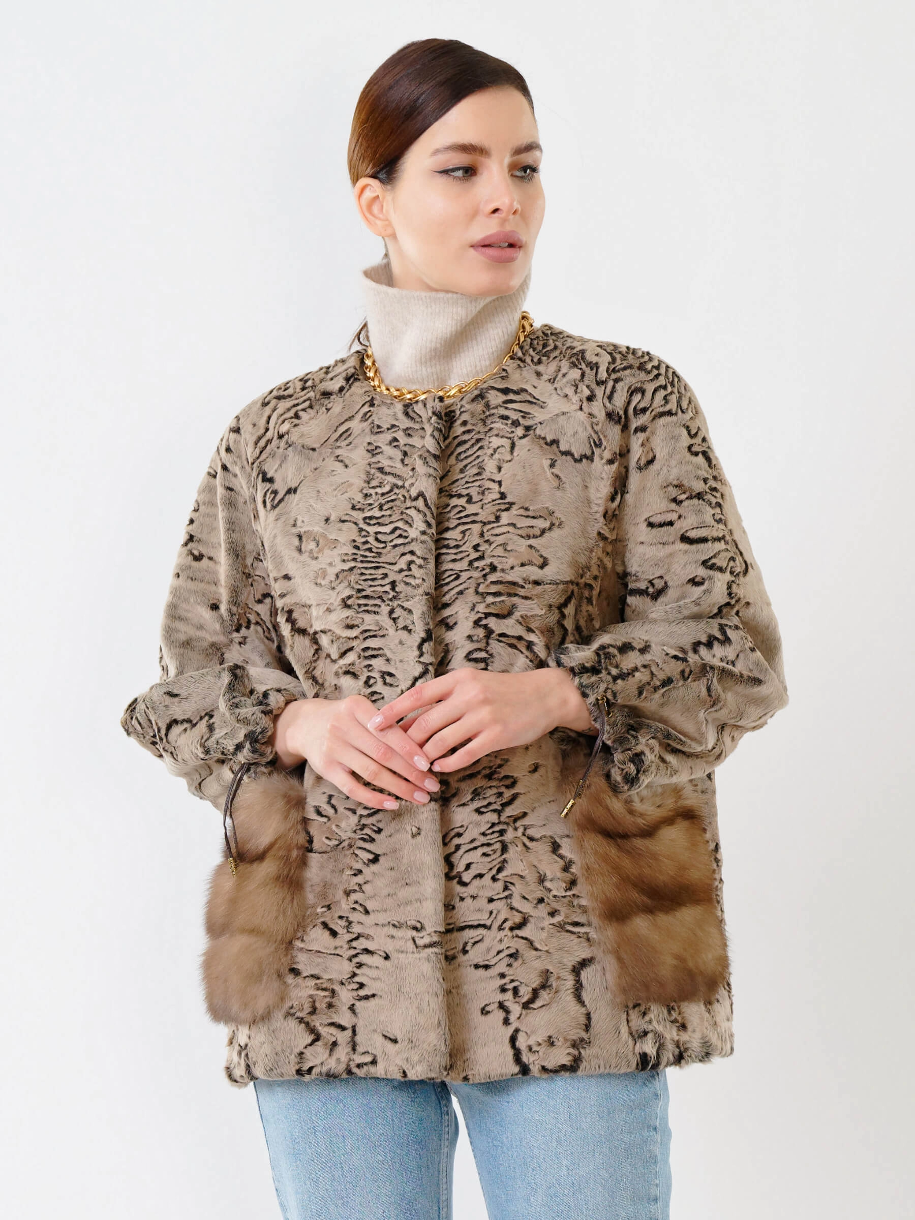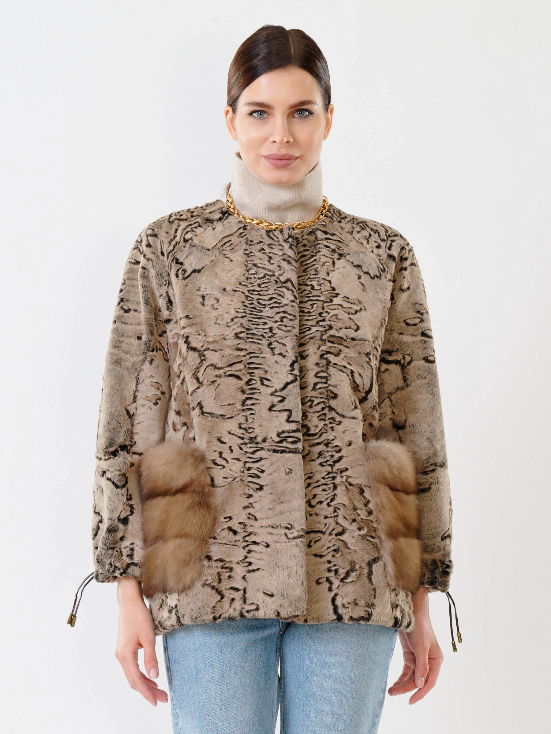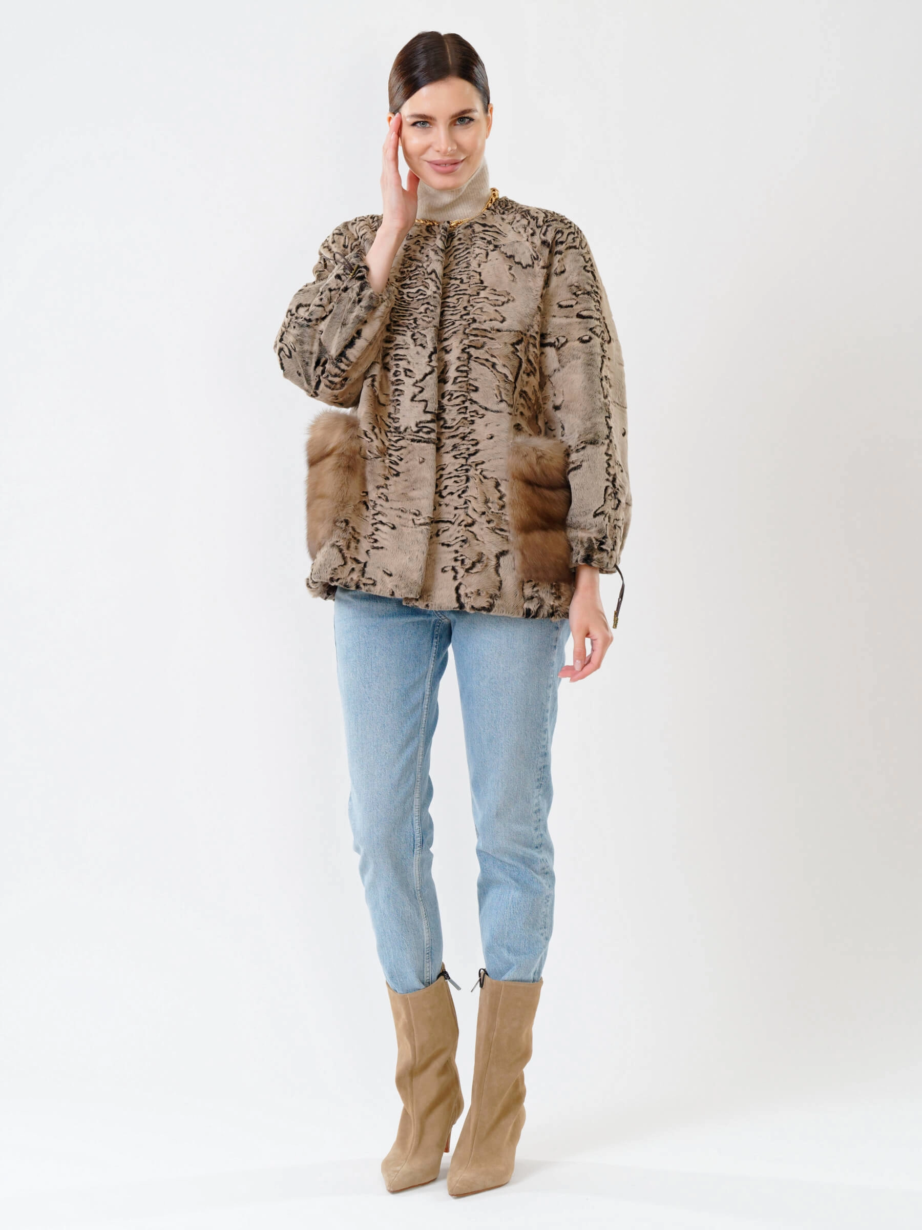 Роскошная короткая шуба длиной 65 см с тугой плоской завивкой каракуля и накладными карманами из нежной норки: прямой силуэт с рукавом реглан и застёжкой на клипсах создаёт элегантный образ без воротника, подчёркивая безупречный подбор шкурок по оттенку. Совет стилиста: сочетайте с кожаными брюками и лаковыми сапогами для вечернего выхода или с джинсами-скинни и кашемировым свитером для повседневной элегантности — эта куртка премиум-уровня станет жемчужиной вашего гардероба.