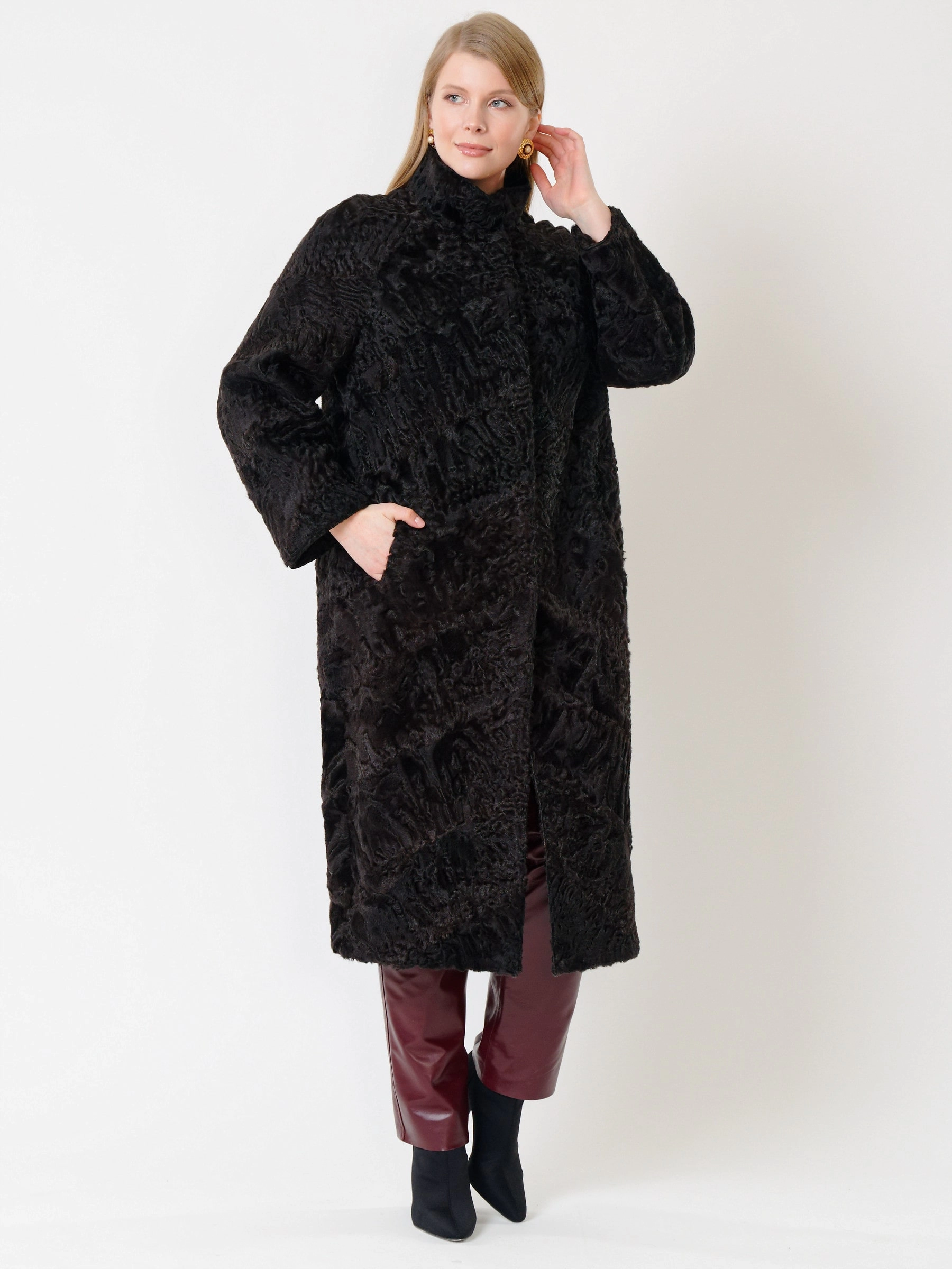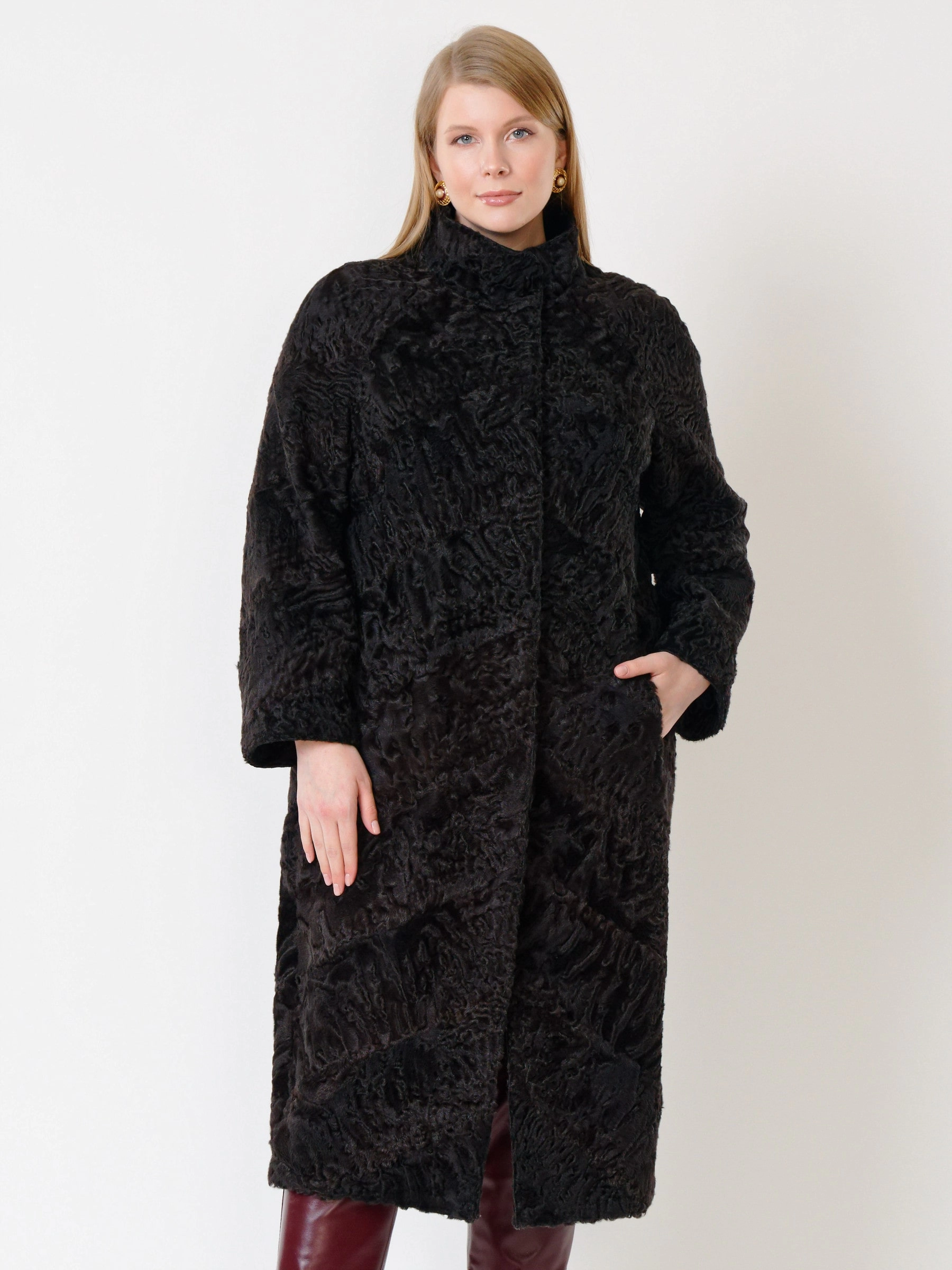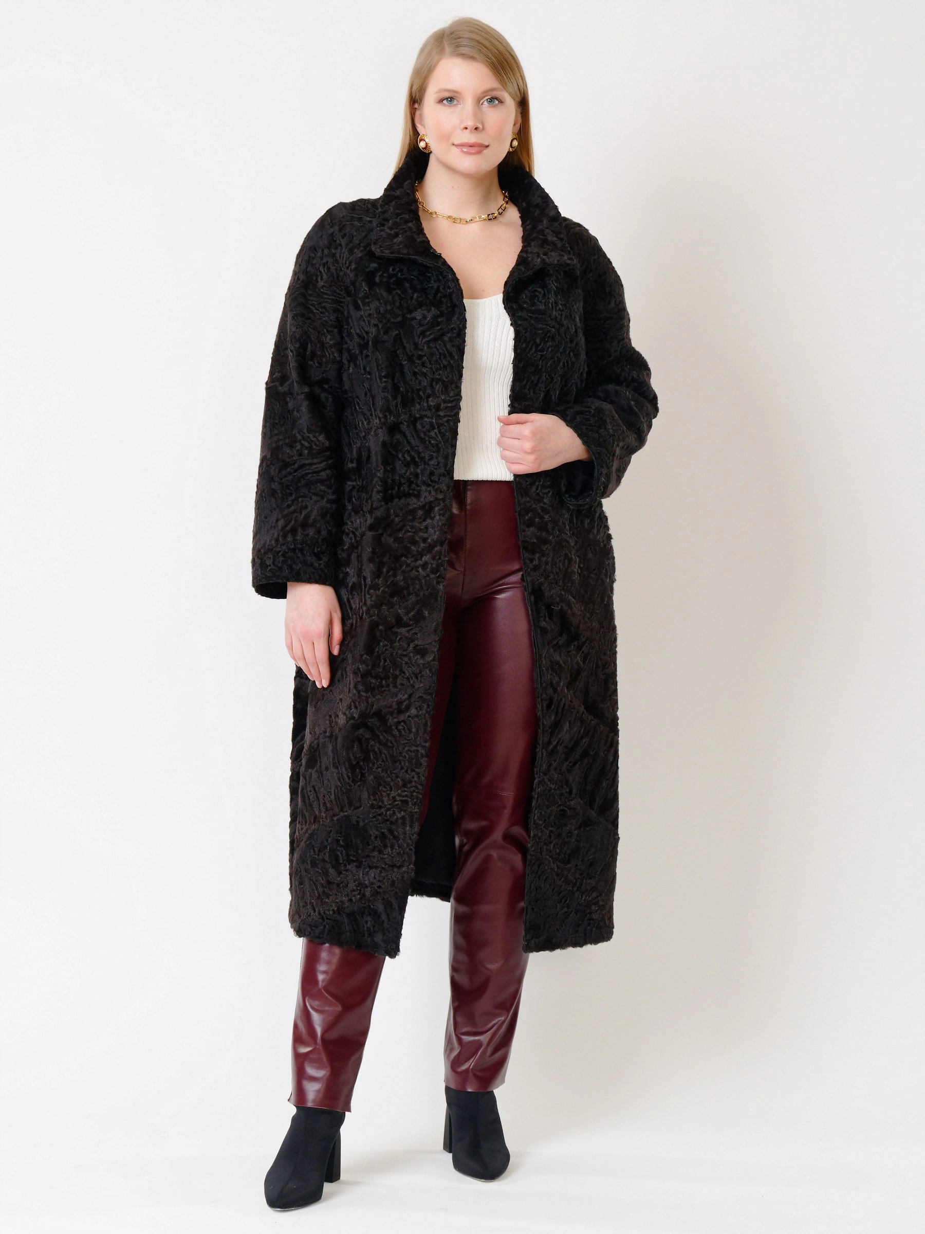 Длинная шуба из меха каракуля женская 17101, коричневая, размер 44, артикул 22700