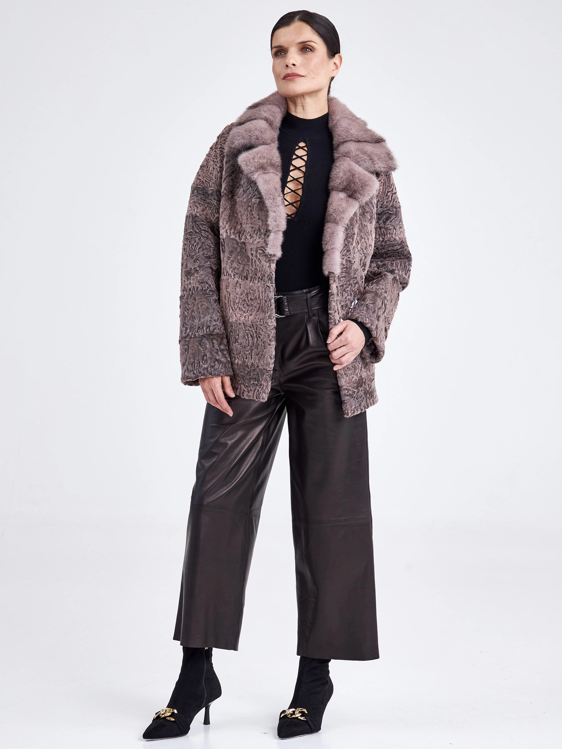 Короткая шуба из нежного каракуля, выполненная в сдержанном прямом крое, представляет собой идеальный баланс между элегантностью и современностью. Её главная изюминка — уникальный муаровый рисунок натурального меха, играющий на свету, который гармонично сочетается с объемным воротником из густой норки в нежных розовых оттенках. Длина от 51 до 74 см, заканчивающаяся на линии бёдер, создаёт динамичный и женственный силуэт, а классический рукав реглан обеспечивает дополнительную свободу и комфорт. Совет стилиста: эта модель станет ключевой вещью в вашем гардеробе — наденьте её с облегающими кожаными брюками или плиссированной миди-юбкой и высокими сапогами, чтобы подчеркнуть линию талии и визуально вытянуть пропорции, добавив образу лёгкой дерзости и безупречной элегантности.
