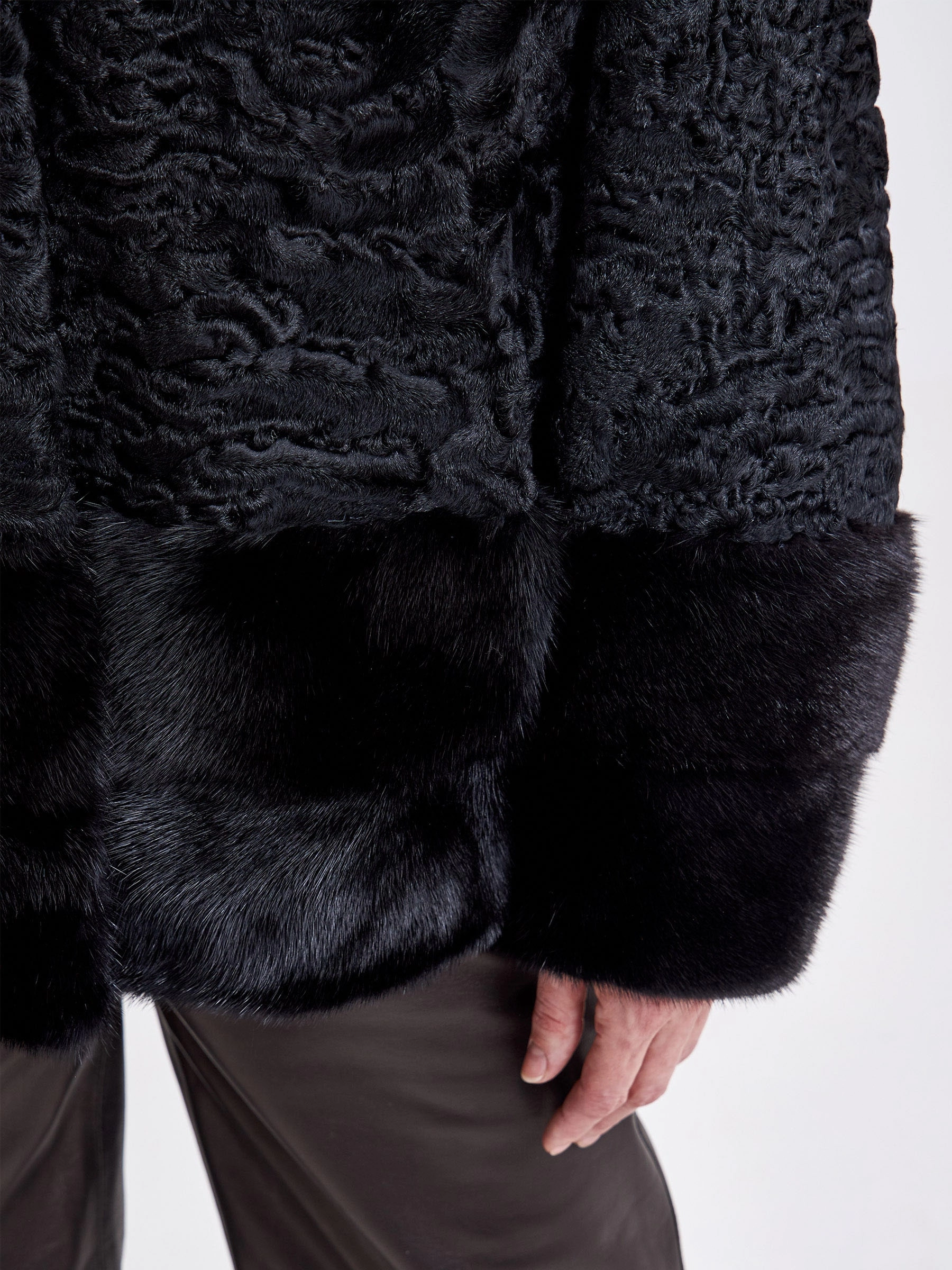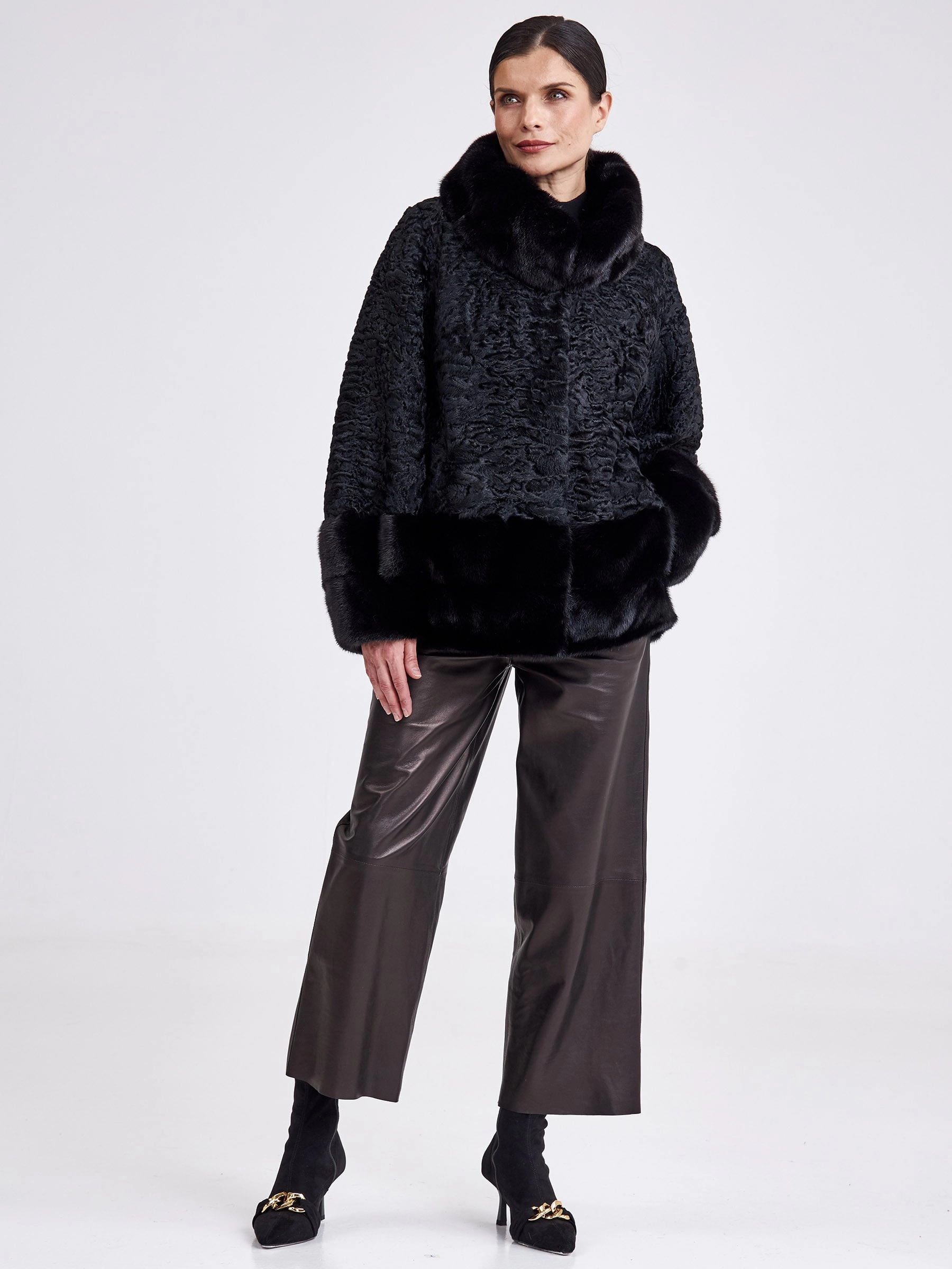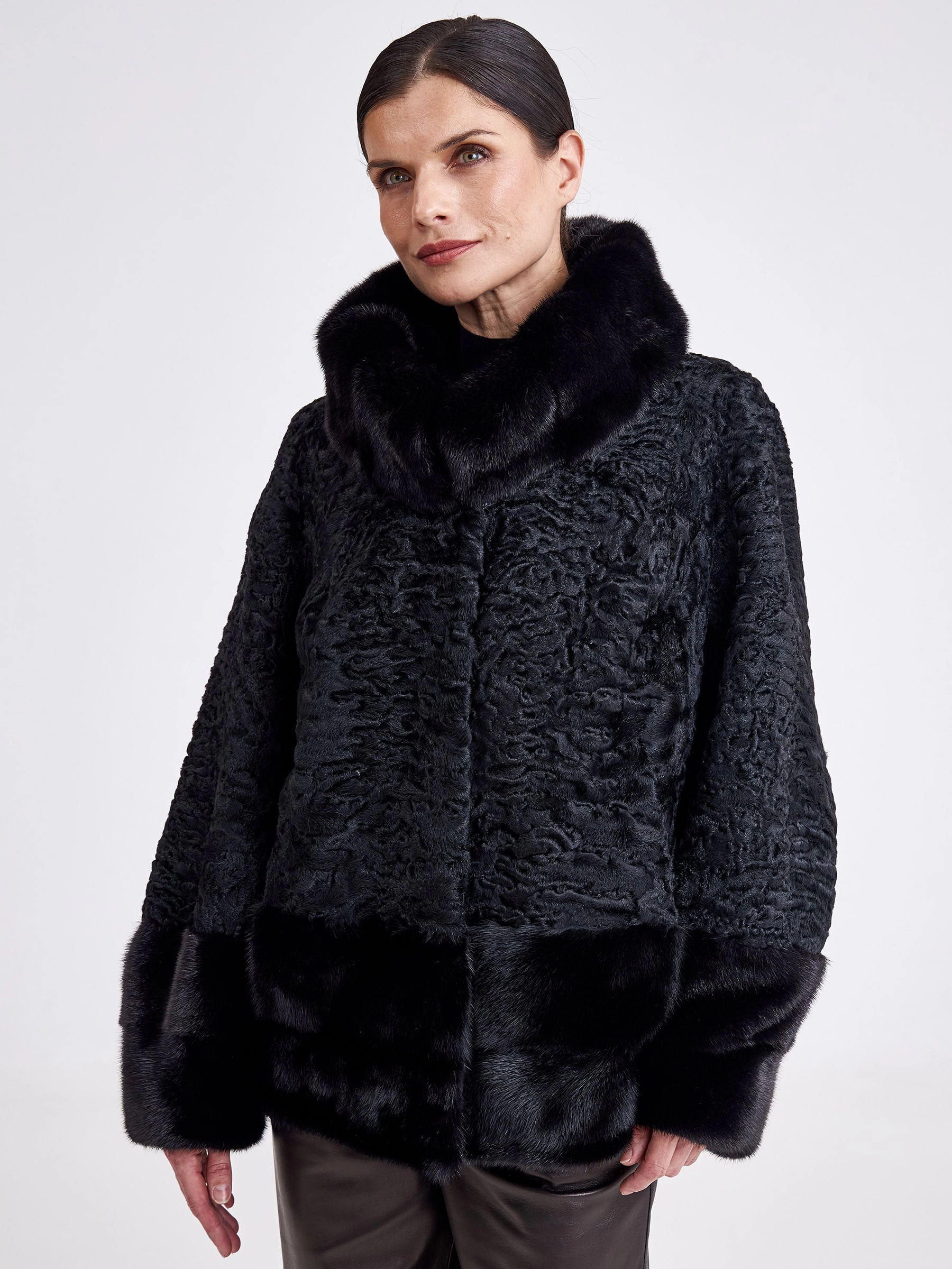 Представляем женскую шубу из меха каракуля, где классическая элегантность встречается с современным кроем. Модель прямого силуэта средней длины (75-90 см) выполнена из благородного каракуля с выразительным муаровым рисунком и дополнена роскошными деталями из чёрной норки: воротником-апаш, манжетами и отделкой низа. Глубокий чёрный цвет меха создаёт монолитный, строгий образ, а втачной рукав подчёркивает аккуратный, утончённый силуэт. Совет стилиста: эта шуба — идеальная база для создания образа сдержанной роскоши. Её универсальная длина и классический вид позволяют сочетать её как с кожаными брюками и ботфортами для дневного выхода, так и с вечерним платьем миди и лаконичными лодочками. Ключ к образу — игра на контрасте текстур: гладкая кожа или шёлк подчеркнут богатство и фактурность благородного меха.