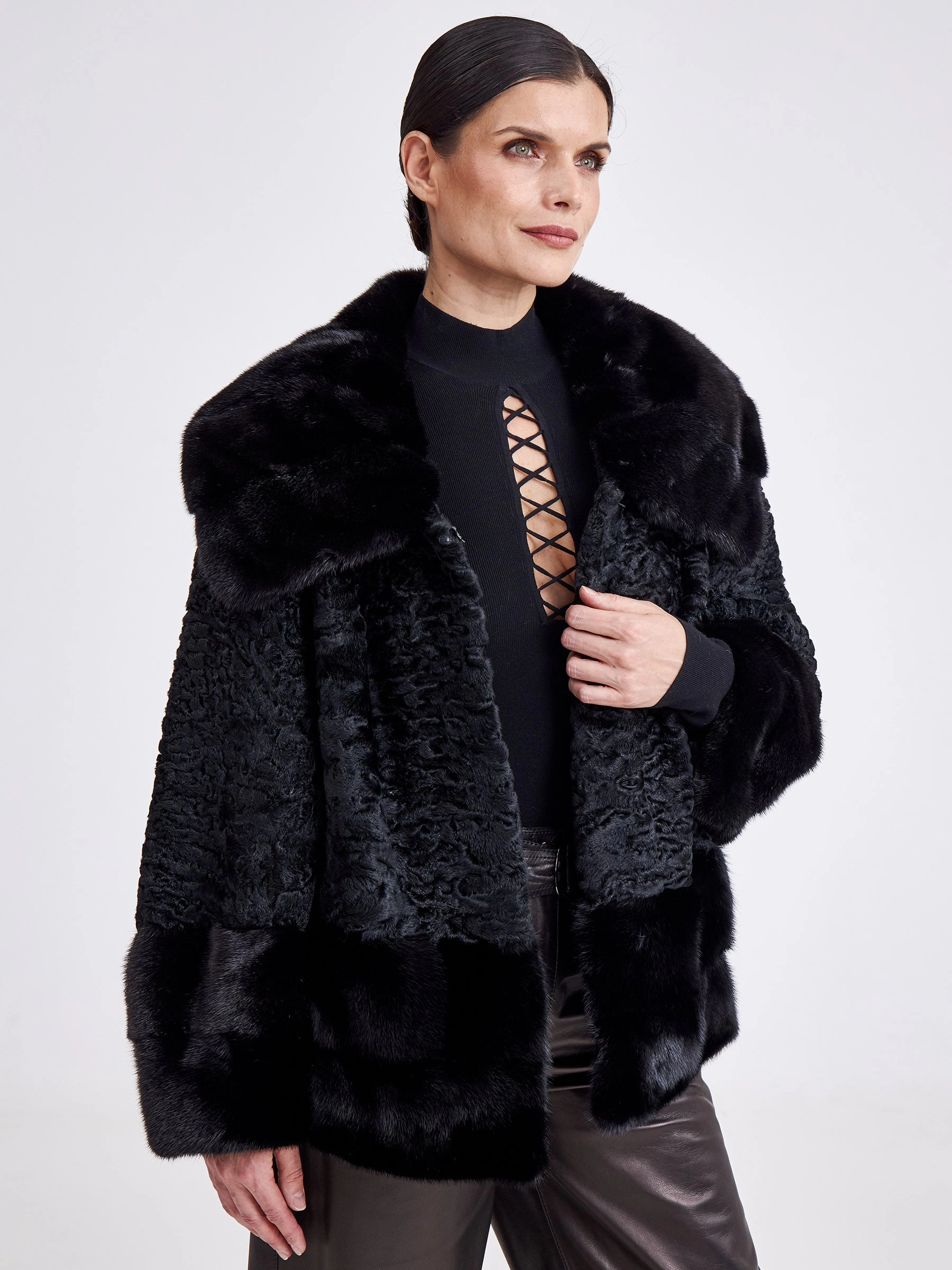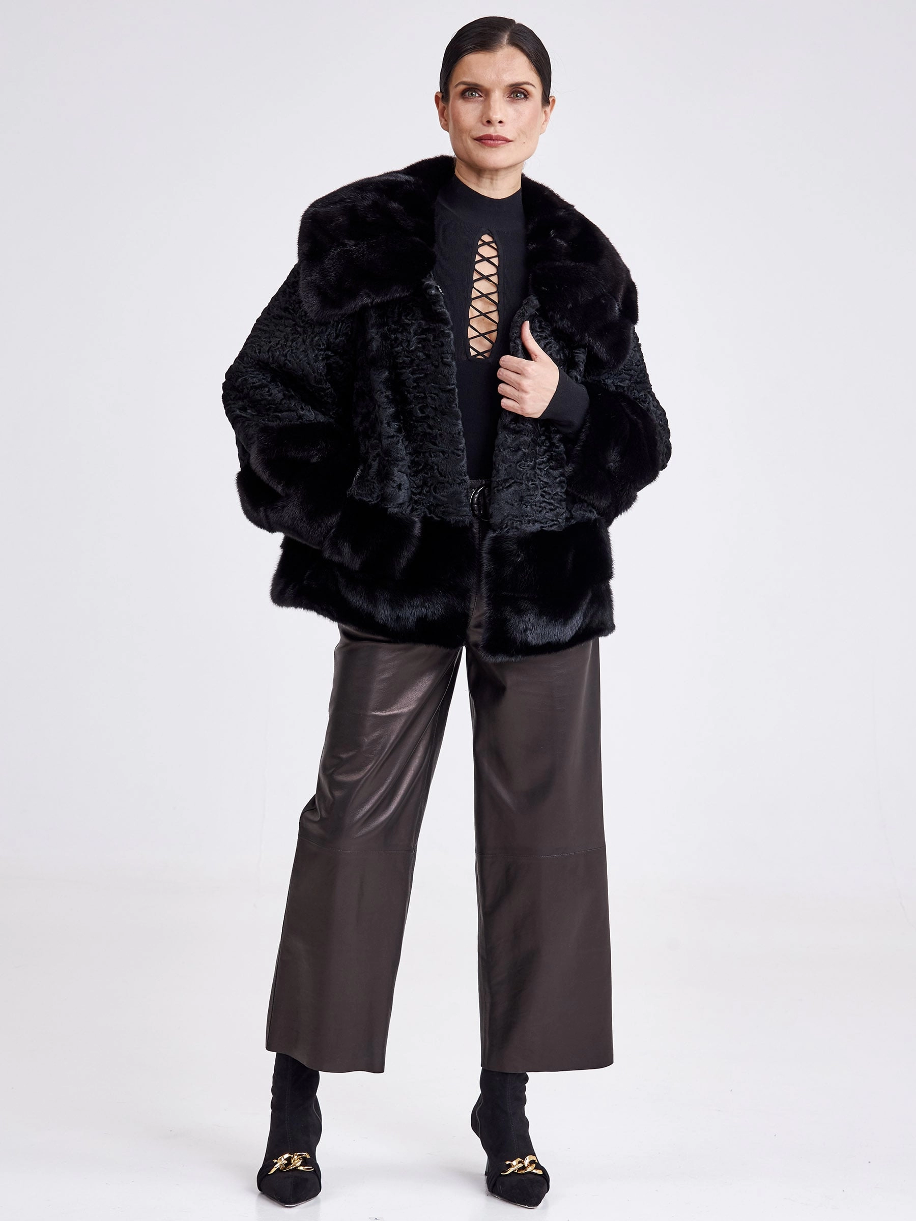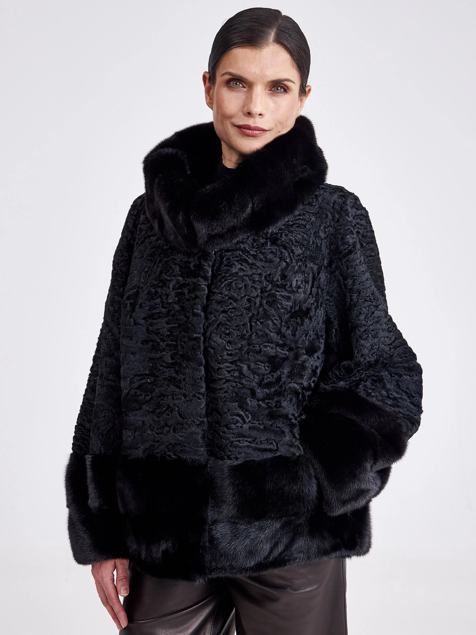 Представляем женскую шубу из меха каракуля, где классическая элегантность встречается с современным кроем. Модель прямого силуэта средней длины (75-90 см) выполнена из благородного каракуля с выразительным муаровым рисунком и дополнена роскошными деталями из чёрной норки: воротником-апаш, манжетами и отделкой низа. Глубокий чёрный цвет меха создаёт монолитный, строгий образ, а втачной рукав подчёркивает аккуратный, утончённый силуэт. Совет стилиста: эта шуба — идеальная база для создания образа сдержанной роскоши. Её универсальная длина и классический вид позволяют сочетать её как с кожаными брюками и ботфортами для дневного выхода, так и с вечерним платьем миди и лаконичными лодочками. Ключ к образу — игра на контрасте текстур: гладкая кожа или шёлк подчеркнут богатство и фактурность благородного меха.