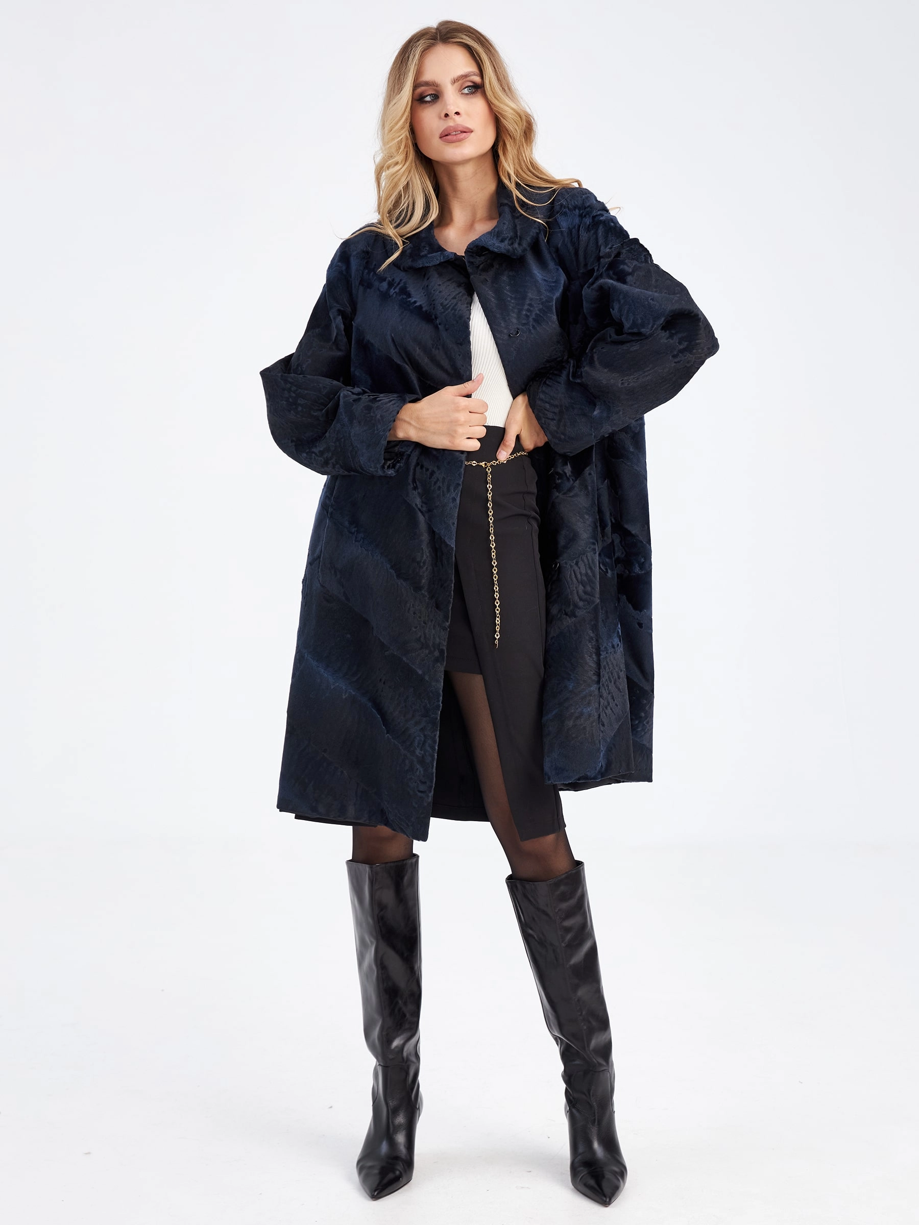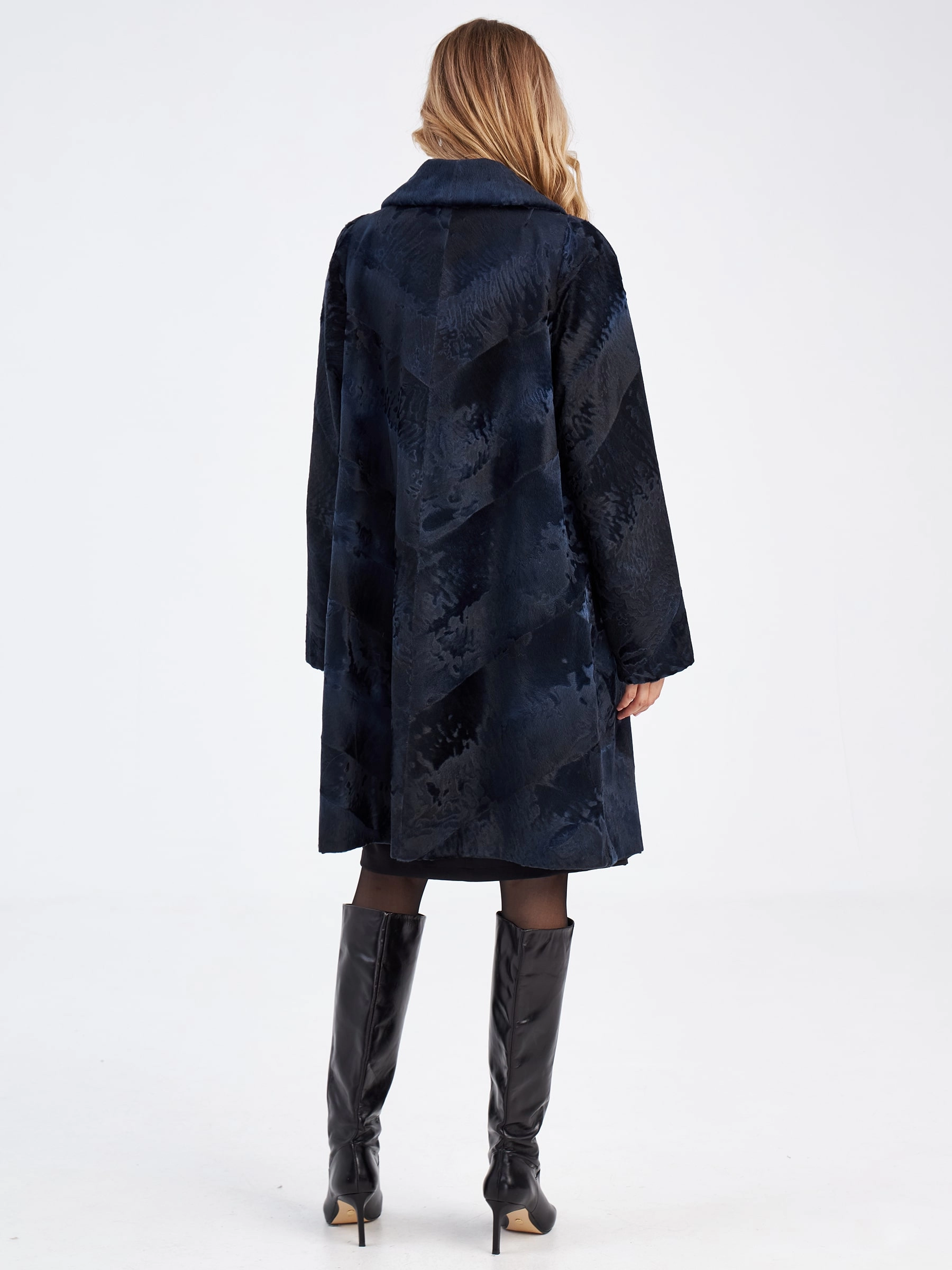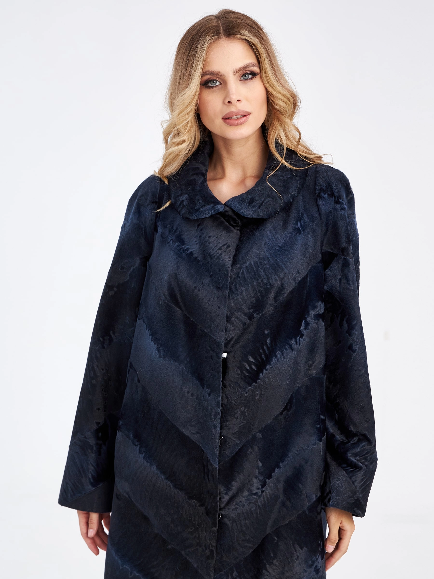 Товар шуба из меха каракуля женская елизавета-д(в), синяя, размер 56, артикул 33770 выполнен из каракульча с застежкой клипсы. Рассчитан на сезон: осень-зима. Длина изделия 117 см, силуэт расклешенный.