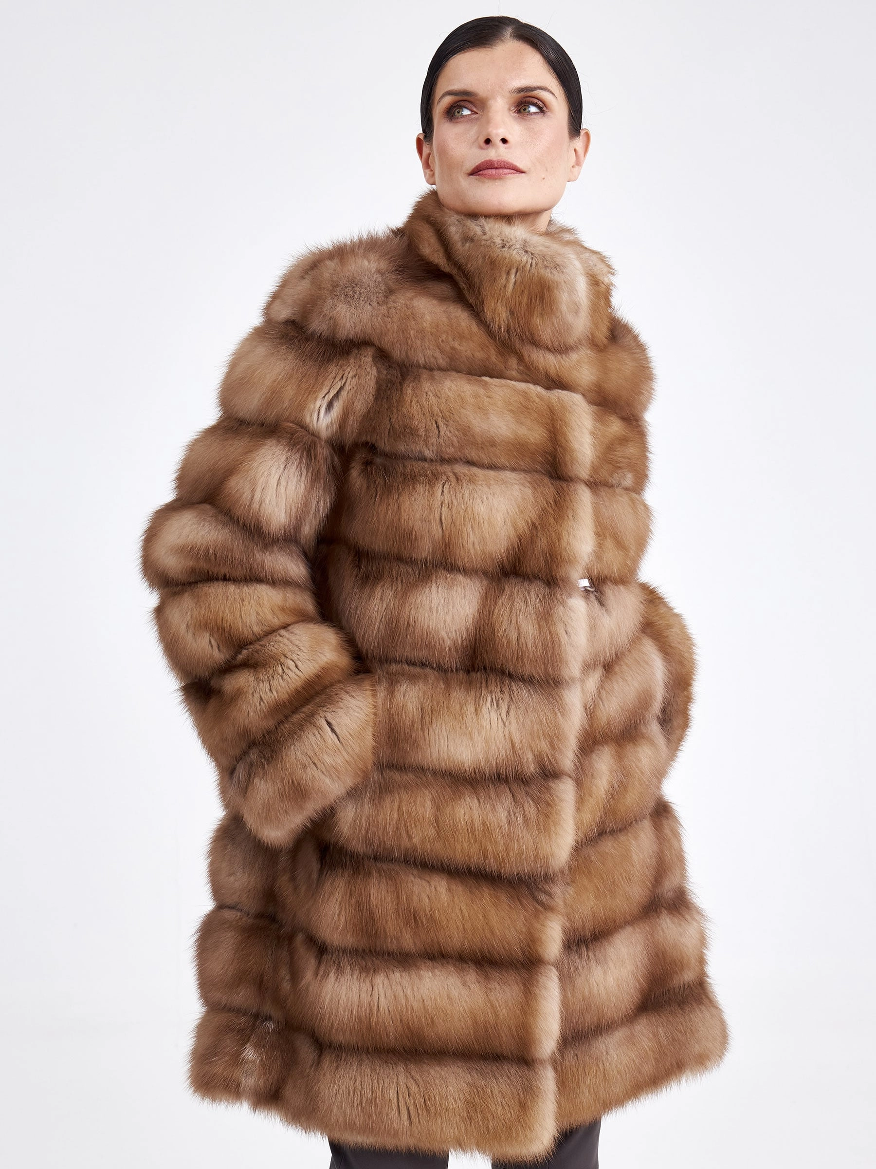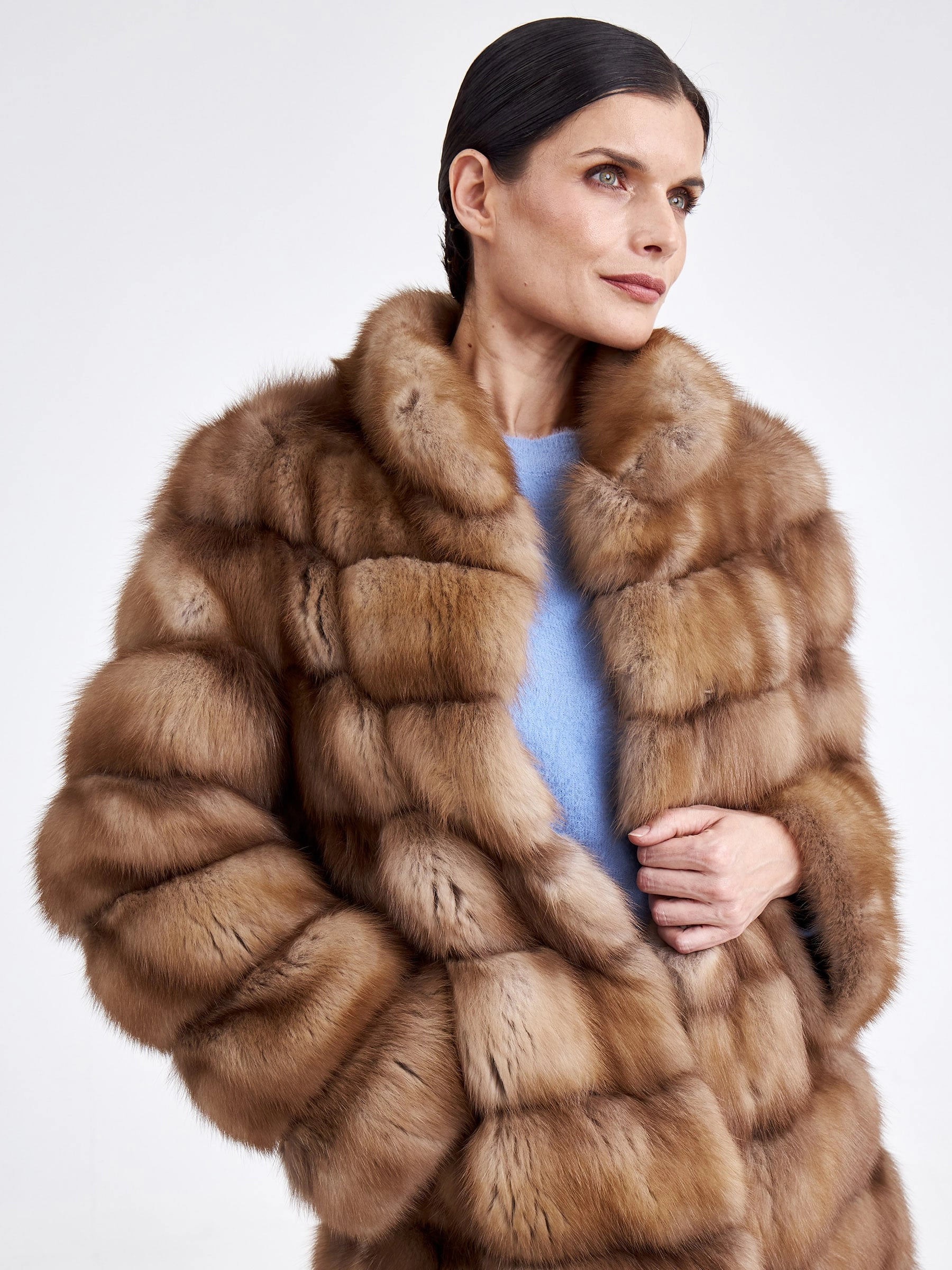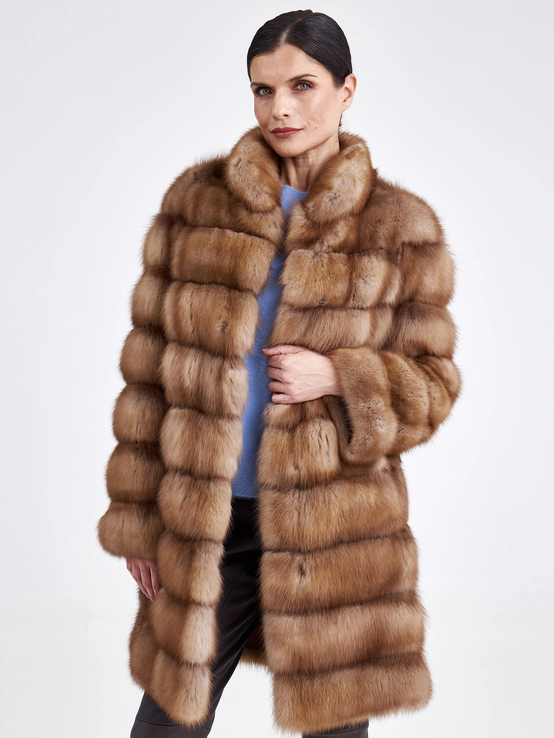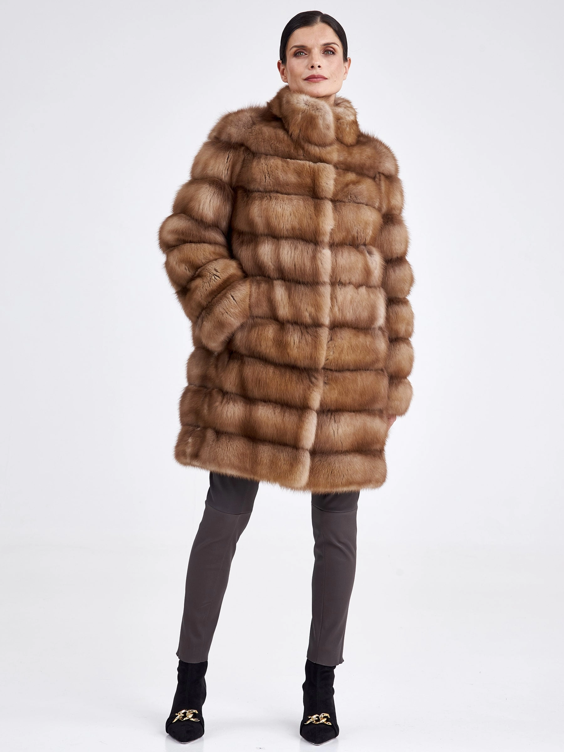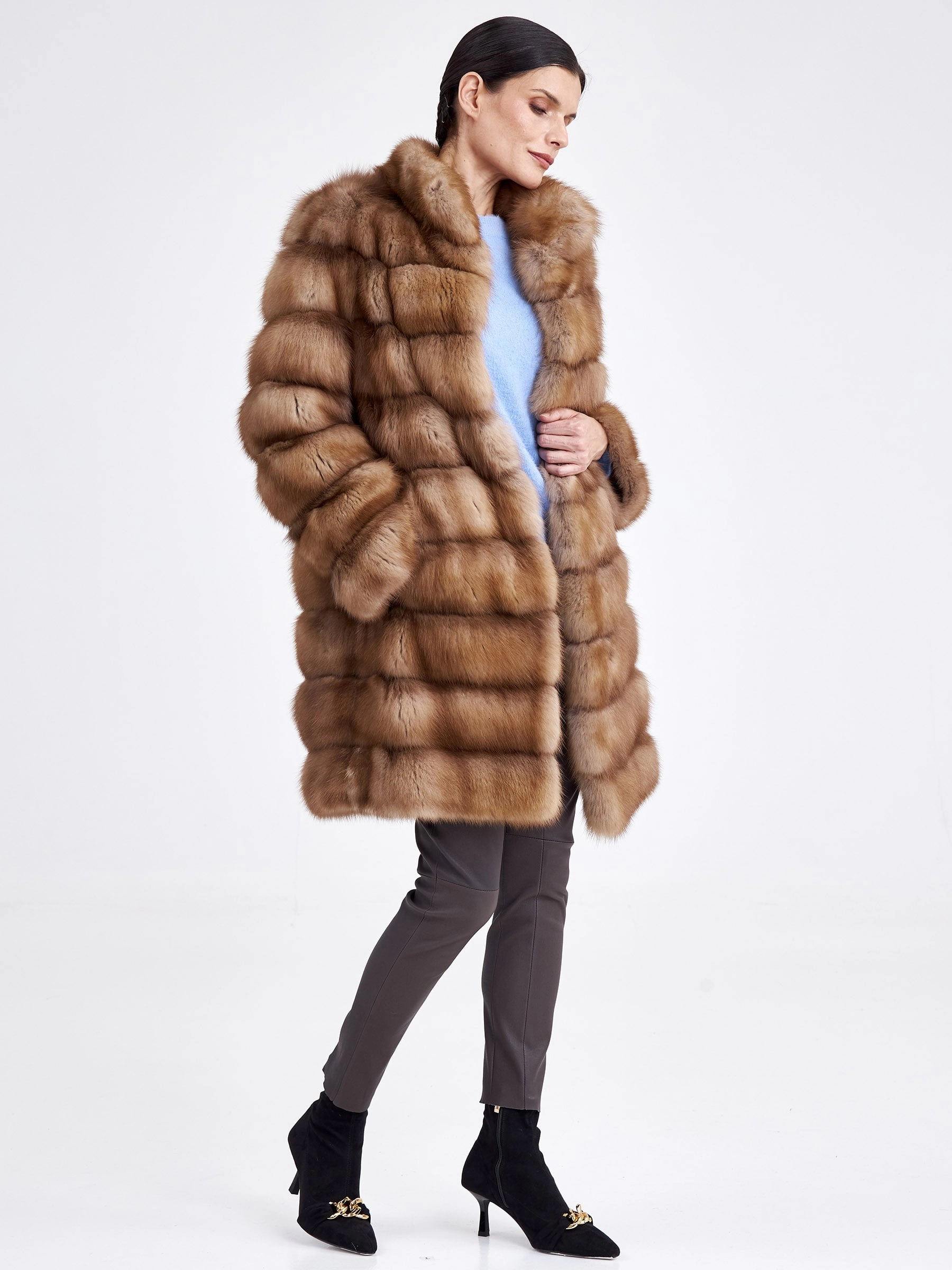 Женская шуба-полупальто из меха куницы премиум-класса — это воплощение элегантности и классического стиля. Модель прямого кроя и полноценной длины (свыше 90 см) выполнена из отборного меха куницы с горизонтальной выкладкой, что подчеркивает безупречный рисунок и благородство материала. Главные достоинства куницы — невероятно плотный густой подшерсток, мягкий и шелковистый на ощупь, — обеспечивают исключительную способность сохранять тепло, оставаясь при этом лёгкой и комфортной в носке. Лаконичный дизайн с воротником-стойкой, втачным рукавом и застёжкой на клипсах без лишней отделки делает эту вещь универсальной и вневременной. Совет стилиста: классический прямой силуэт и богатый вид натурального меха создают идеальную основу для элегантного лука; сочетайте полупальто с высокими сапогами и плотными колготками, кожаными перчатками и структурной сумкой, чтобы подчеркнуть статусность образа, или же набросьте его поверх тонкого свитера-джемпера и брюк карго для современной трактовки luxury-casual.