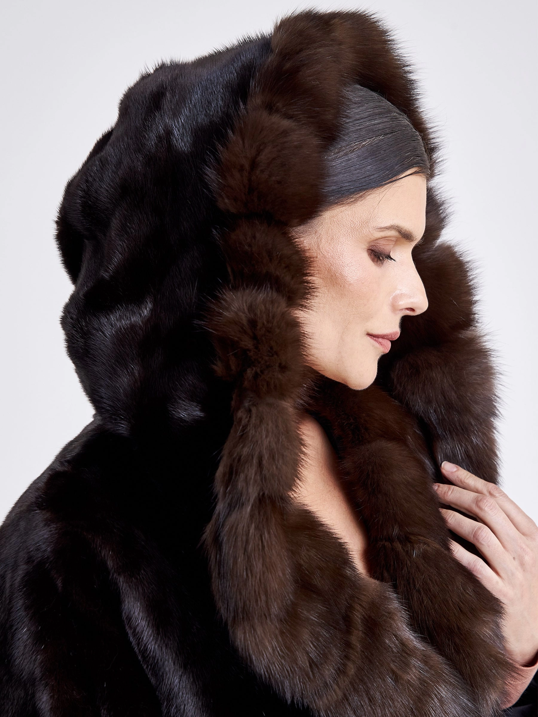 Шуба из меха норки с капюшоном женская 17231(кс), длинная, с отделкой капюшона из меха соболя, черная, размер 44, артикул 33280