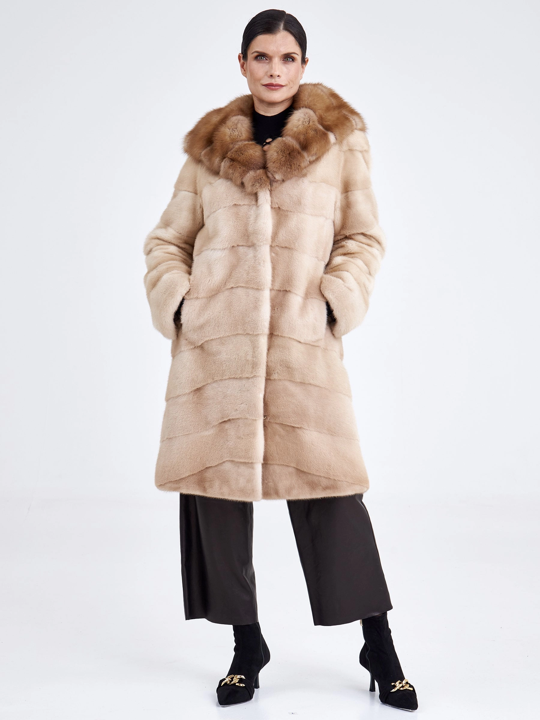 Товар шуба из меха норки с отделкой капюшона из меха куницы для женщин 2а(кк), бежевая, размер 46, артикул 33240 выполнен из норка крашенной с застежкой клипсы. Рассчитан на сезон: зима. Длина изделия свыше 90 см, силуэт прямой.
