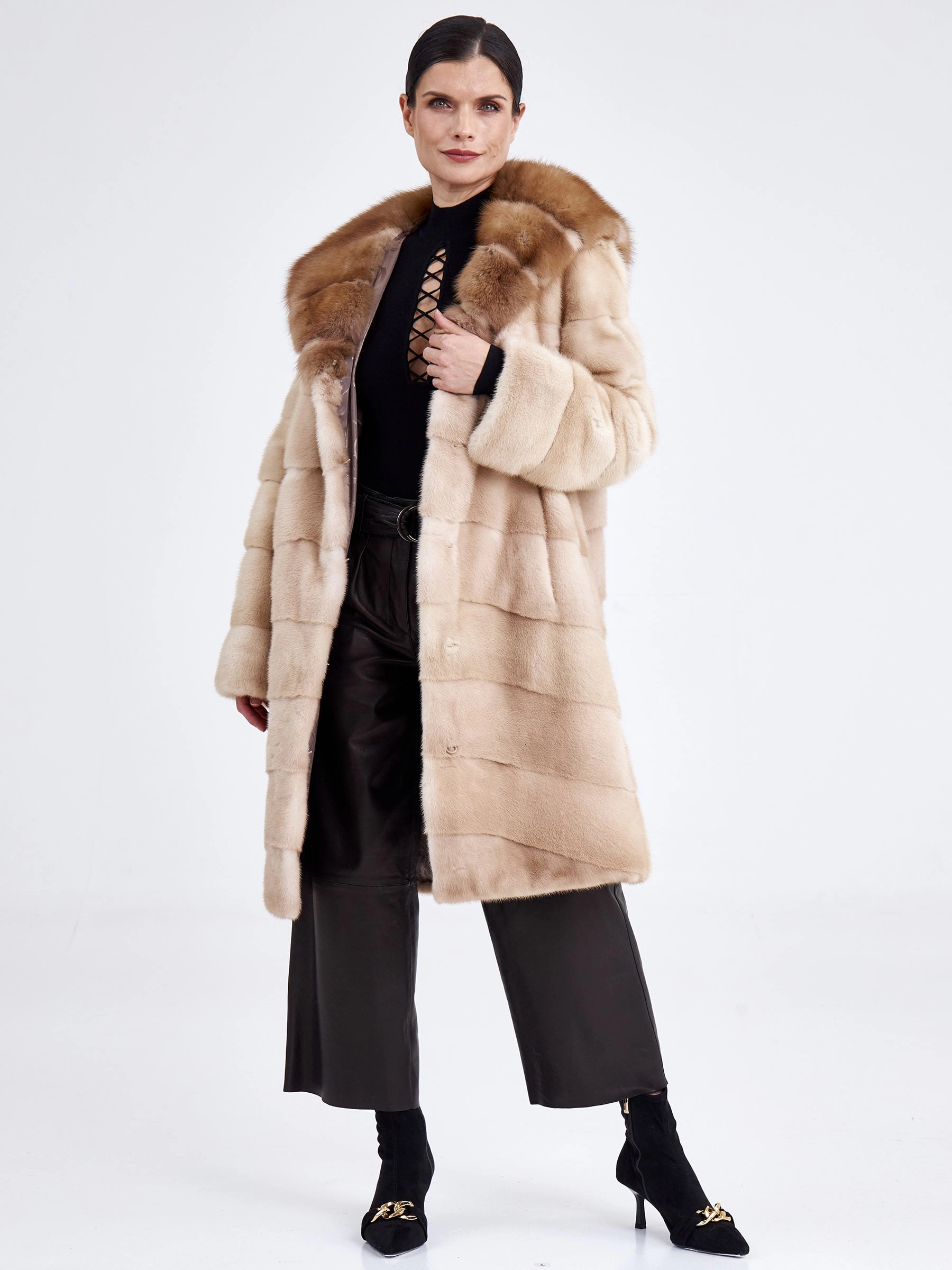 Женская шуба из светло-коричневой норки с отделкой капюшона из куницы — это идеальное сочетание повседневного комфорта и утончённой эстетики. Модель прямого кроя выполнена из нежной низковорсовой норки с поперечной выкладкой меха, а её выразительным акцентом стал глубокий объёмный капюшон, декорированный шелковистым мехом куницы. Втачной рукав, застёжка на клипсах и подкладка из 100% вискозы обеспечивают удобство и тепло даже в самую суровую зиму. Совет стилиста: мягкая нейтральная гамма и чистые линии делают эту шубу невероятно универсальной — наденьте её поверх плотных джинсов и свитера оверсайз для повседневного casual-образа или сочетайте с однотонным платьем-миди и высокими сапогами, чтобы подчеркнуть женственный силуэт и благородную текстуру меха.