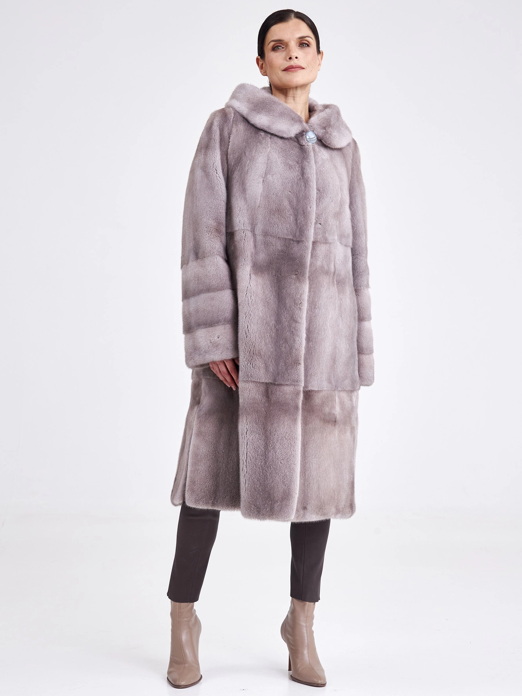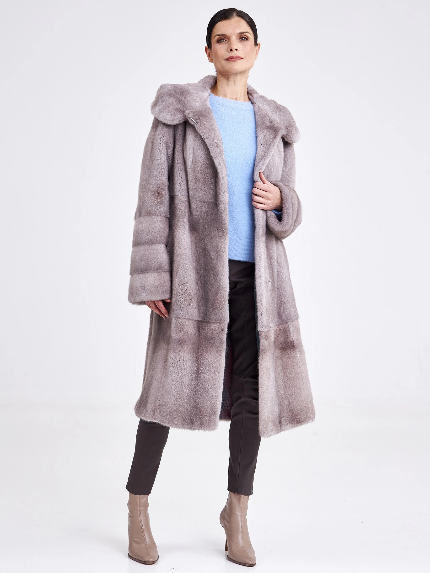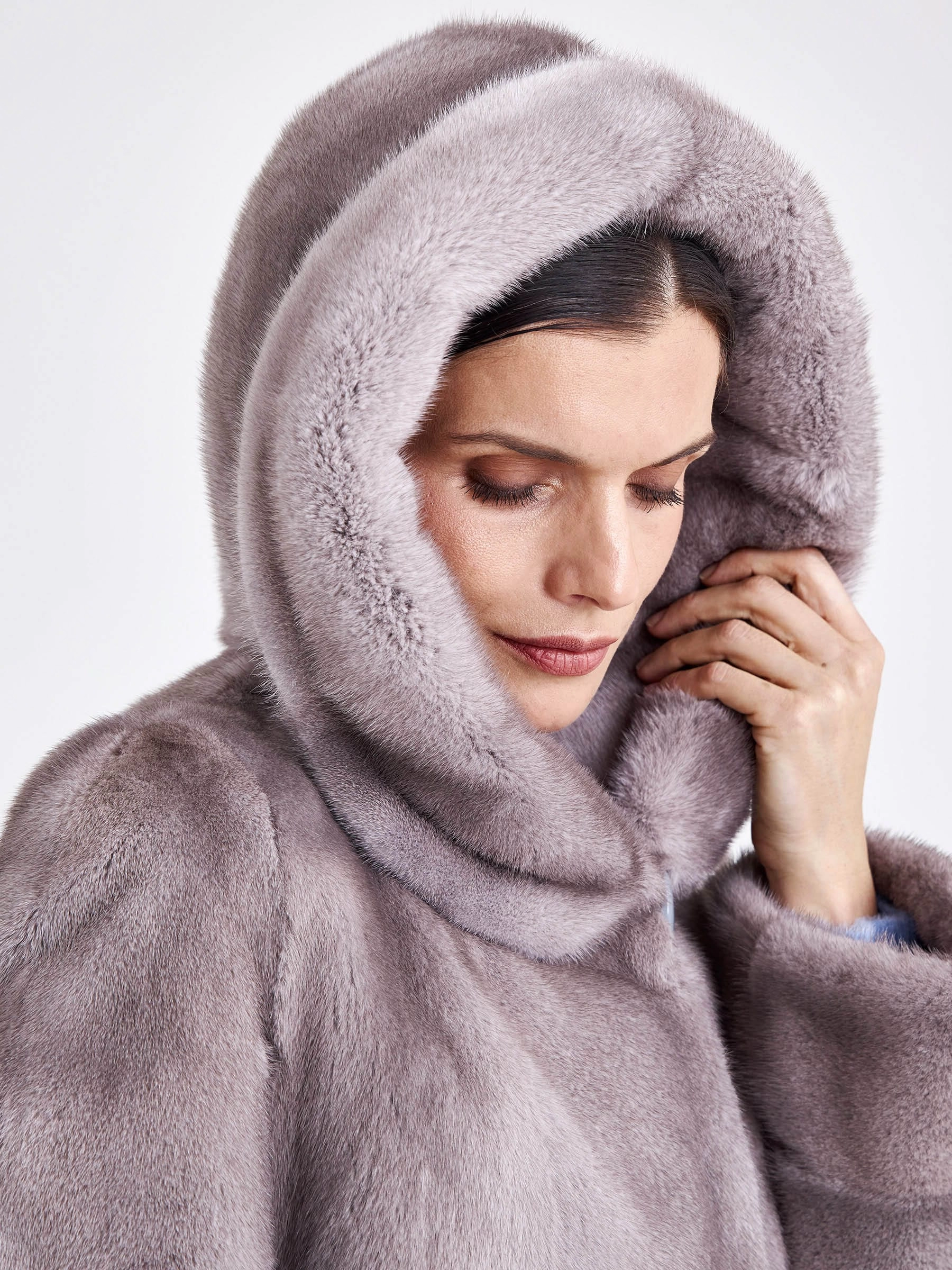 В холодную зиму незаменимой станет эта уютная и тёплая шуба из меха скандинавской норки благородного дымчато-серого оттенка. Великолепный густой и шелковистый мех завораживает своей красотой, а свободный прямой крой-трапеция и длина свыше 90 см обеспечивают комфорт и не сковывают движения, дополненный глубокий капюшон добавляет ещё больше уюта. Эта классическая модель — воплощение скандинавского спокойствия и вневременной роскоши, идеальная основа для создания цельного зимнего образа. Для максимальной выразительности сочетайте её с минималистичными объёмными свитерами, однотонными вязаными аксессуарами и гладкими кожаными сапогами или уггами, позволяя благородному меху оставаться главным героем вашего стиля.