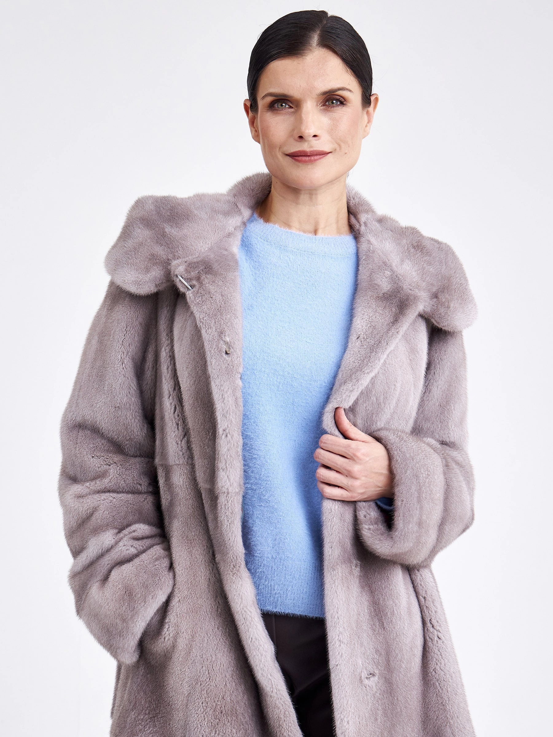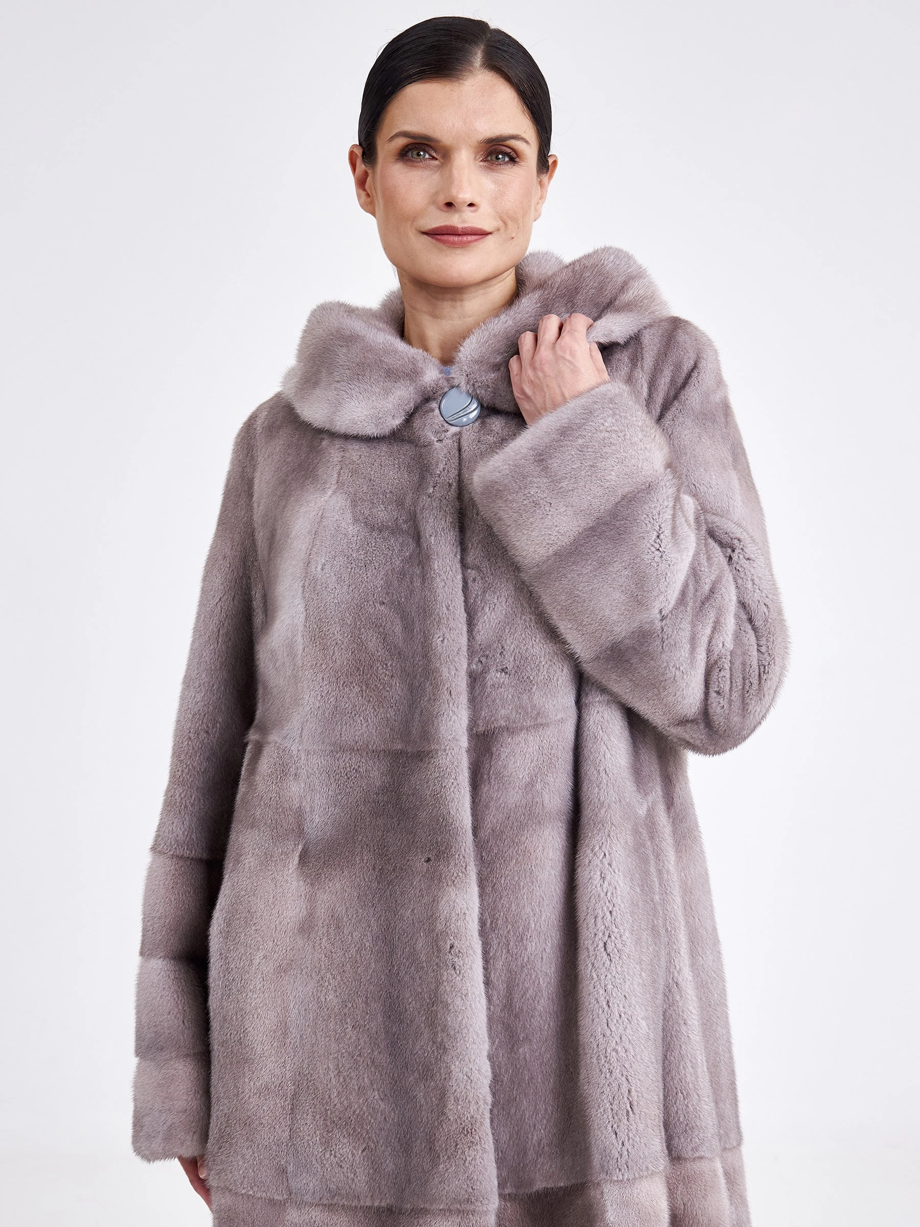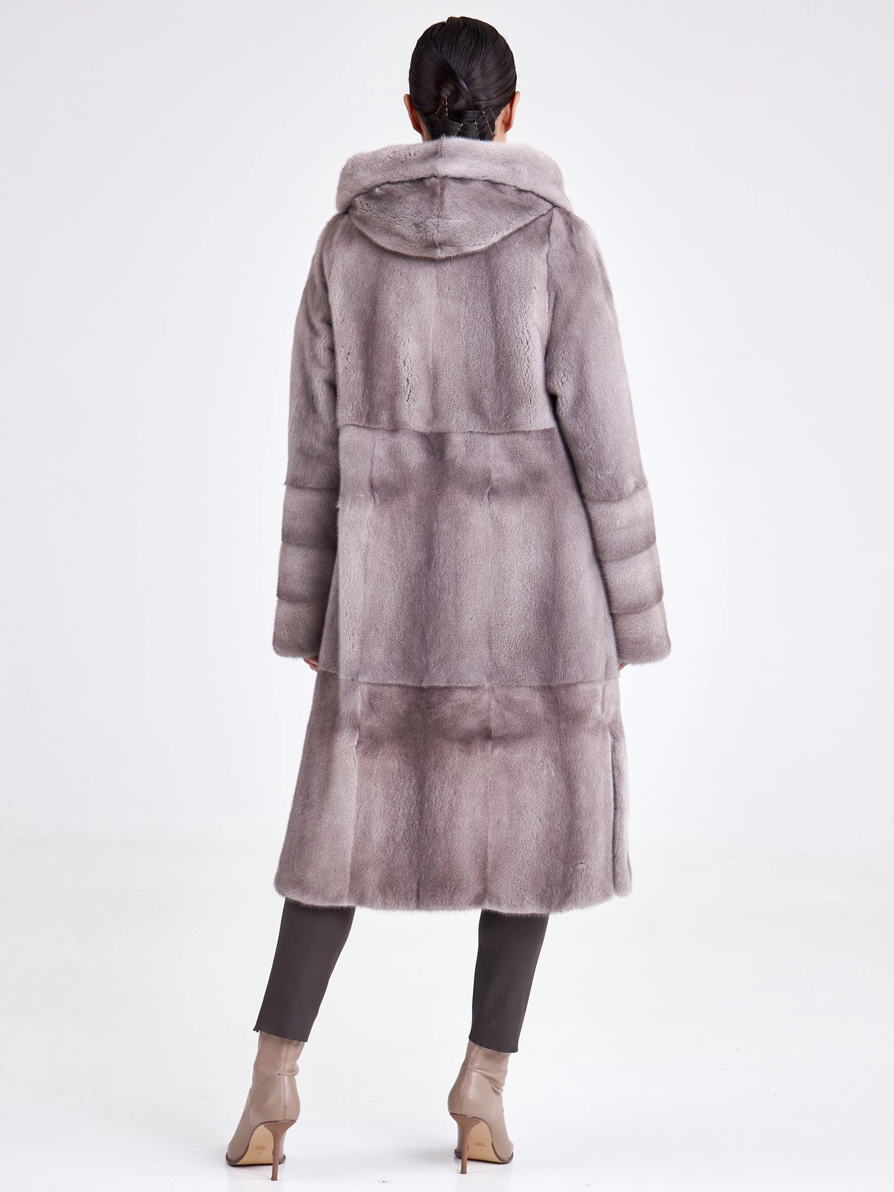 В холодную зиму незаменимой станет эта уютная и тёплая шуба из меха скандинавской норки благородного дымчато-серого оттенка. Великолепный густой и шелковистый мех завораживает своей красотой, а свободный прямой крой-трапеция и длина свыше 90 см обеспечивают комфорт и не сковывают движения, дополненный глубокий капюшон добавляет ещё больше уюта. Эта классическая модель — воплощение скандинавского спокойствия и вневременной роскоши, идеальная основа для создания цельного зимнего образа. Для максимальной выразительности сочетайте её с минималистичными объёмными свитерами, однотонными вязаными аксессуарами и гладкими кожаными сапогами или уггами, позволяя благородному меху оставаться главным героем вашего стиля.