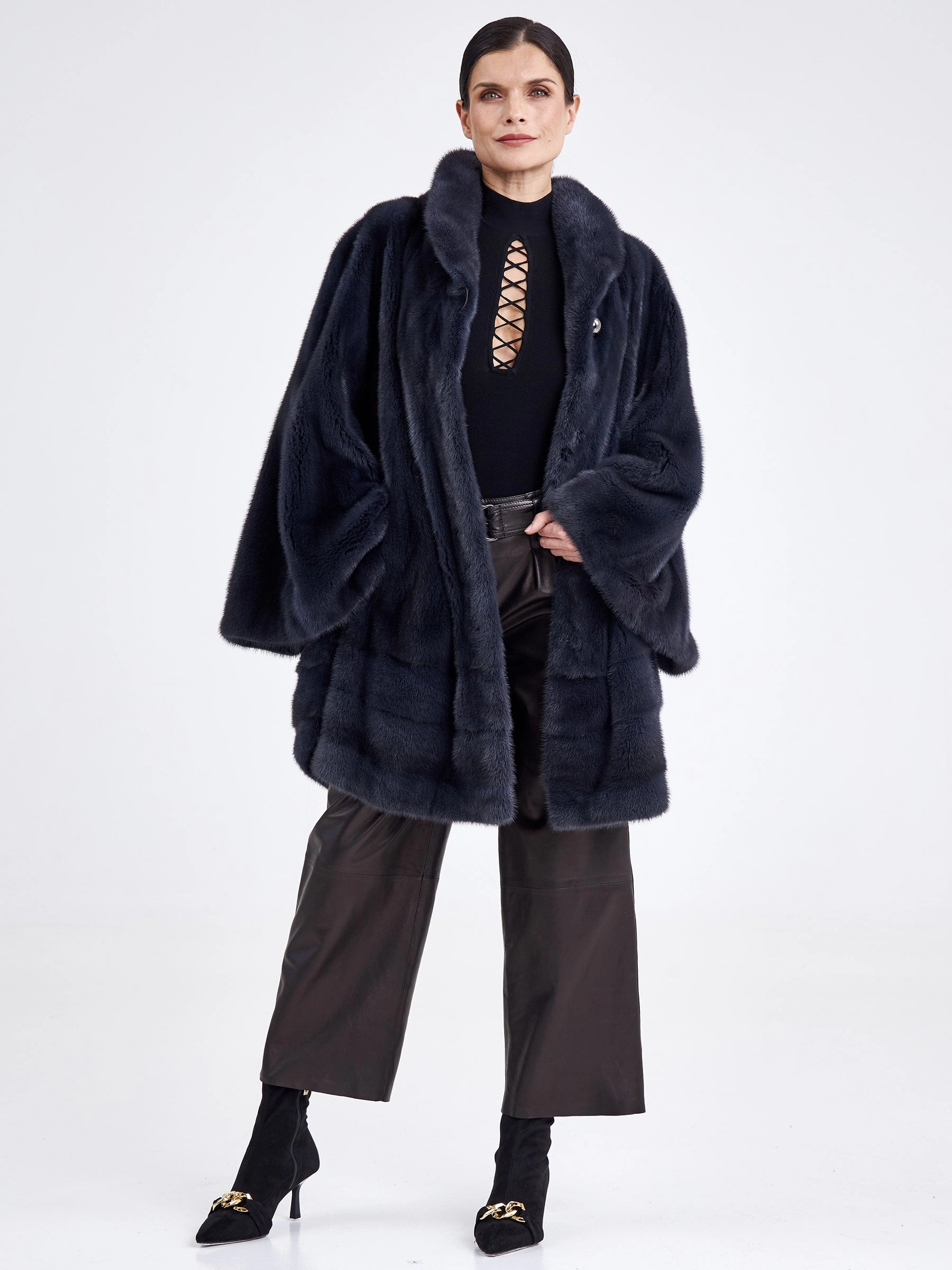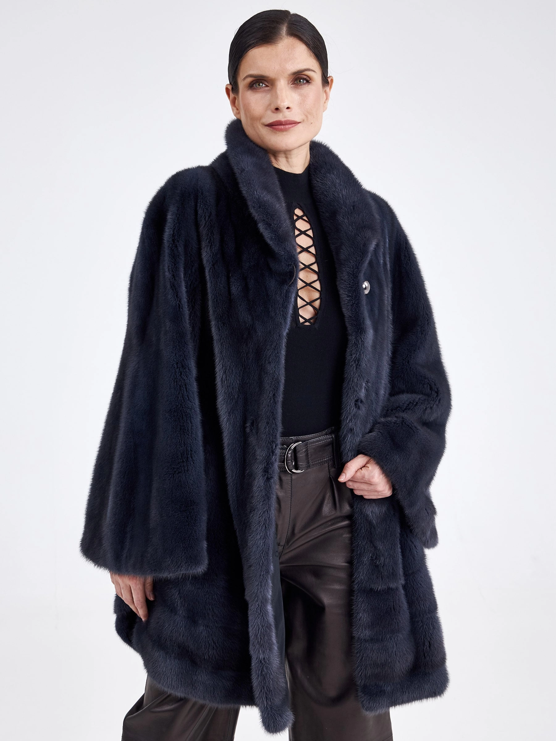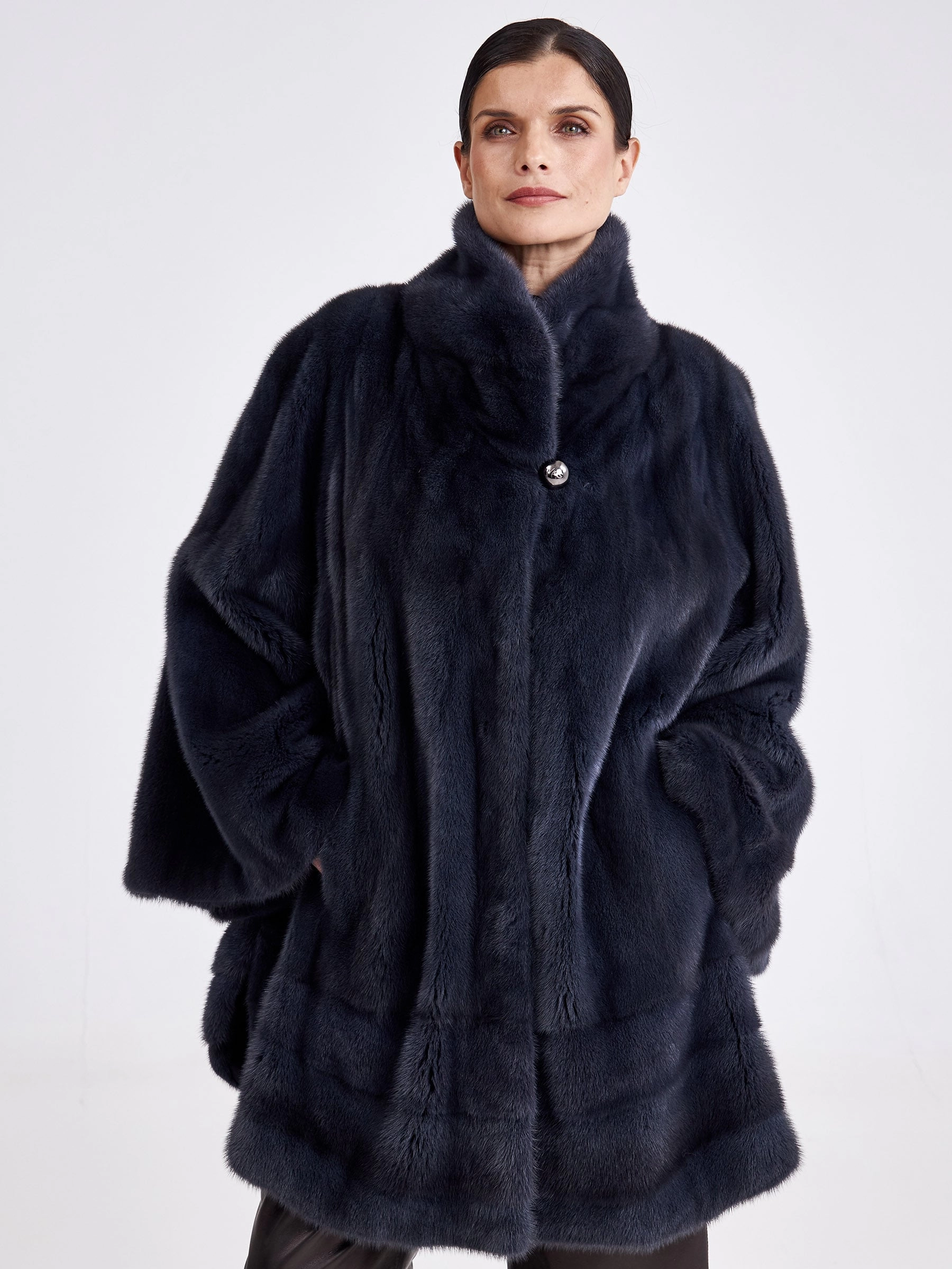 Невероятно стильное полупальто свободного кроя выполнено из низковорсовой шелковистой норки, окрашенной в глубокий оттенок графита. Модель максимальной длины создаёт элегантный зимний силуэт и сконструирована с применением двух техник выкладки меха: поперечной в нижней части и пластин в роспуск — в верхней, что обеспечивает идеальную пластичность, лёгкость и тепло. Лаконичный дизайн с мягким воротником апаш, застёжкой на клипсах и широкими рукавами, не сковывающими движения, подчёркивает благородство материала и современную эстетику. Практичная подкладка из стопроцентной вискозы добавляет комфорта, делая эту вещь безупречным выбором для повседневной носки в холодный сезон. Совет стилиста: универсальный цвет «графит» и чистый силуэт позволяют играть с контрастами — сочетайте эту шубу с объёмными свитерами и джинсами для непринуждённого лука, а для вечернего выхода с тонким водолазным платьем-футляром и стильными ботильонами на каблуке, следуя главному правилу: под свободный крой выбирайте облегающий или узкий