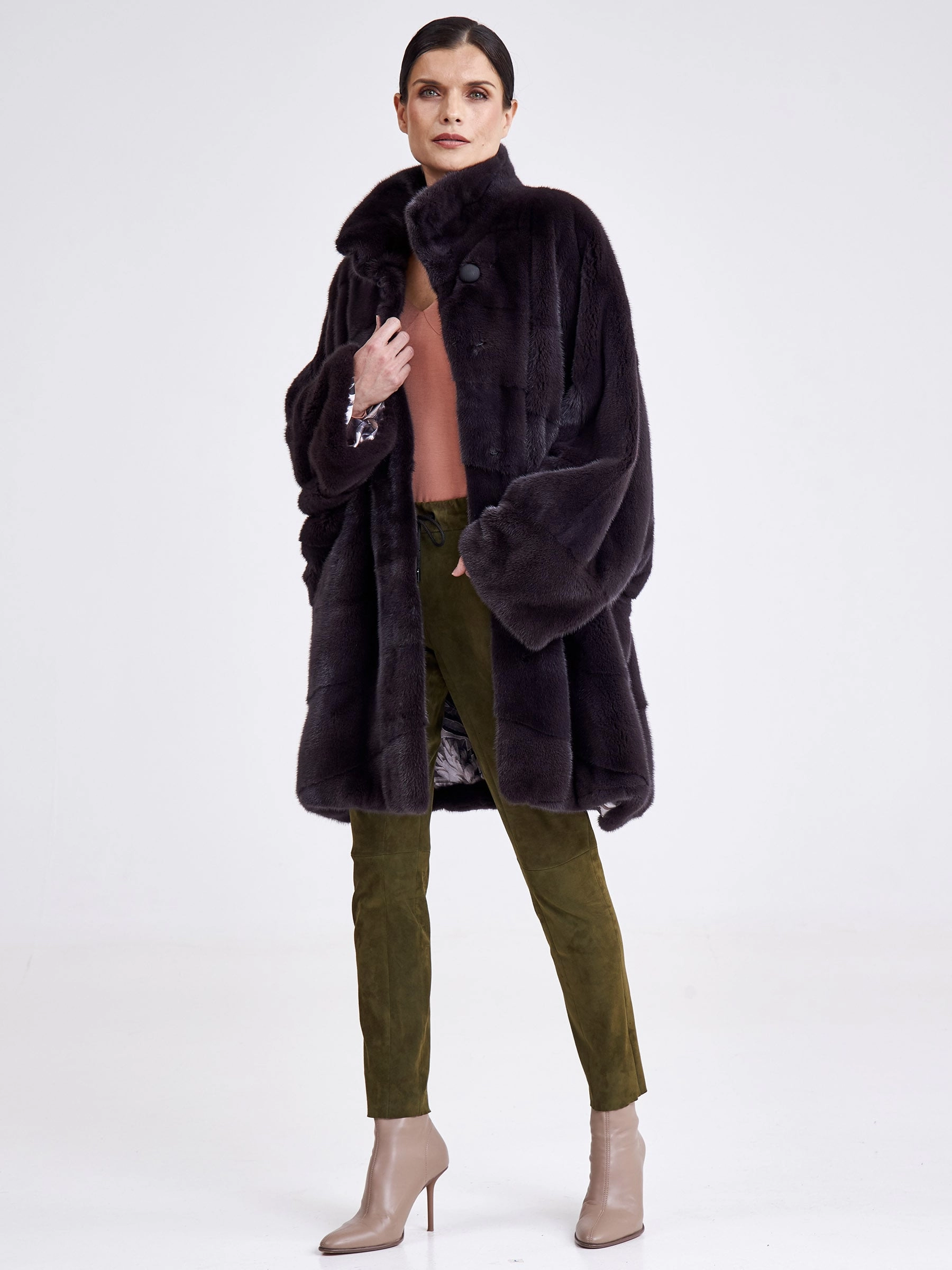 Противостоять морозам поможет шубка повседневного стиля, выполненная из мягкой и нежной крашеной низковорсовой норки в насыщенном оттенке баклажан. Густой шелковистый мех отлично сохраняет тепло, а диагональная выкладка и спущенный силуэт с элегантными спущенными рукавами делают модель особенно стильной, пластичной и комфортной. Свободный крой максимальной длины (свыше 90 см) подчеркивает современный образ, а практичные детали — воротник-стойка и застёжка на клипсах — завершают лаконичный дизайн без капюшона и лишней отделки. Удобная подкладка из 100% вискозы добавляет комфорта при носке. Совет стилиста: благородный цвет «баклажан» придаёт образу глубину и изысканность; сочетайте эту шубу с базой в серых, чёрных, тёмно-синих тонах или сыграйте на контрасте с пастельно-розовым или оливковым — такой акцент сделает зимний лук по-настоящему выразительным и запоминающимся.
