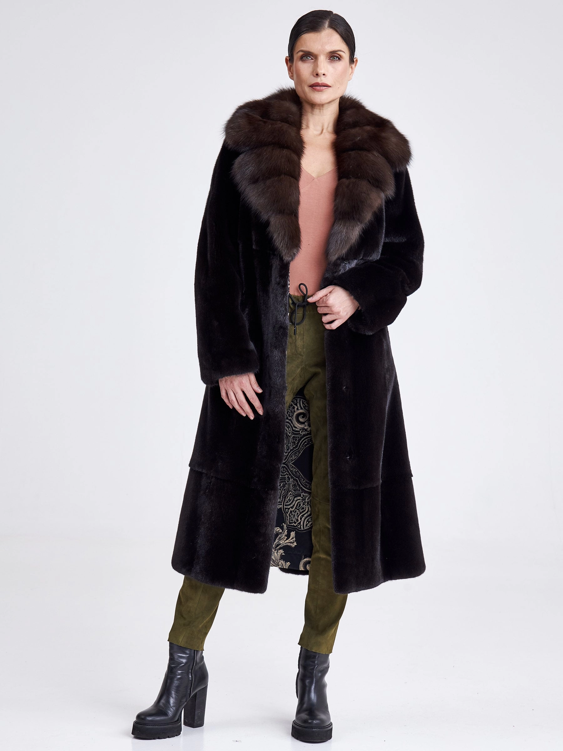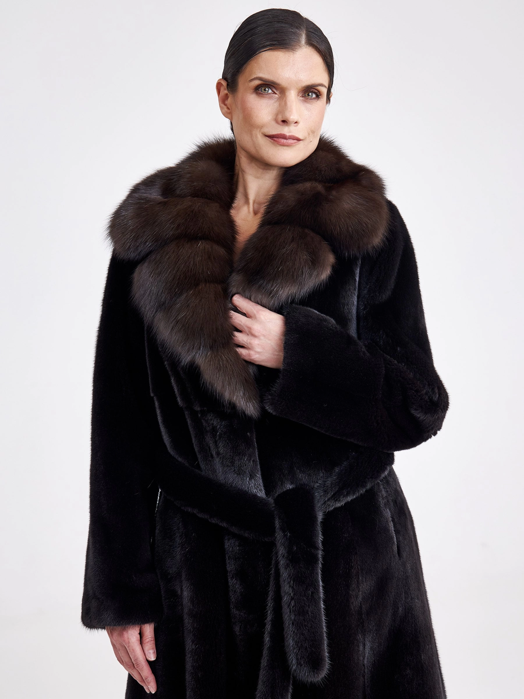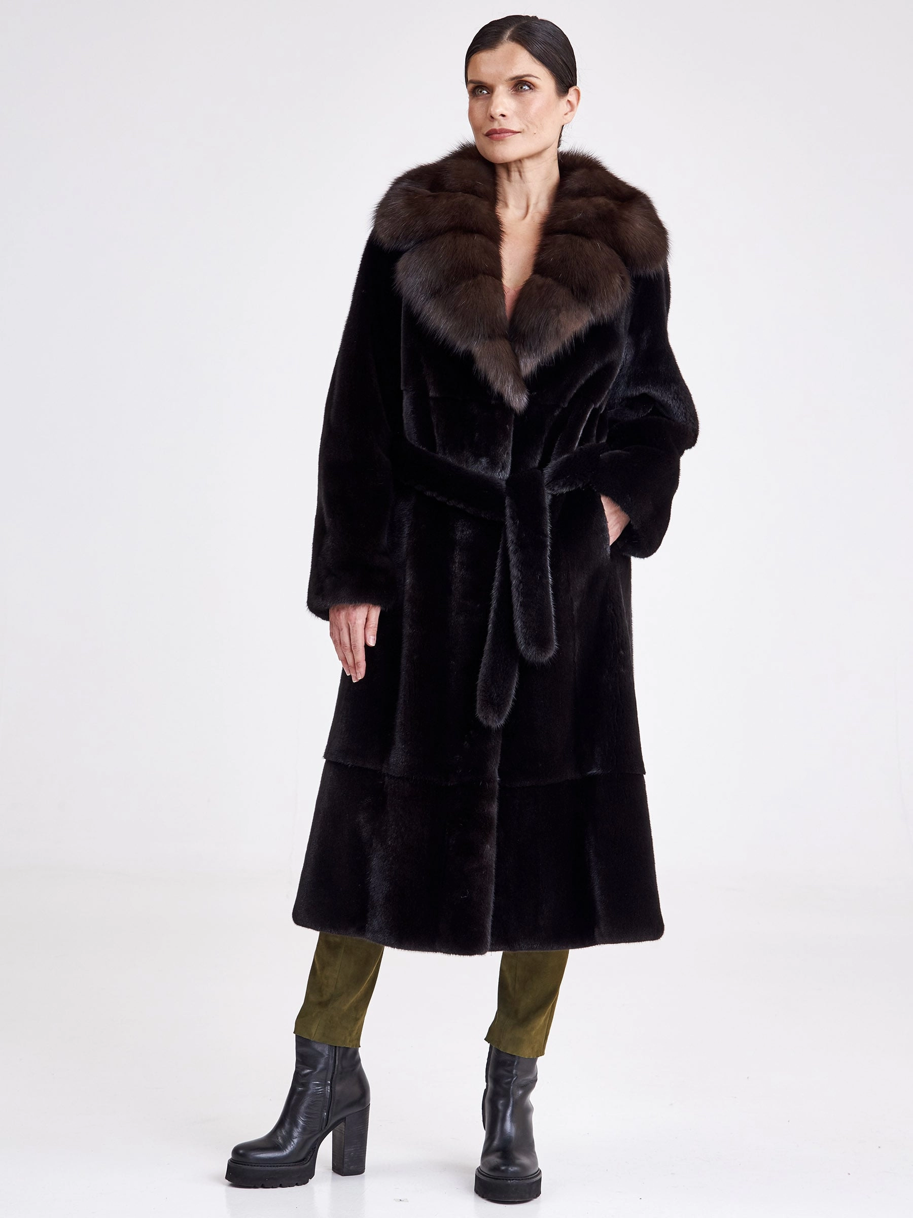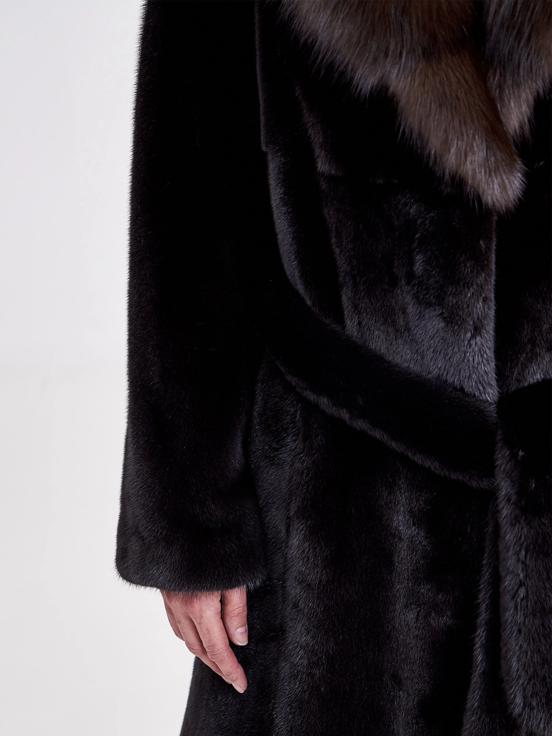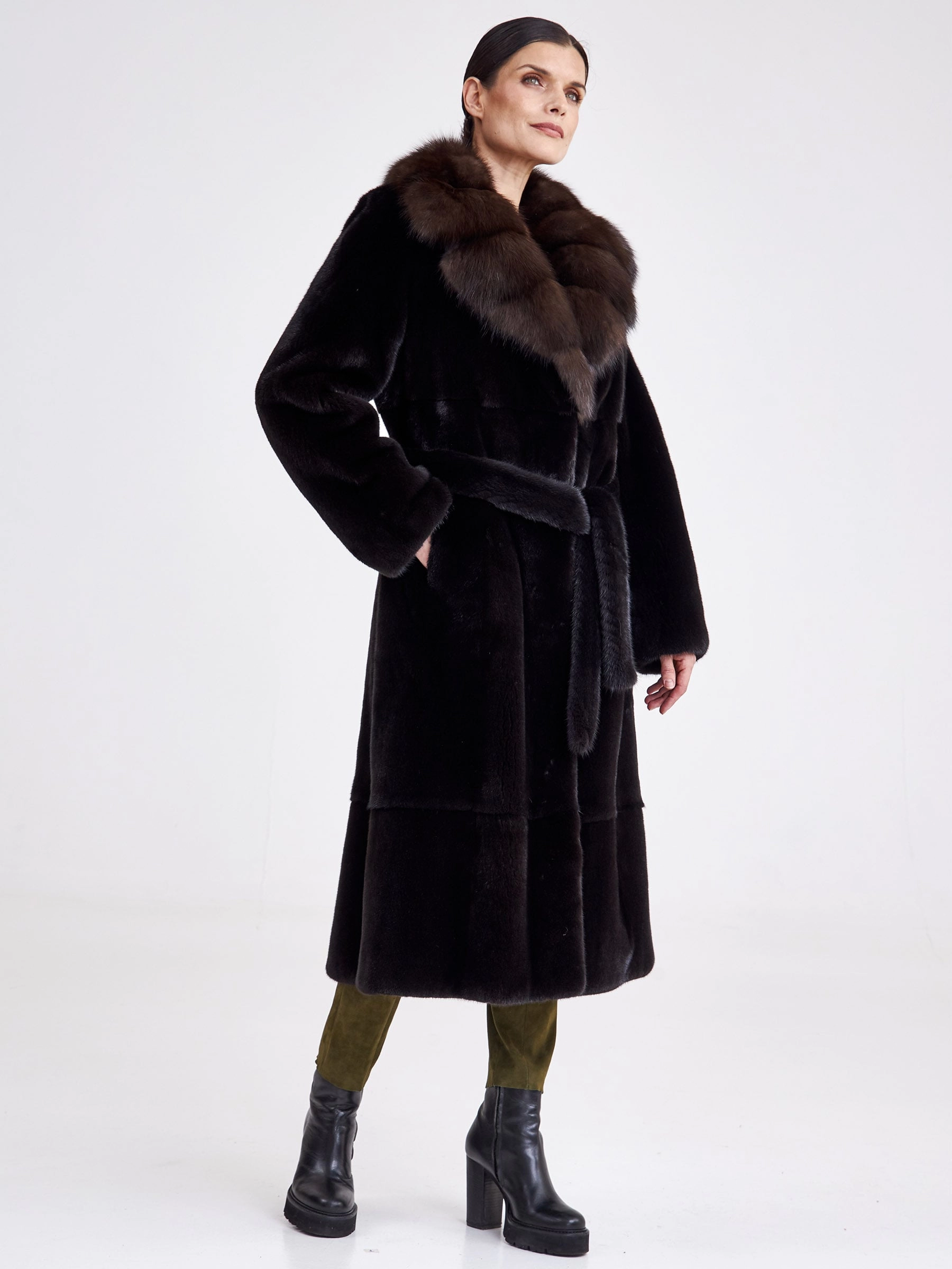 Длинная женская шуба из чёрной норки с английским воротником из соболя и съёмным поясом — идеальное решение для суровой зимы. Эта элегантная модель выполнена из отборного меха с диагональной выкладкой, придающей пластичность прямому классическому силуэту длиной свыше 90 см. Дизайнеры сделали акцент на безупречном контрасте: глубокий матовый цвет норки оттеняется переливчатым сиянием соболиного воротника строгой английской формы. Универсальный съёмный пояс позволяет варьировать образ — подчеркнуть линию талии для более строгого силуэта или носить модель в свободном, летящем крое. Удобная застёжка на клипсах, подкладка из 100% вискозы и свободный крой рукава гарантируют комфорт и тепло. Совет стилиста: многофункциональность модели открывает пространство для стилизации: затяните пояс поверх платья-футляра для создания элегантного вечернего образа или оставьте шубу раскрытой поверх водолазки и кожаных брюк для эффектного повседневного лука, завершив ансамбль высокими сапогами и лаконичной кожгалантереей.