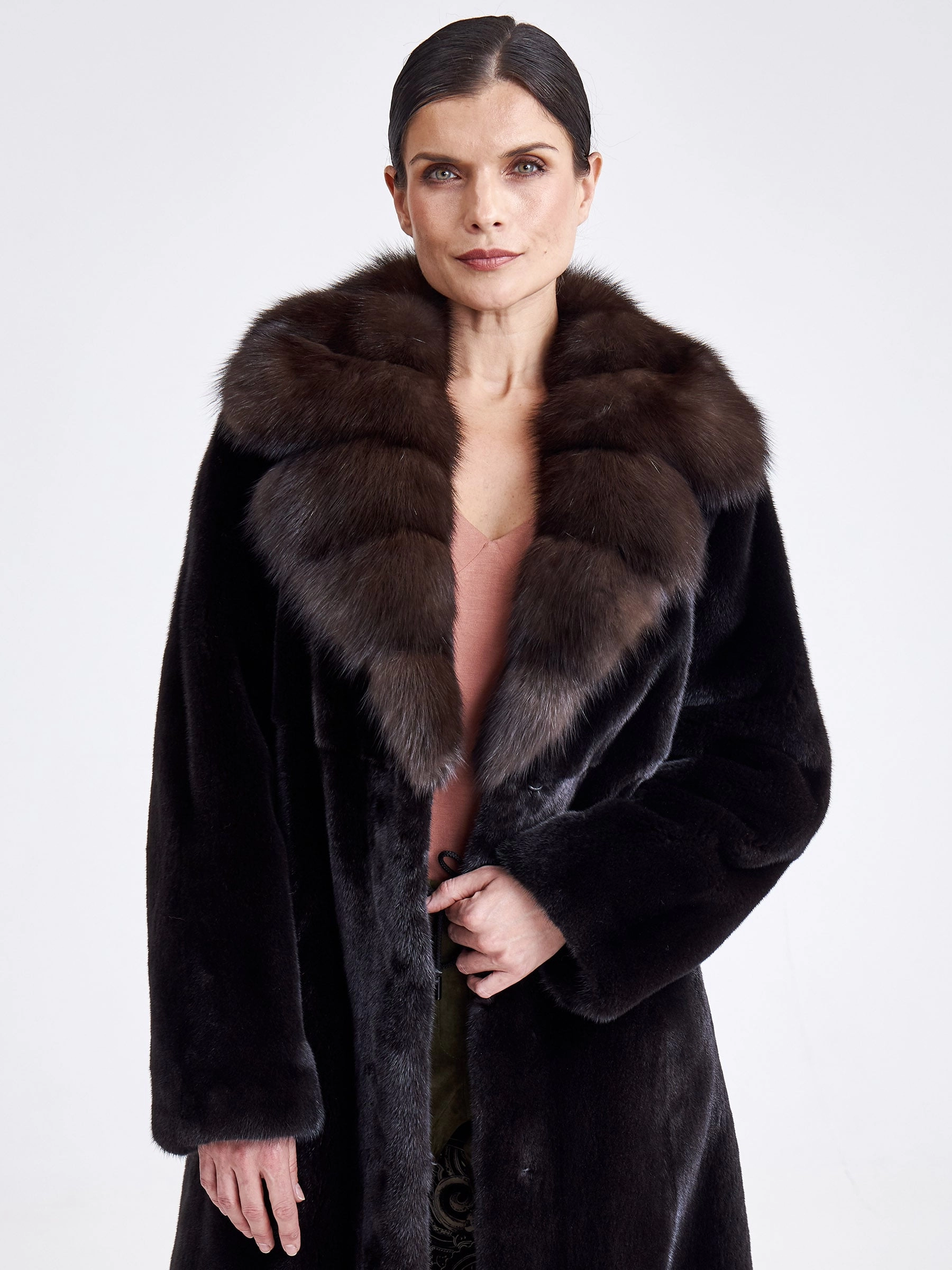 Товар женская длинная шуба из меха норки с воротником из меха соболя 17231(ав), черная, размер 48, артикул 33270 выполнен из норка крашенной с застежкой клипсы. Рассчитан на сезон: зима. Длина изделия свыше 90 см, силуэт полуприлегающий.