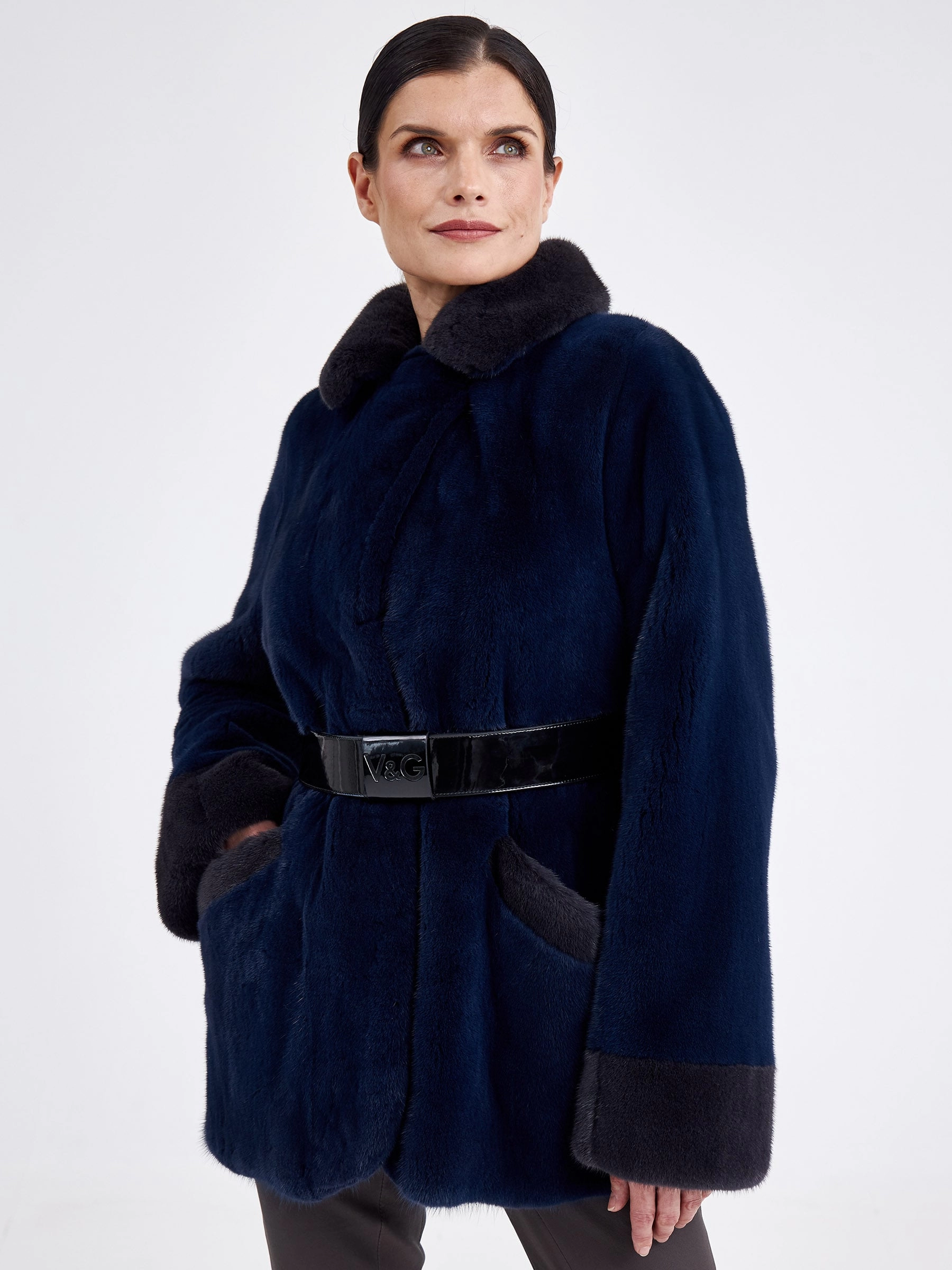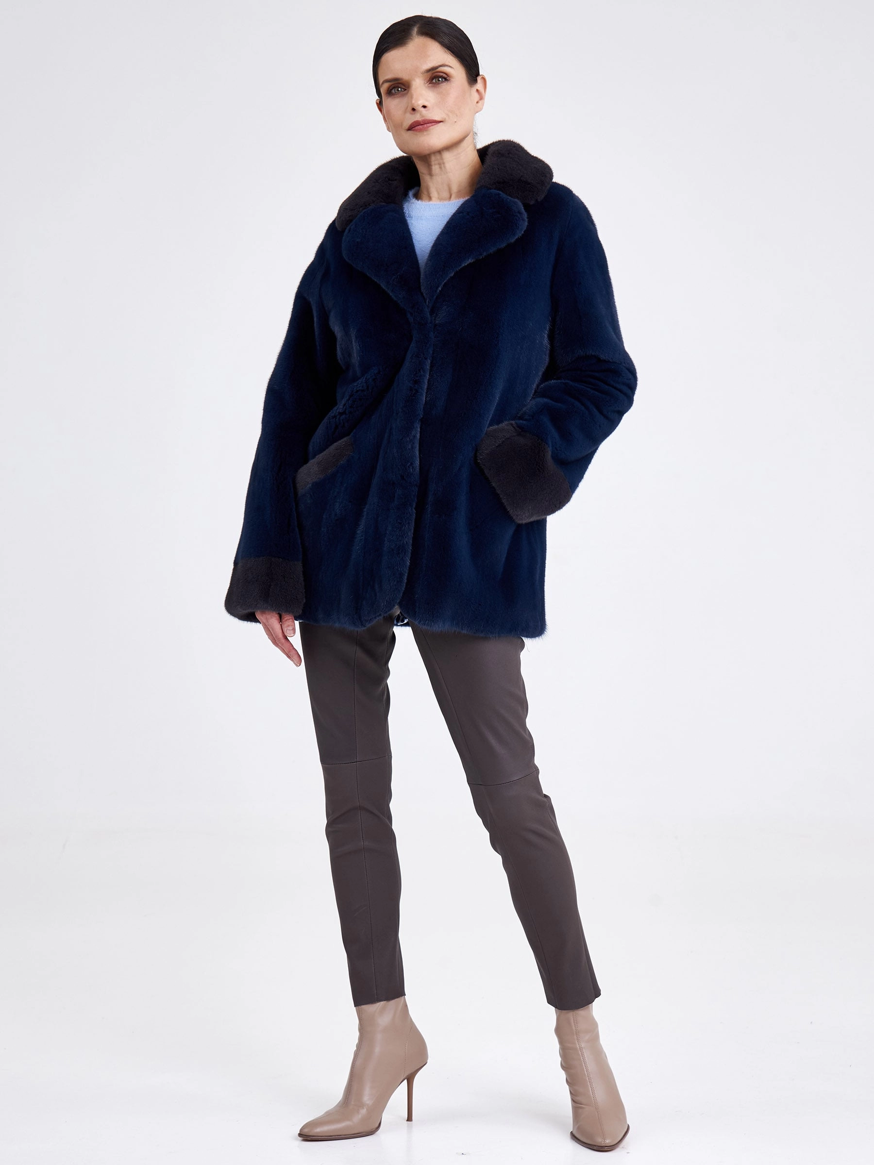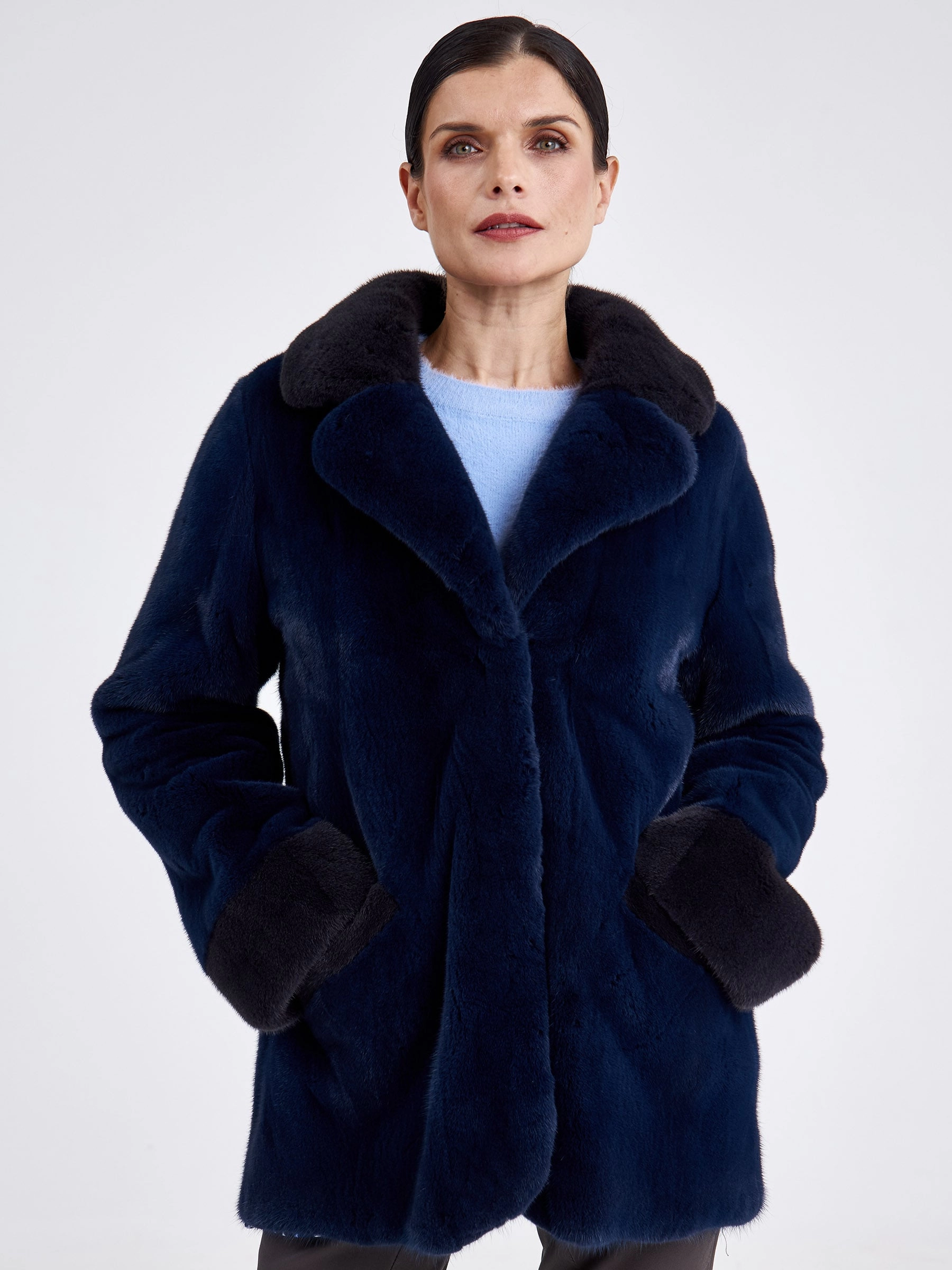 Эта классическая короткая шуба из низковорсовой крашеной норки насыщенного синего цвета демонстрирует безупречную зимнюю элегантность. Модель с прямым силуэтом, втачными плечами и строгим английским воротником обеспечивает идеальную посадку по фигуре. Короткая длина (51–74 см) и лаконичная застёжка на декоративные клипсы придают образу современную лёгкость. Шуба дополнена двумя функциональными карманами и длинным поясом, позволяющим варьировать силуэт. Благодаря шелковистому низковорсовому меху и подкладке из 100% вискозы изделие исключительно тёплое, лёгкое и комфортное для носки. Совет стилиста: наденьте её поверх однотонного платья-миди с сапогами на тонком каблуке для вечернего выхода или сочетайте с высокими кожаными брюками и объёмным свитером для создания дерзкого городского образа с акцентом на талии.