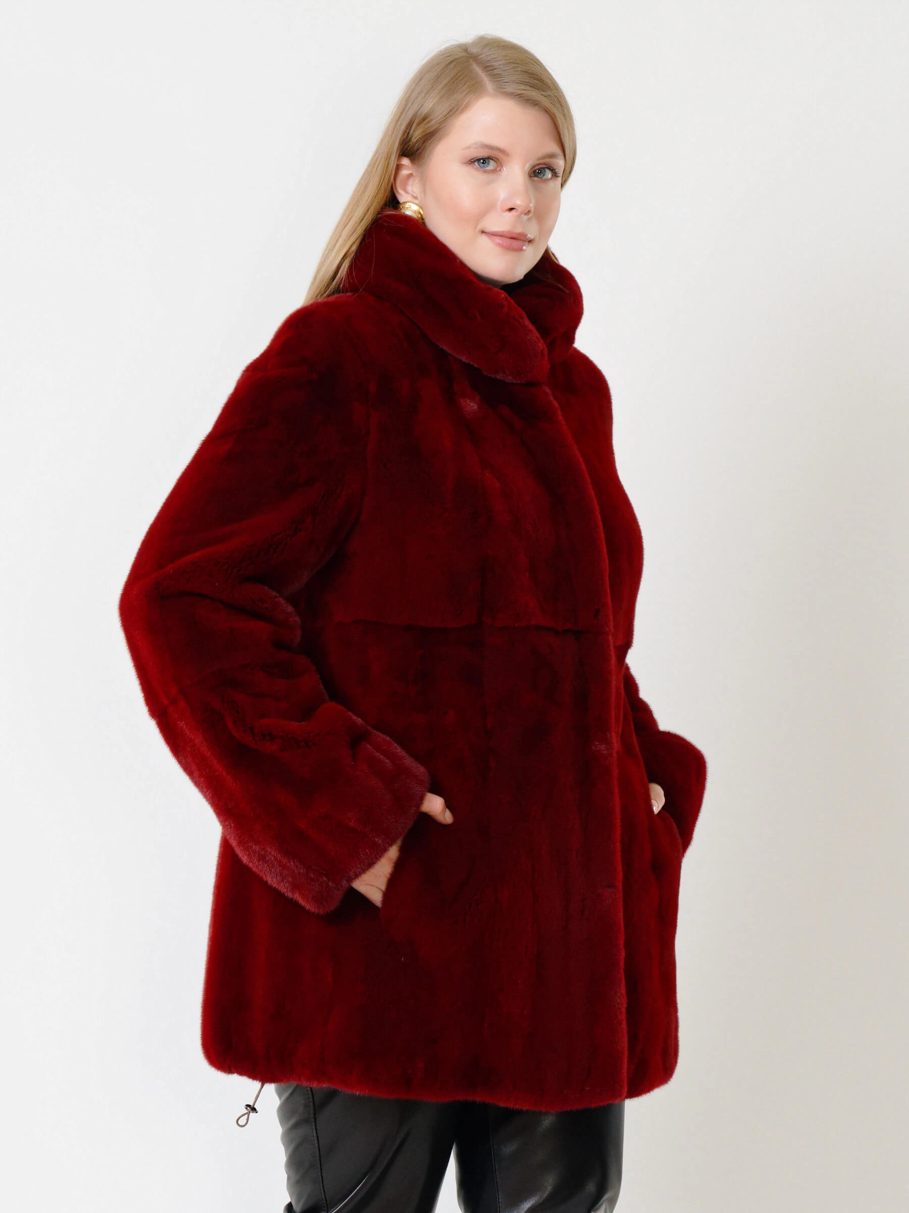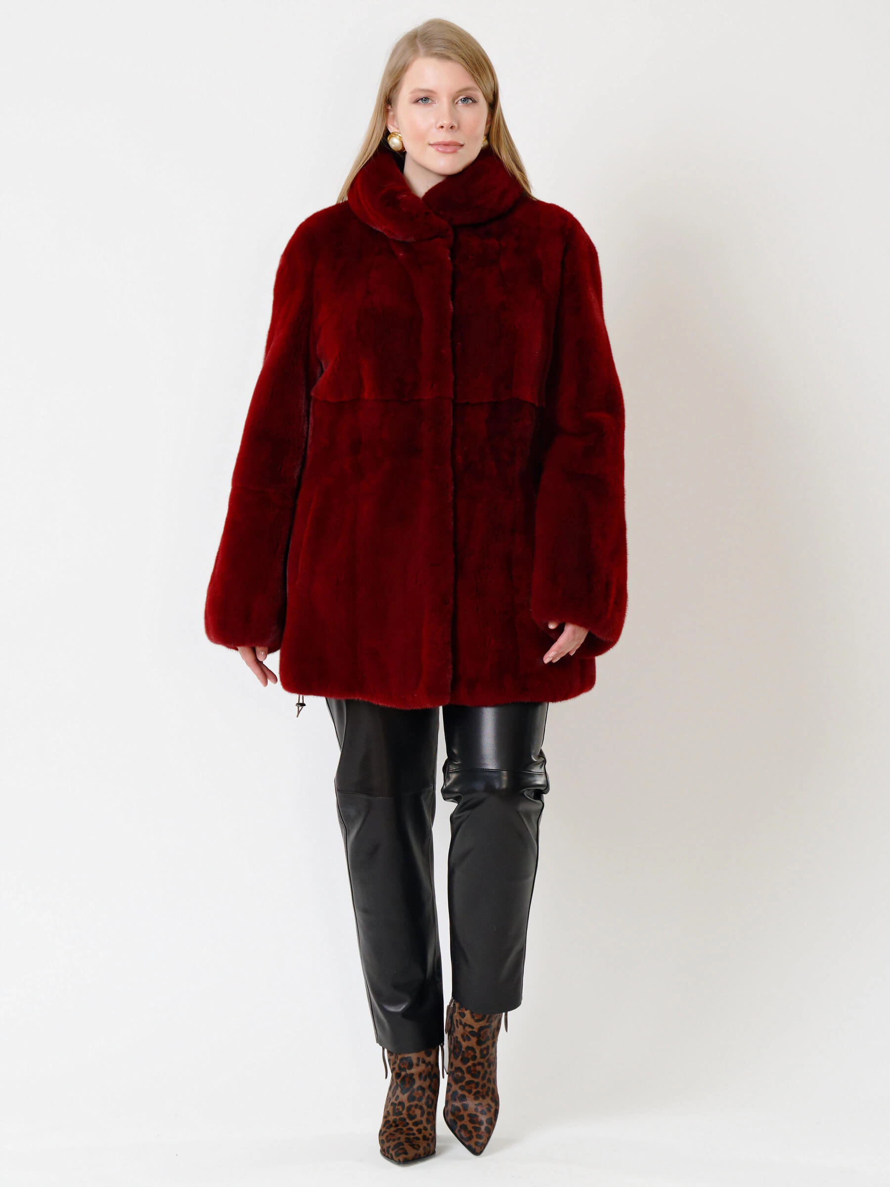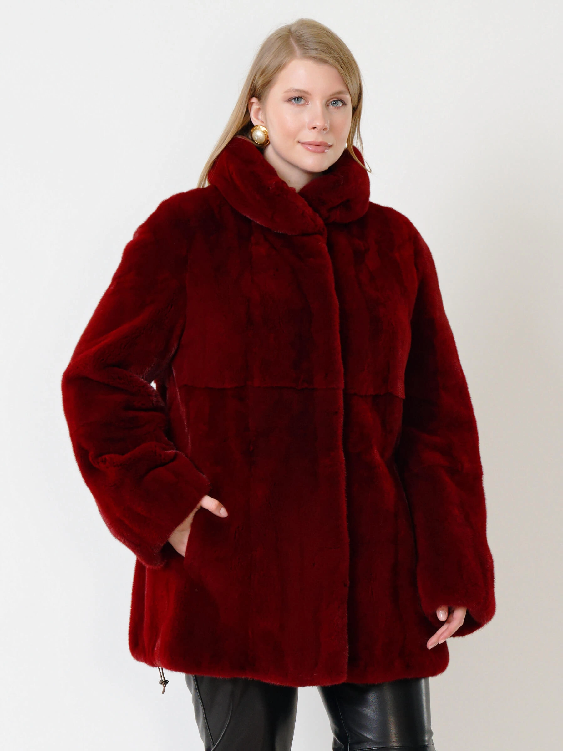 Товар короткая норковая шуба с воротником стойкой для женщин 217(в), бордовая, размер 52, артикул 33550 выполнен из норка крашенной с застежкой клипсы. Рассчитан на сезон: осень-зима. Длина изделия 75-90 см, силуэт прямой.