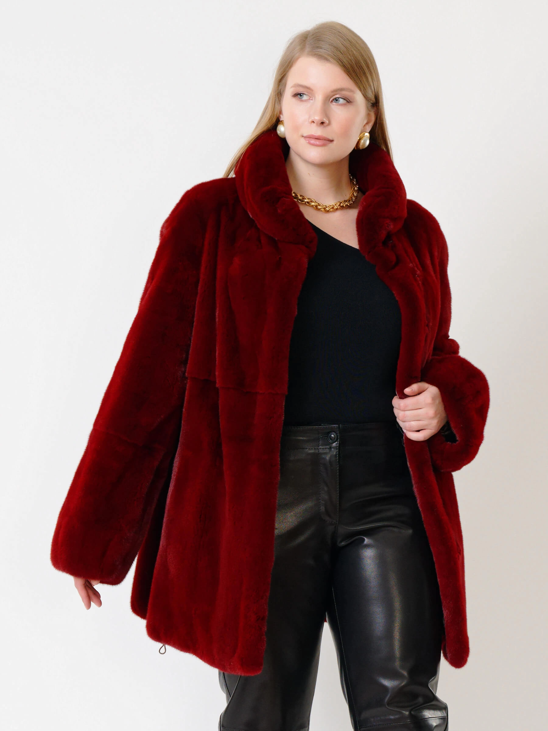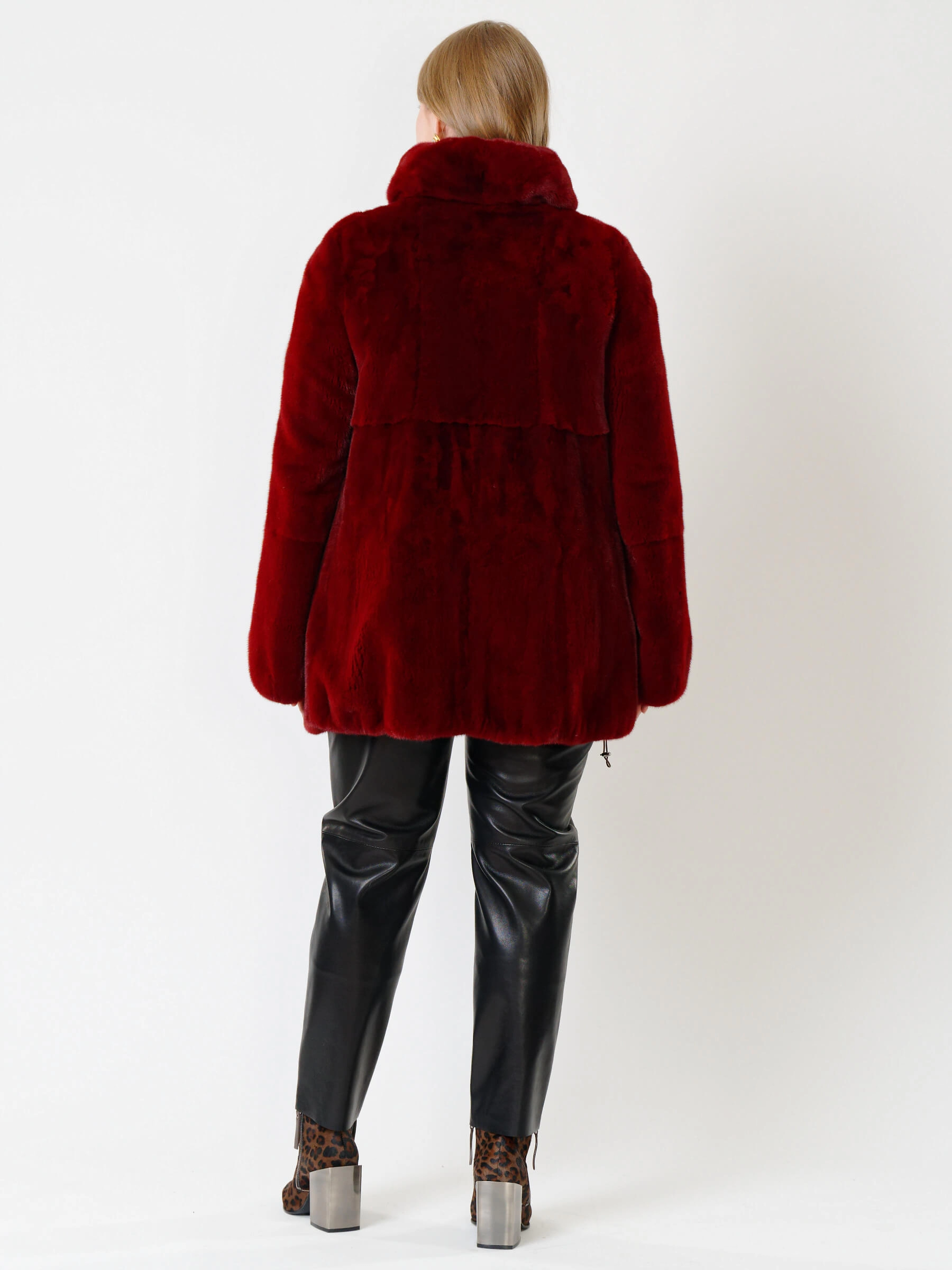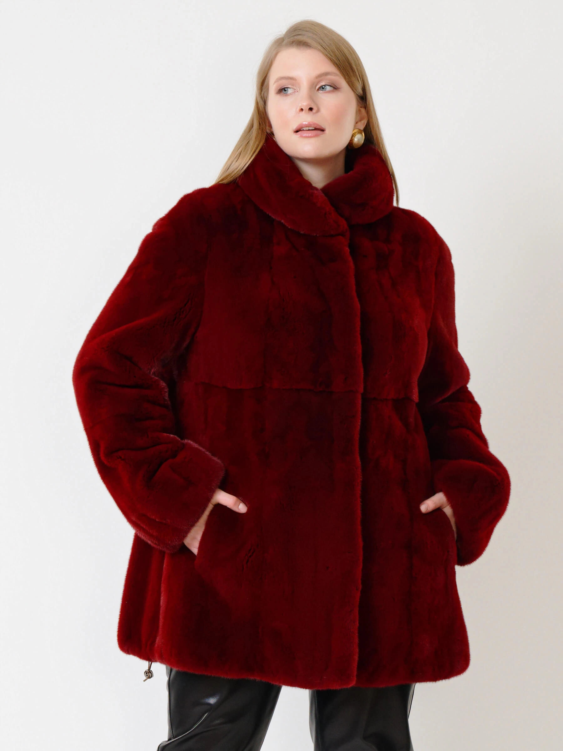 Товар короткая норковая шуба с воротником стойкой для женщин 217(в), бордовая, размер 52, артикул 33550 выполнен из норка крашенной с застежкой клипсы. Рассчитан на сезон: осень-зима. Длина изделия 75-90 см, силуэт прямой.
