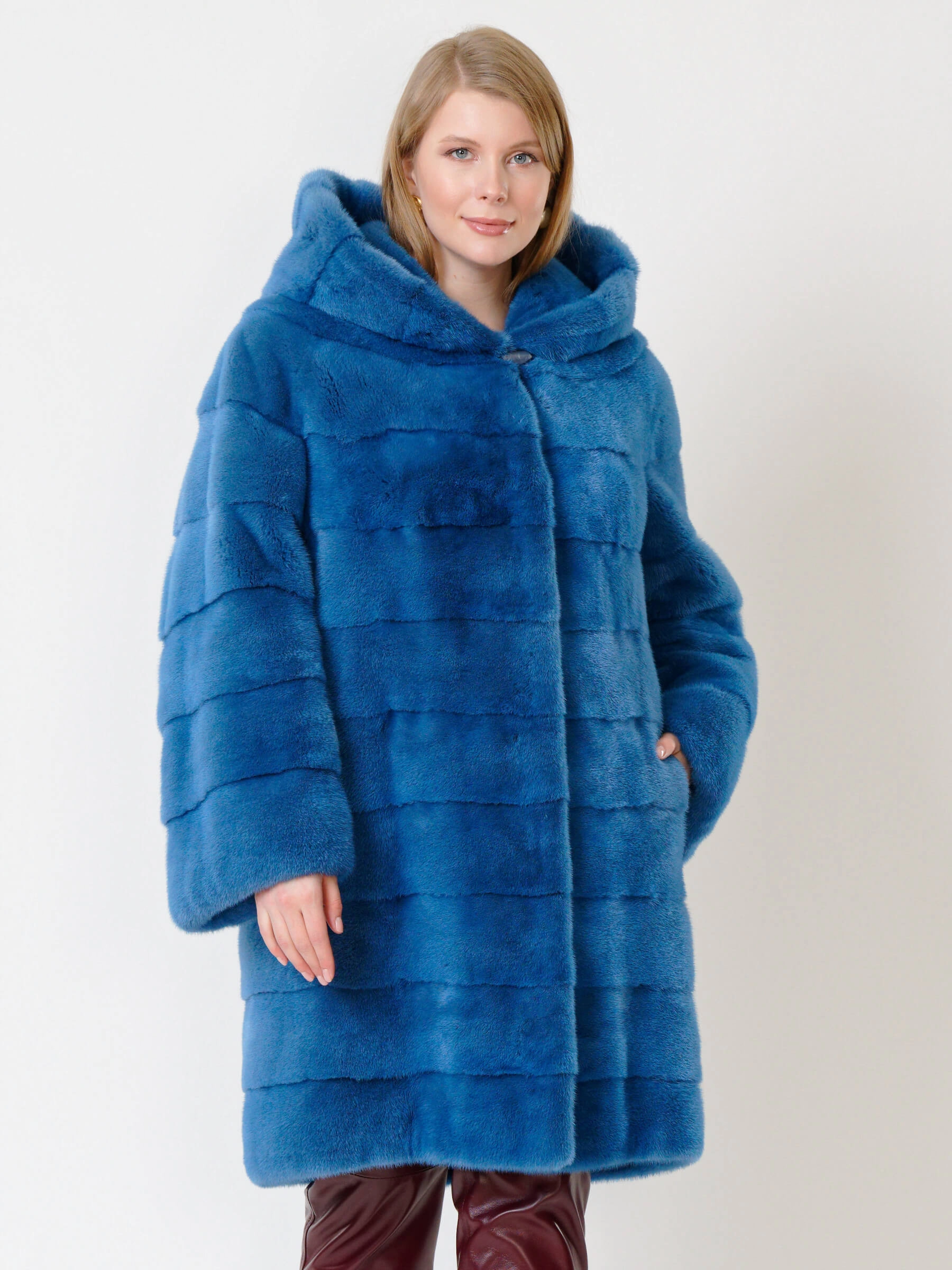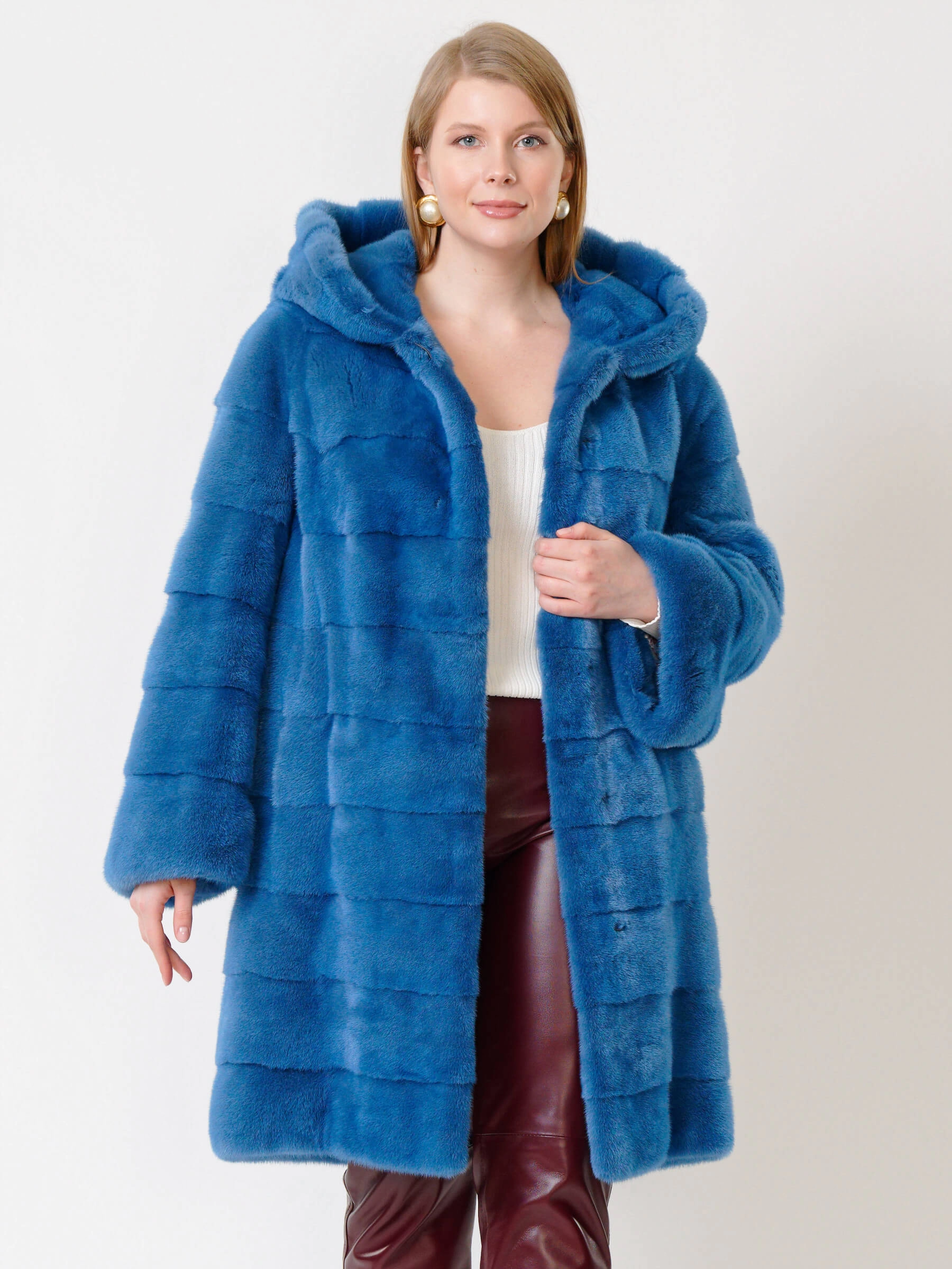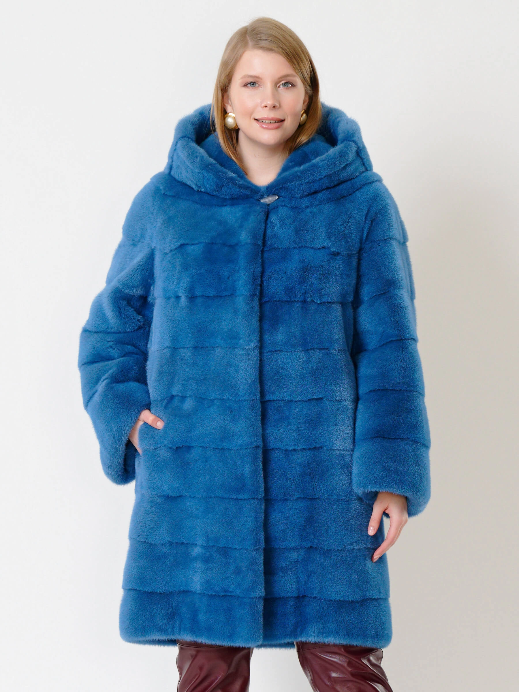 Товар короткая поперечная норковая женская шуба с капюшоном 245(к), голубая, размер 52, артикул 33440 выполнен из норка крашенной с застежкой клипсы. Рассчитан на сезон: осень-зима. Длина изделия свыше 90 см, силуэт прямой.