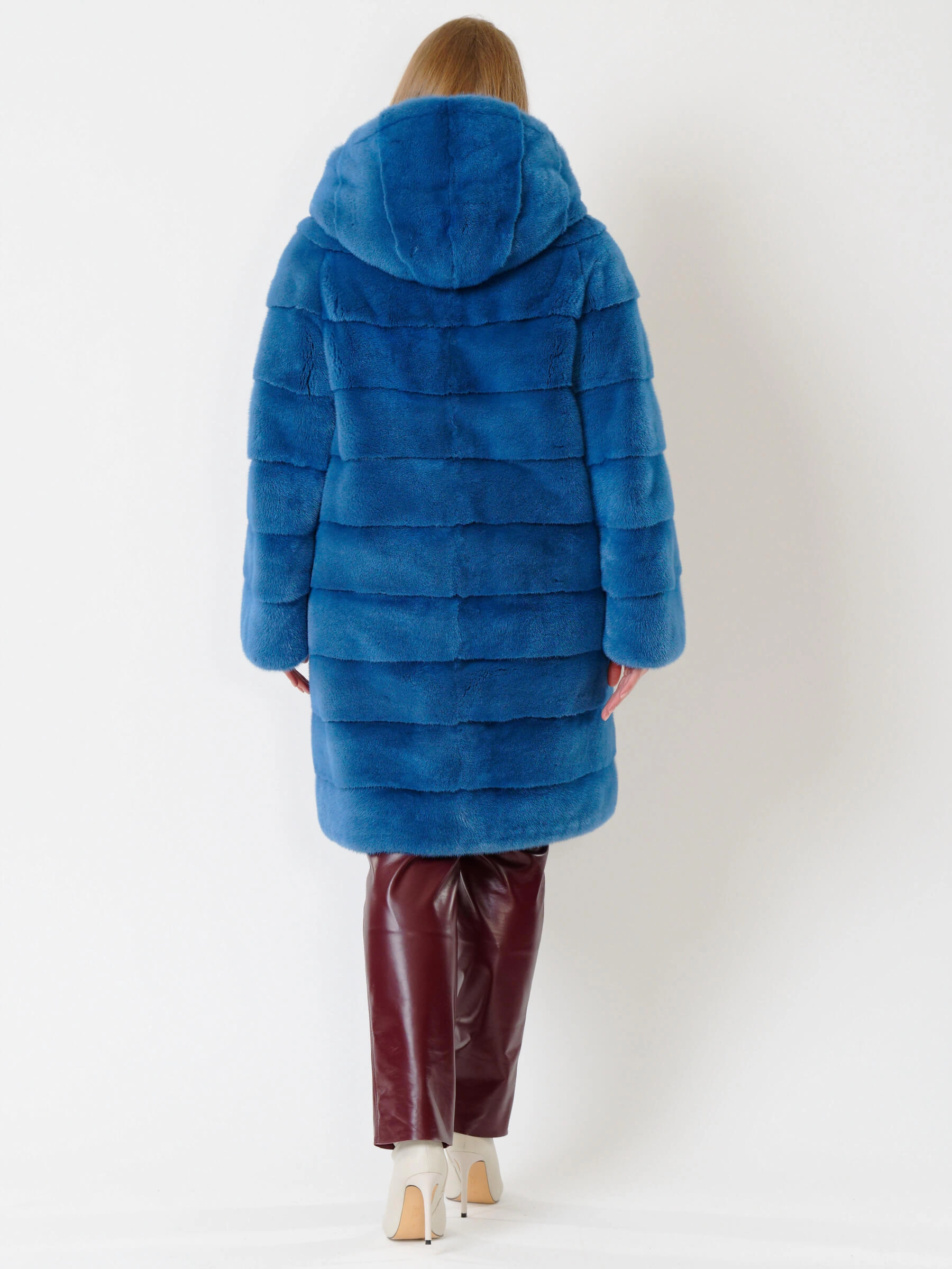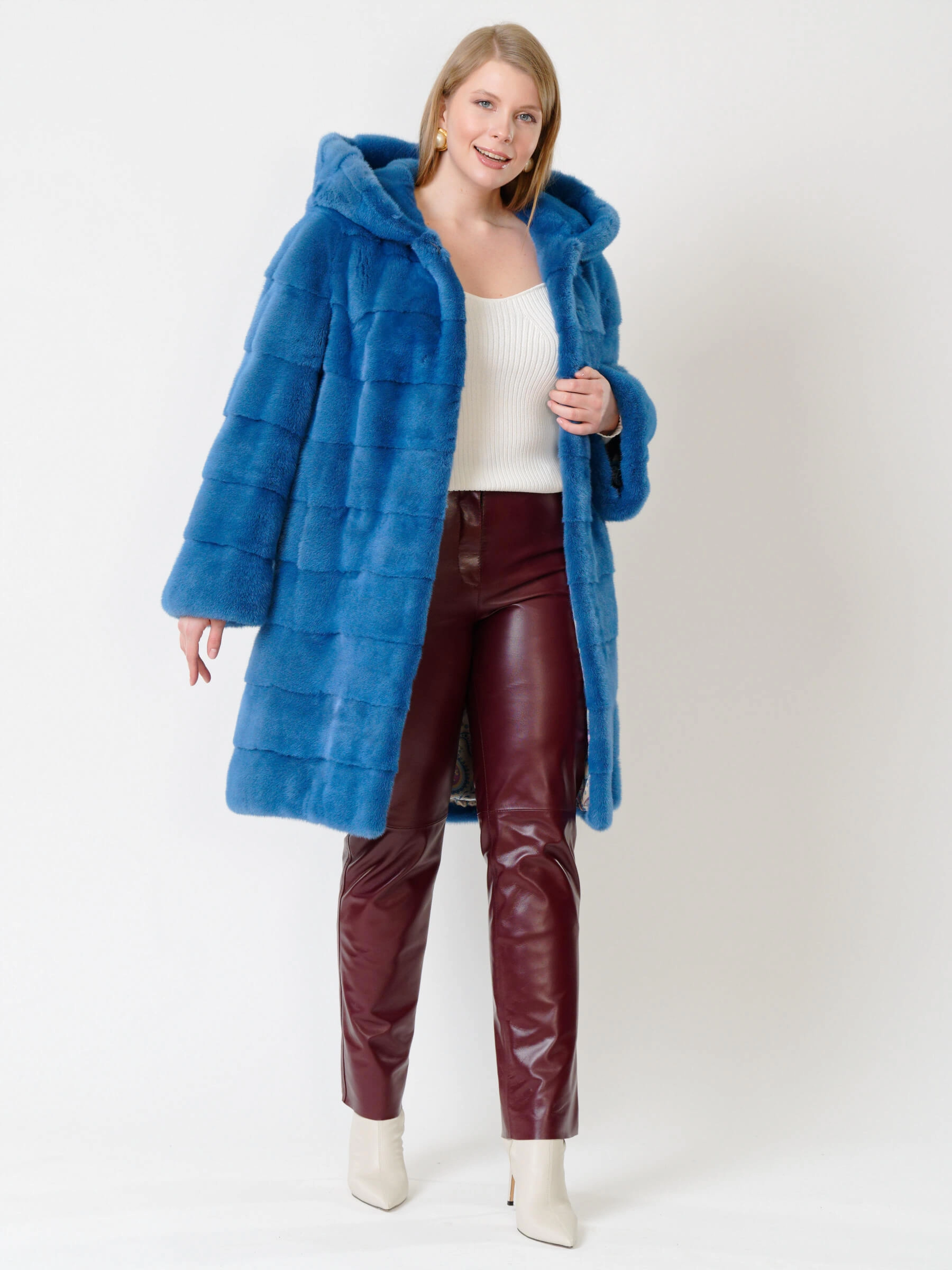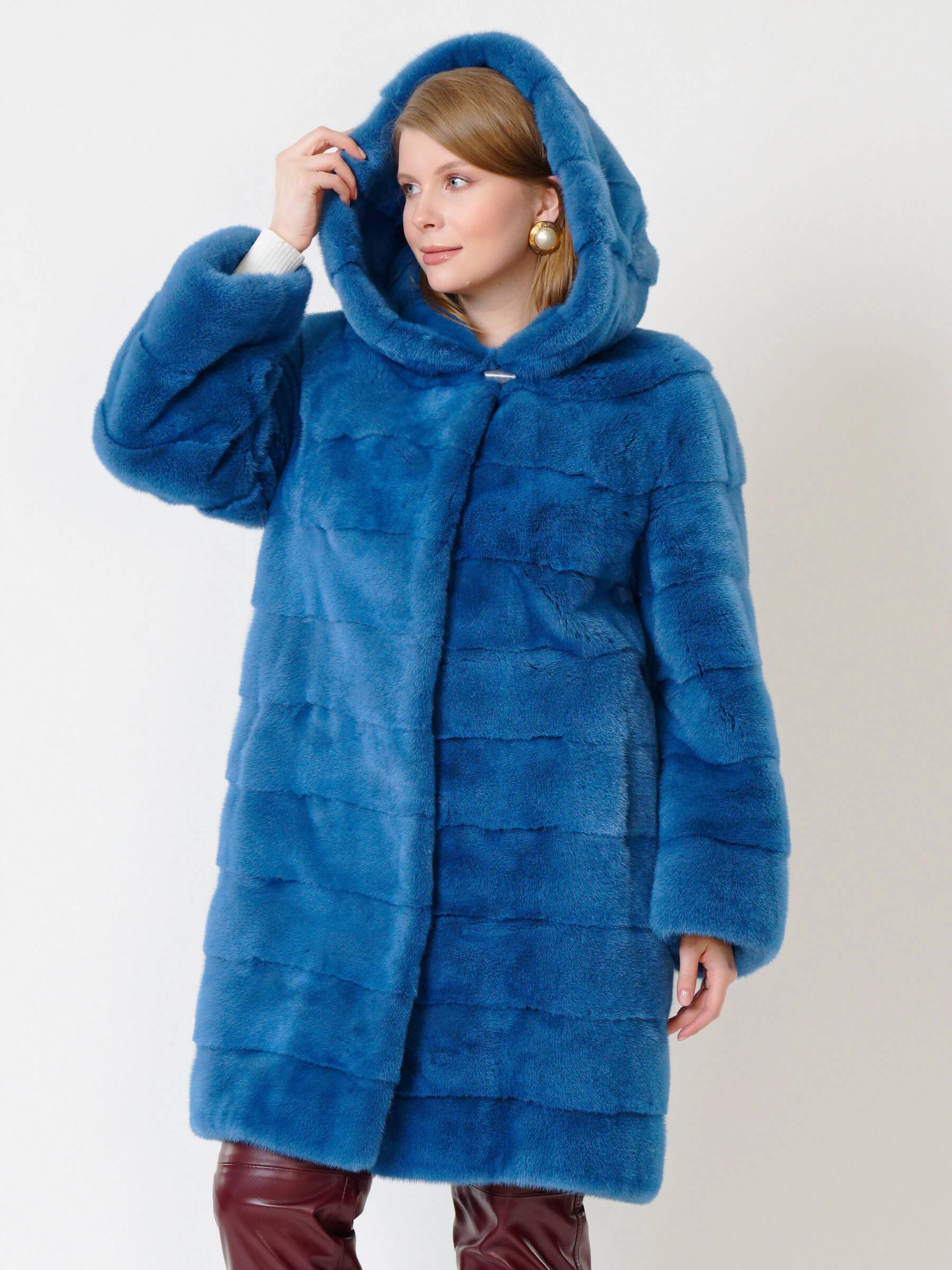 Товар короткая поперечная норковая женская шуба с капюшоном 245(к), голубая, размер 52, артикул 33440 выполнен из норка крашенной с застежкой клипсы. Рассчитан на сезон: осень-зима. Длина изделия свыше 90 см, силуэт прямой.