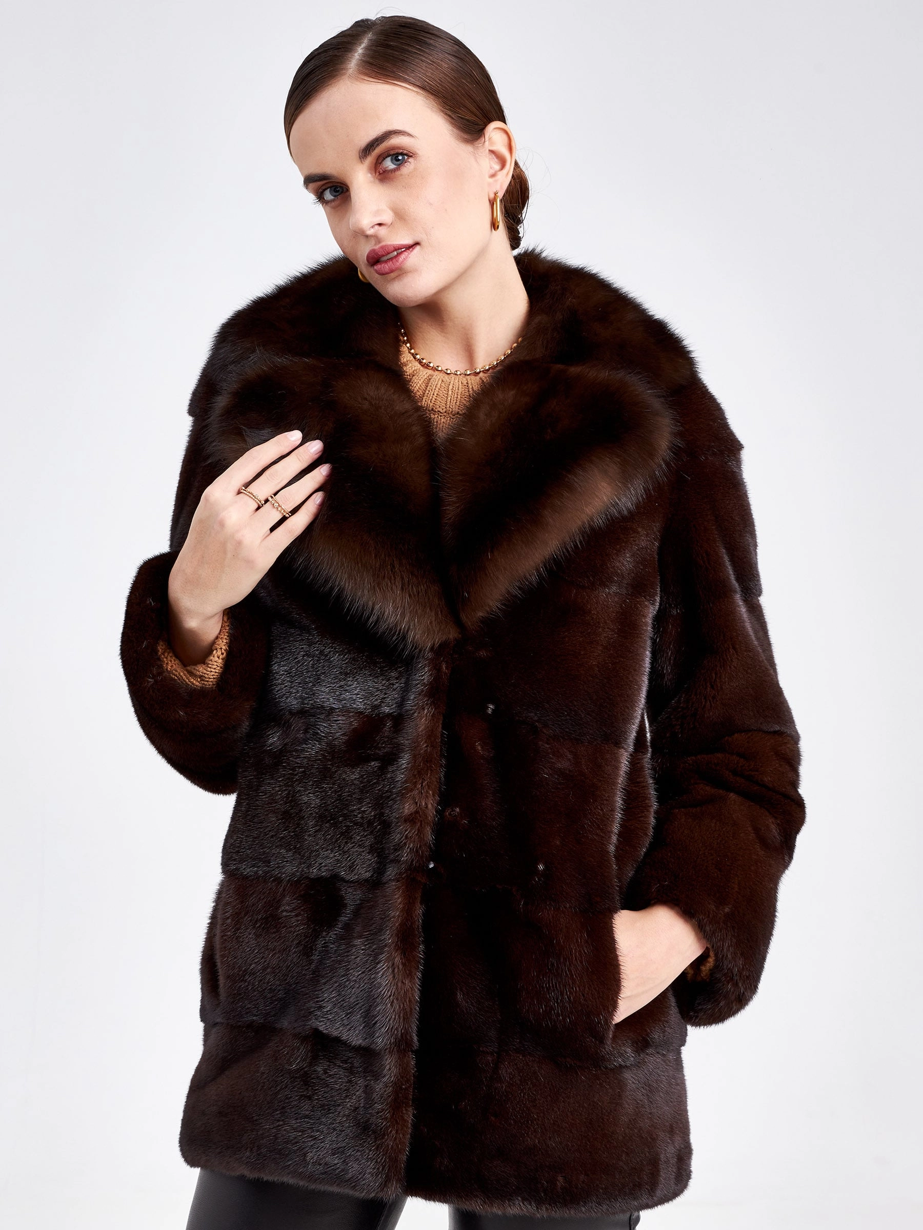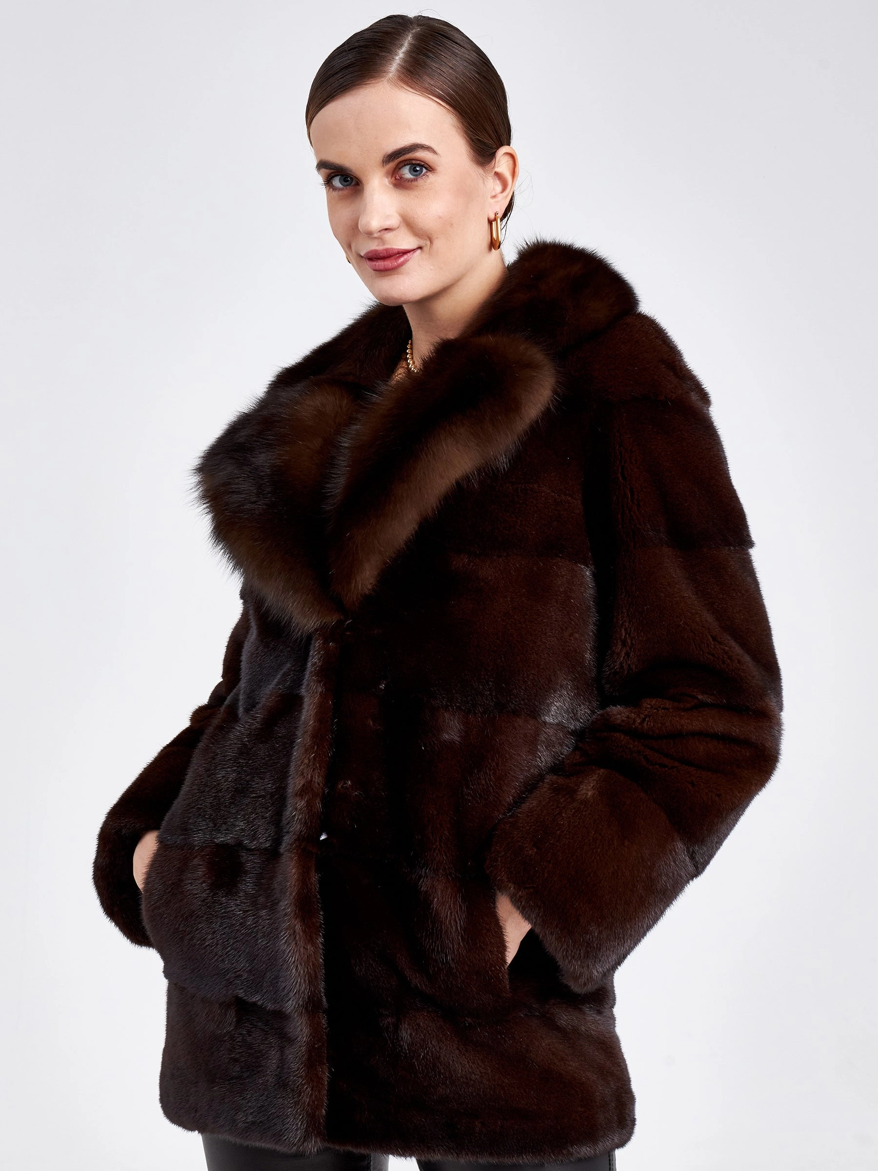 Шуба из меха норки женская 2а(авс), короткая, с воротником из меха соболя, коричневая, размер 44, артикул 33370