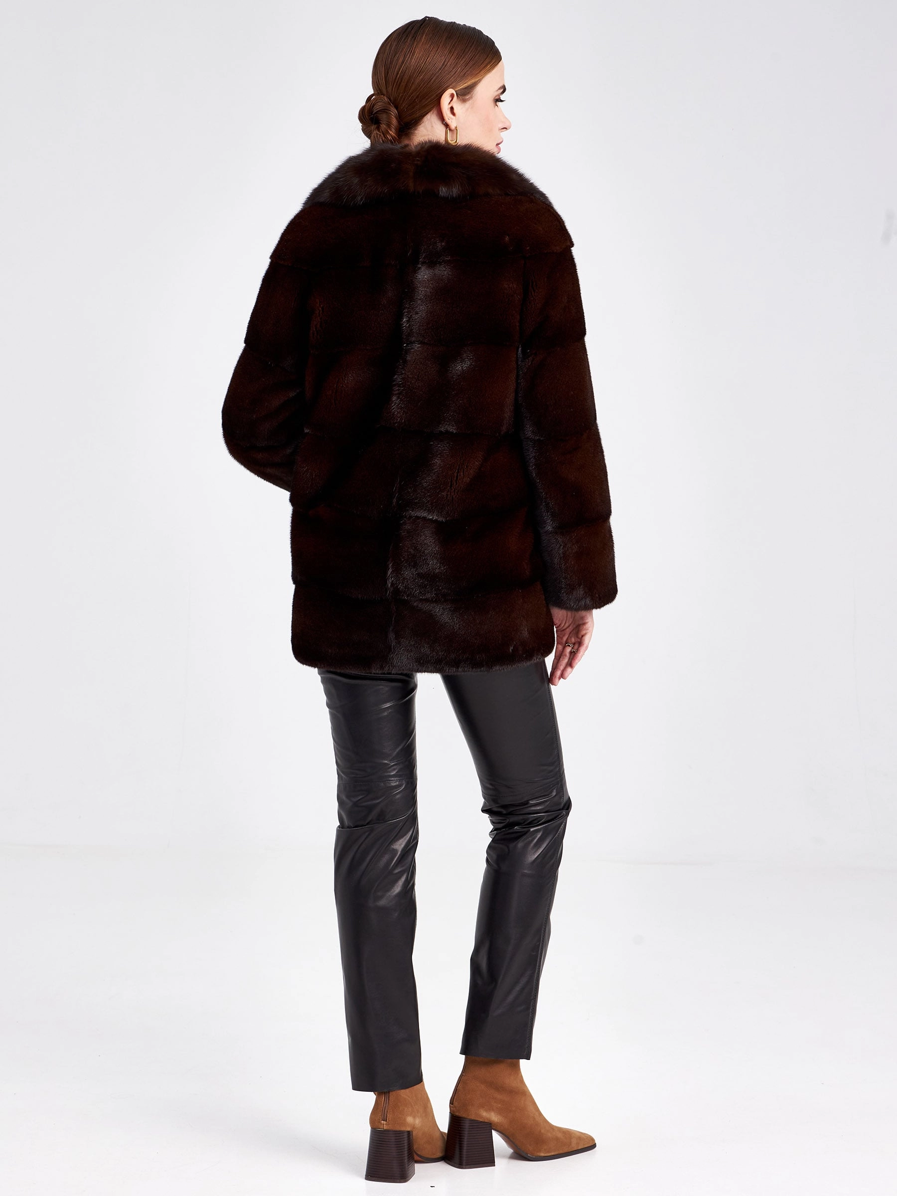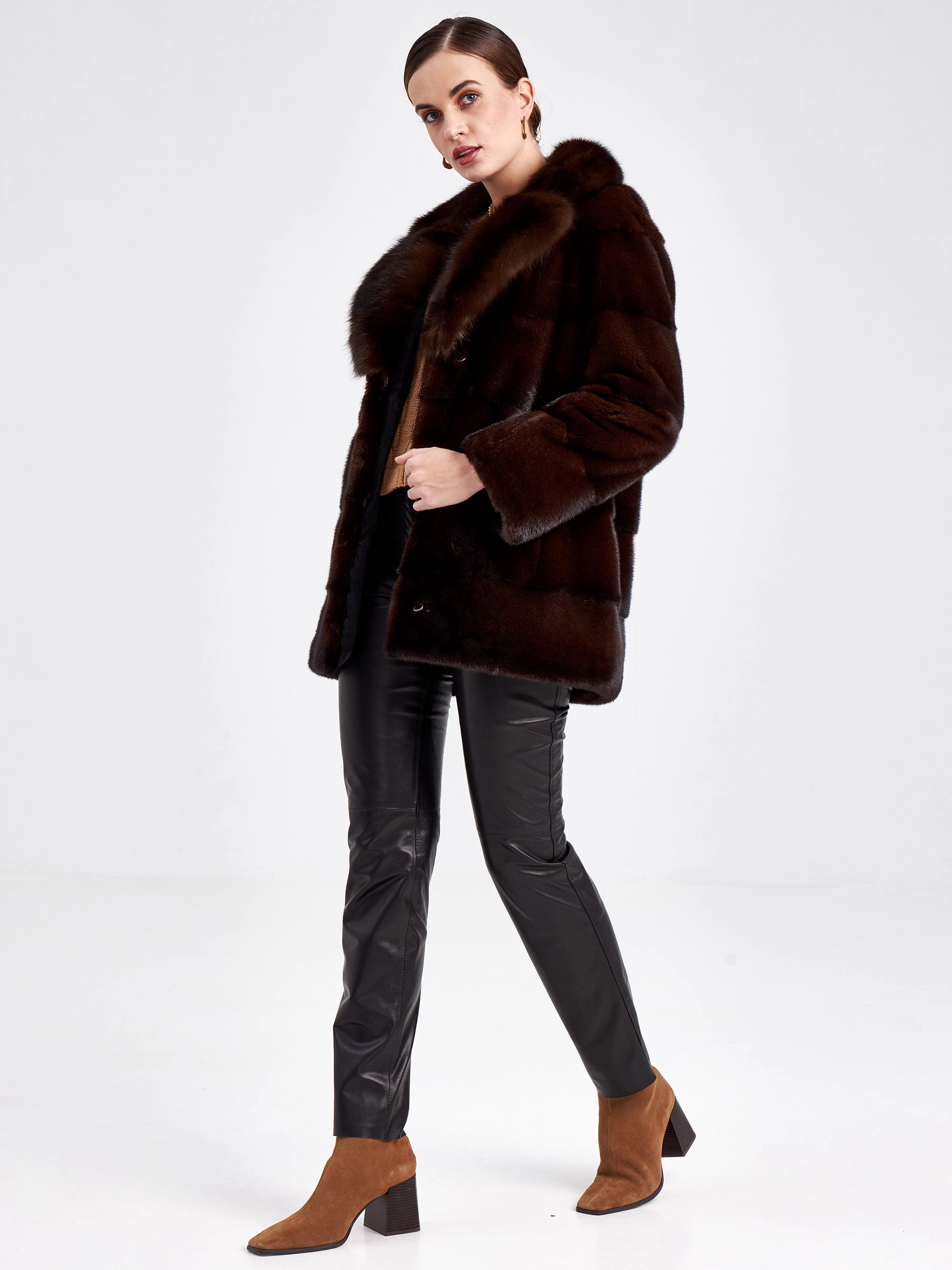 Товар шуба из меха норки женская 2а(авс), короткая, с воротником из меха соболя, коричневая, размер 44, артикул 33370 выполнен из норка крашенной с застежкой клипсы. Рассчитан на сезон: зима. Длина изделия 75 см, силуэт прямой.