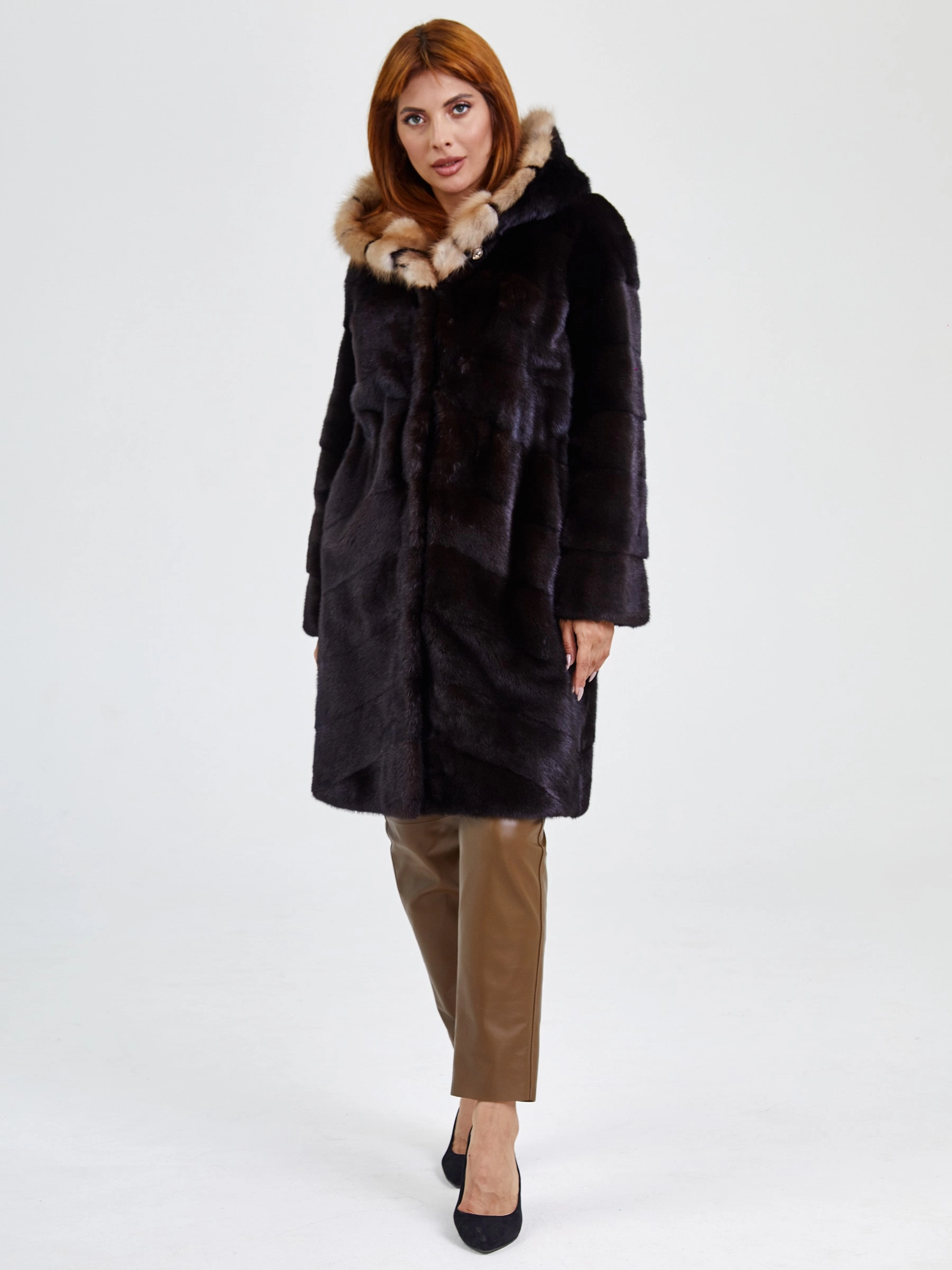 Элегантная шуба из натурального меха норки с капюшоном, отделанным мехом куницы. Прямой силуэт с утягивающей кулиской на талии обеспечивает идеальную посадку по фигуре, а поперечная пластинчатая раскладка меха подчеркивает современную эстетику. Глубокий неcъёмный капюшон — это дерзкая альтернатива головному убору, которая добавляет образу функциональности и стиля. Сочетайте с кожаными леггинсами и уггами для создания мощного повседневного образа, где роскошь встречается с комфортом.
