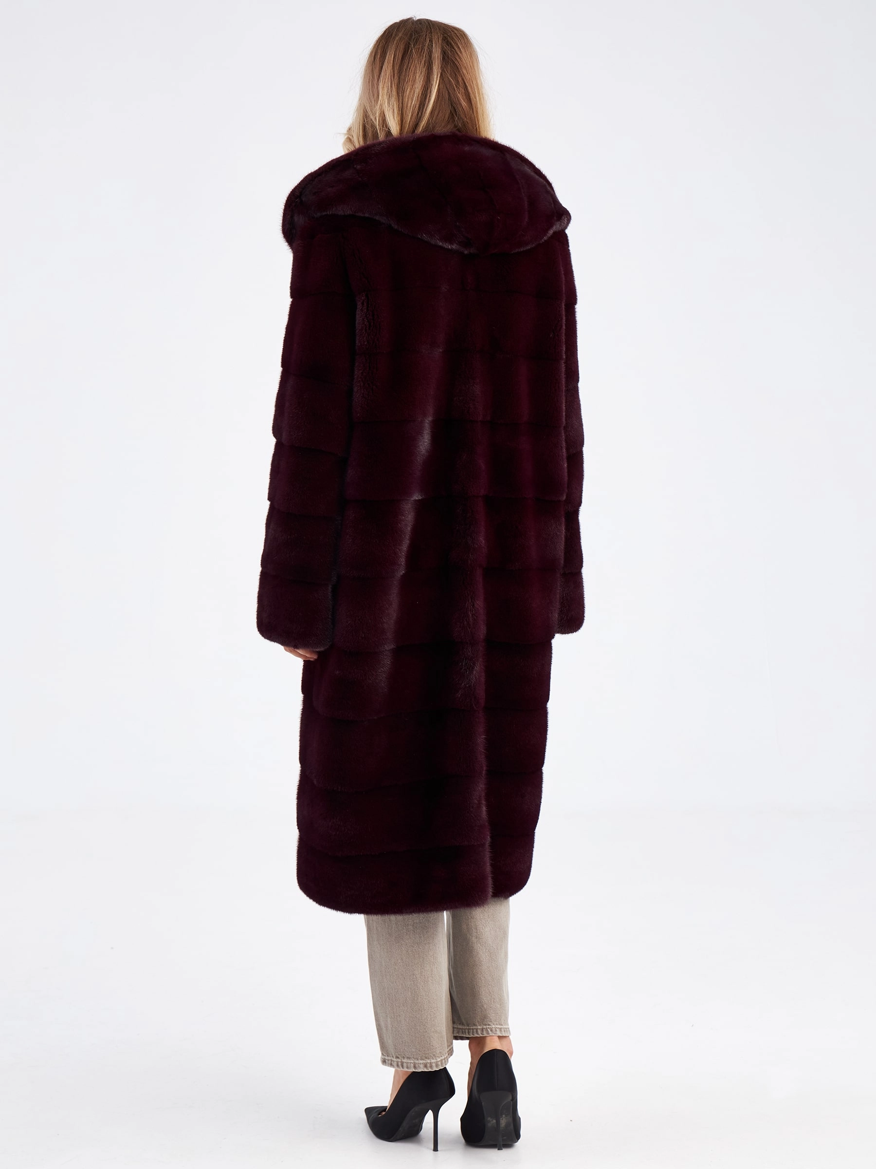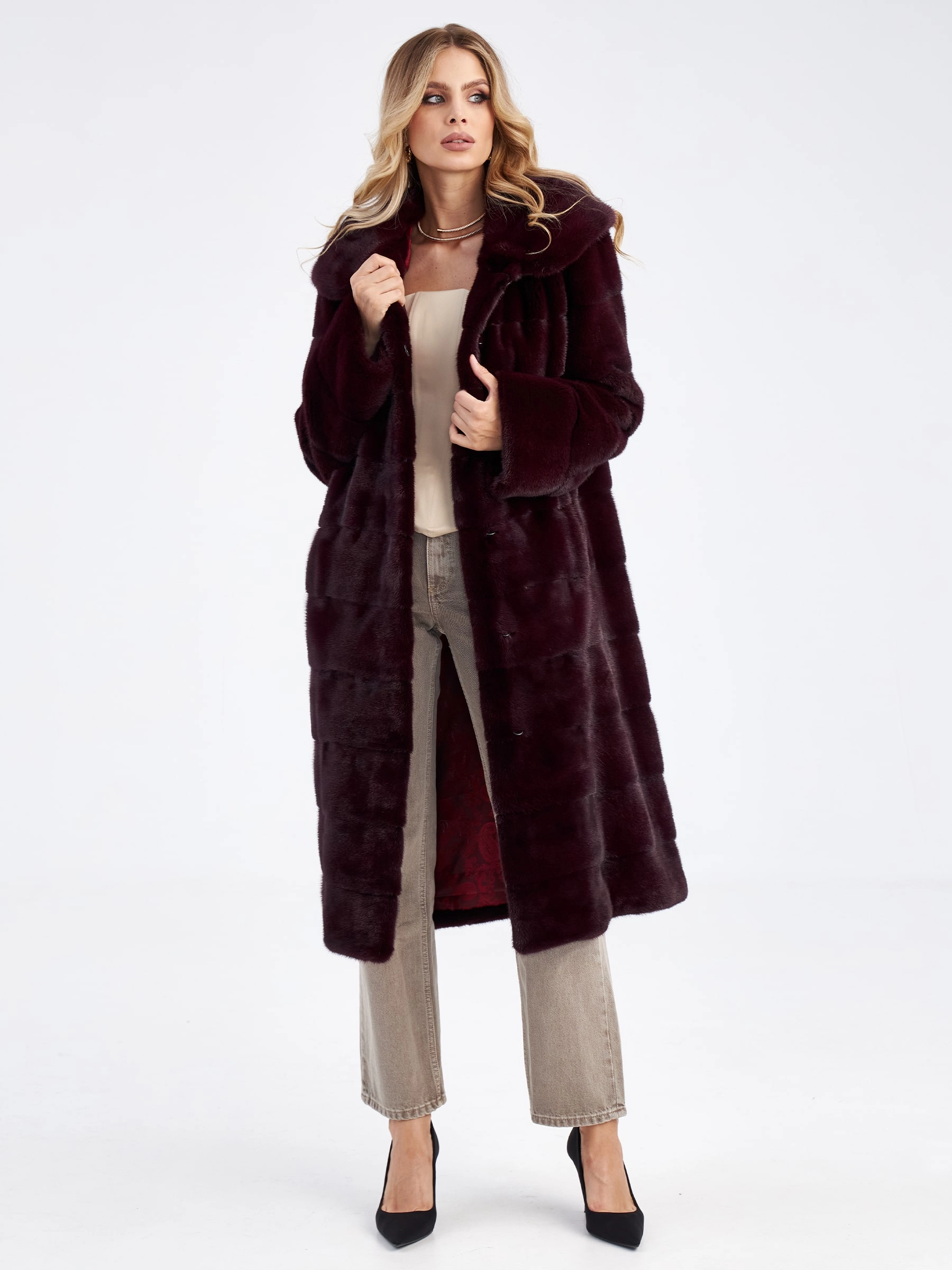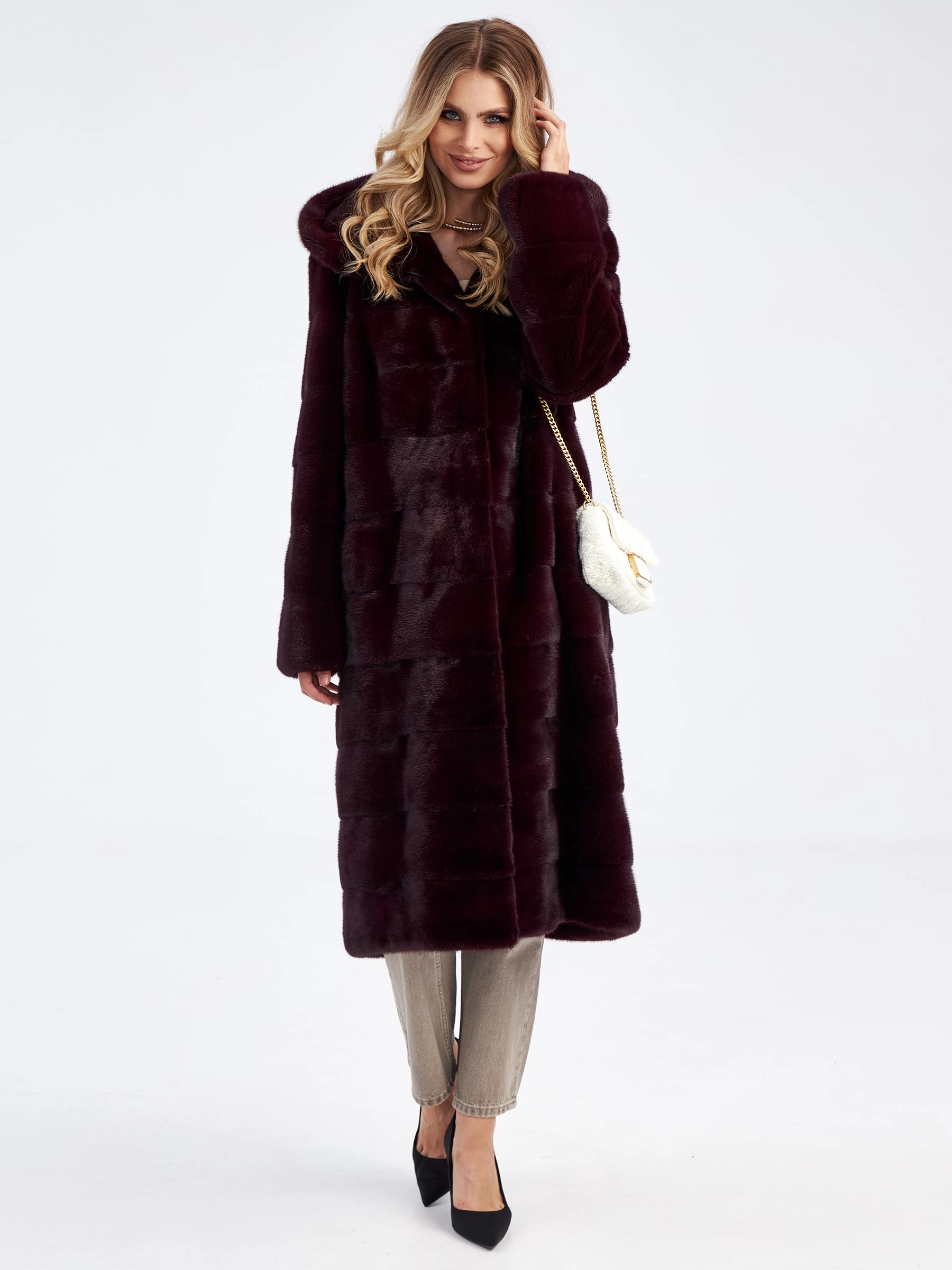 Длинная поперечная шуба из меха норки с капюшоном для женщин 2а(к), бордовая, размер 52, артикул 33850