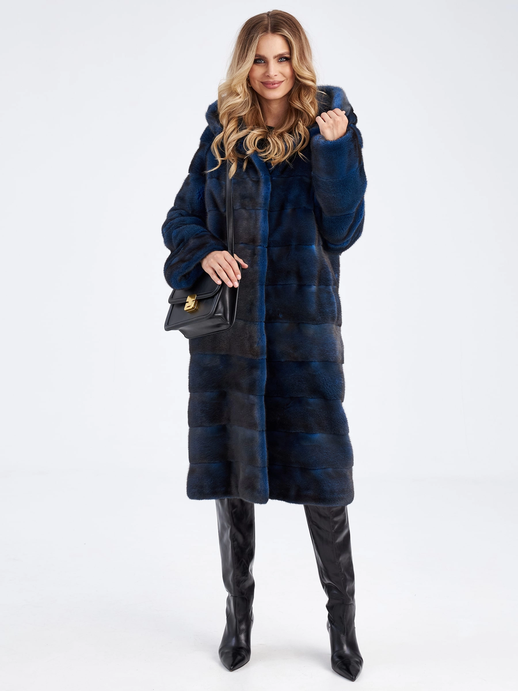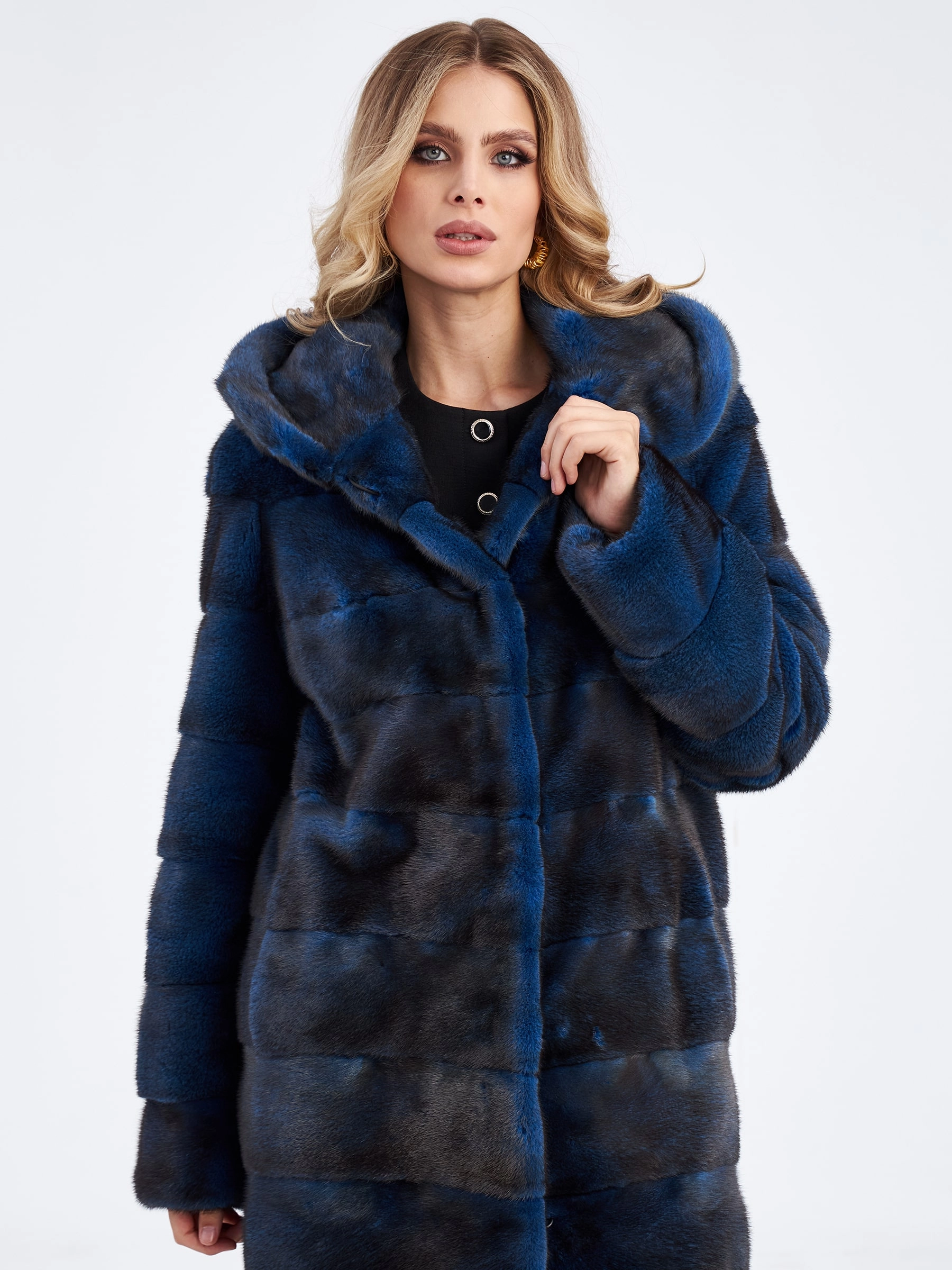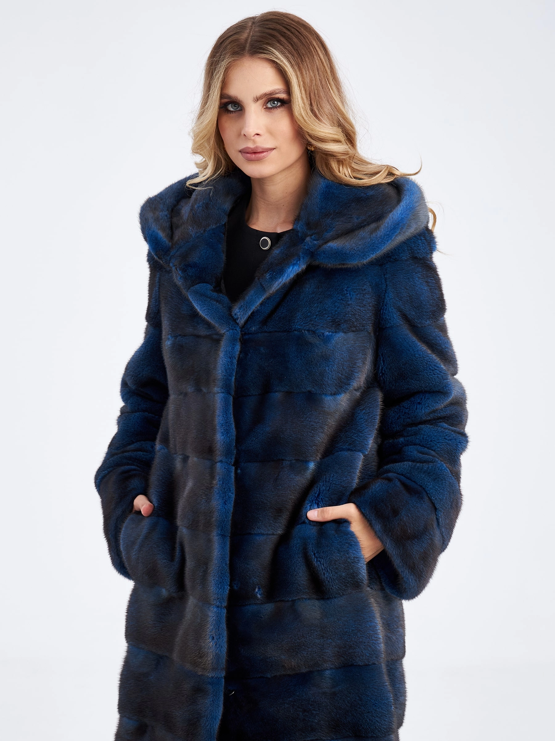 Длинная поперечная шуба из меха норки с капюшоном для женщин 2а(к), синяя, размер 48, артикул 33840