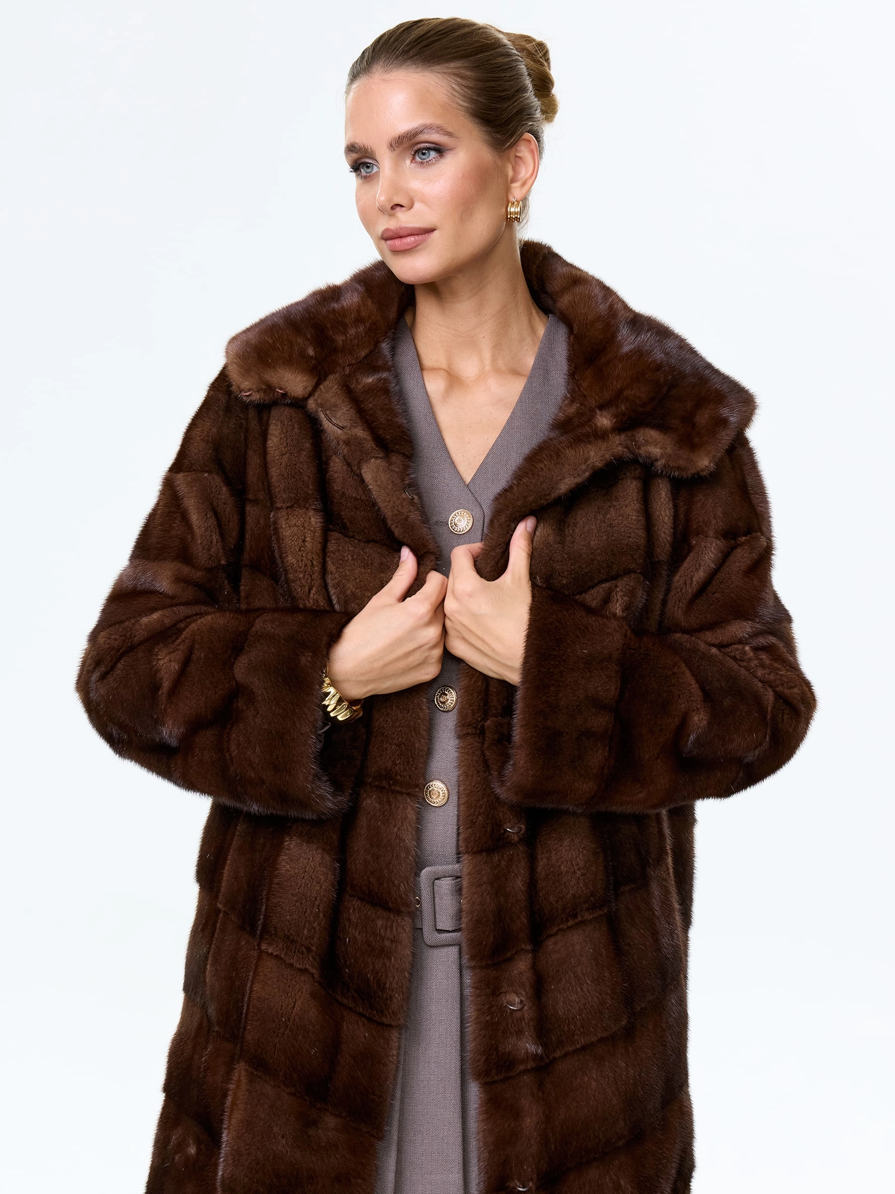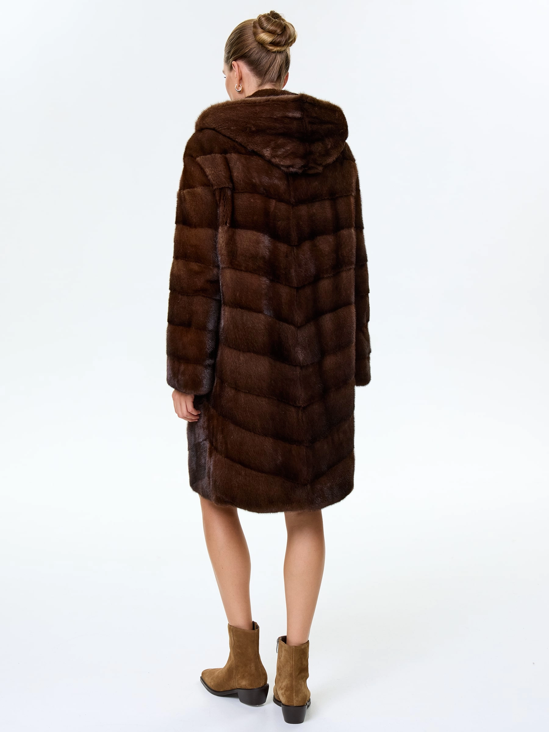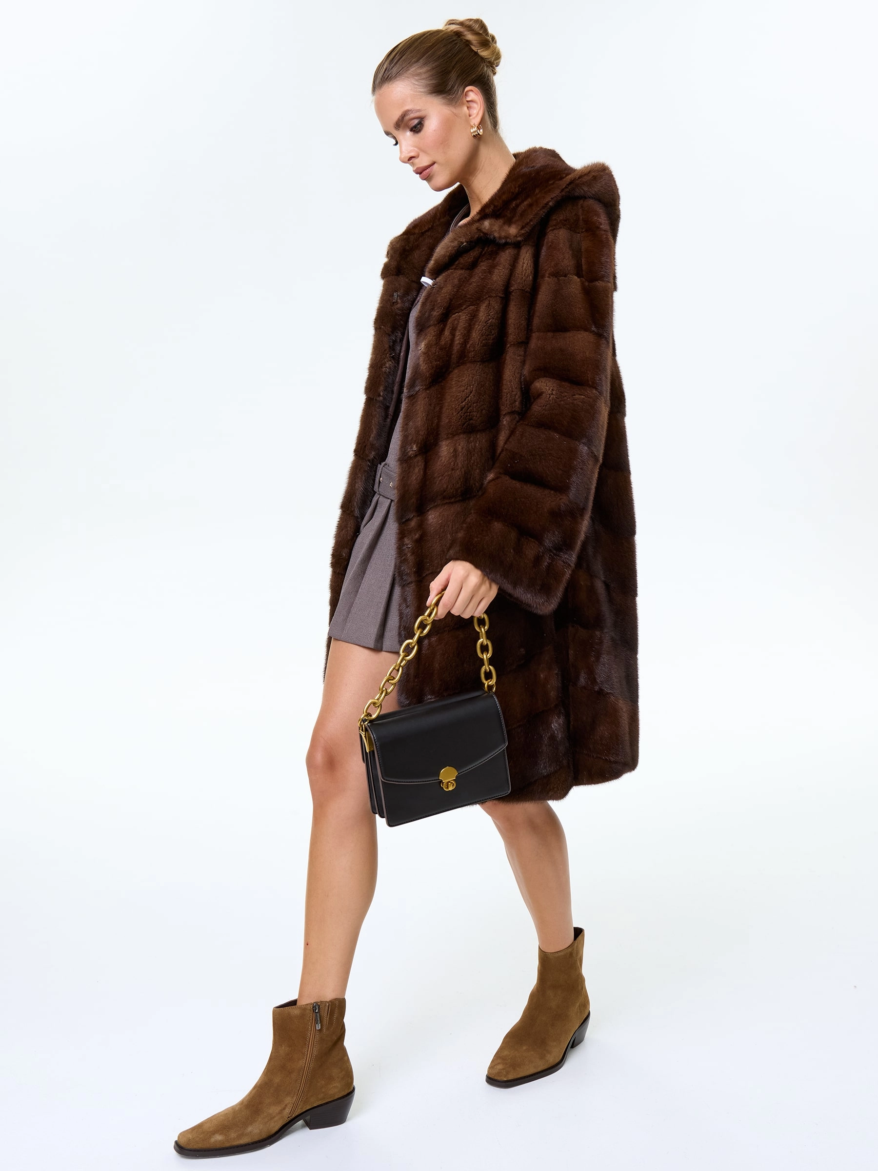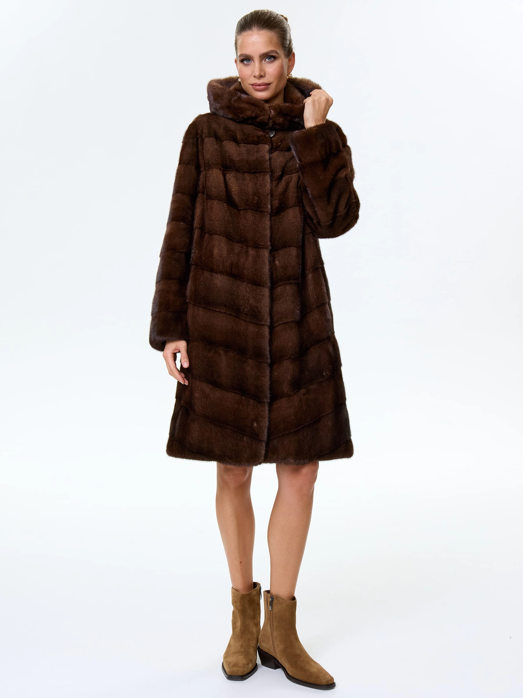 Товар норковая женская шуба с капюшоном галя(к), коричневая, размер 50, артикул 34070 выполнен из норка с застежкой клипсы. Рассчитан на сезон: зима. Длина изделия 100 см, силуэт прямой.