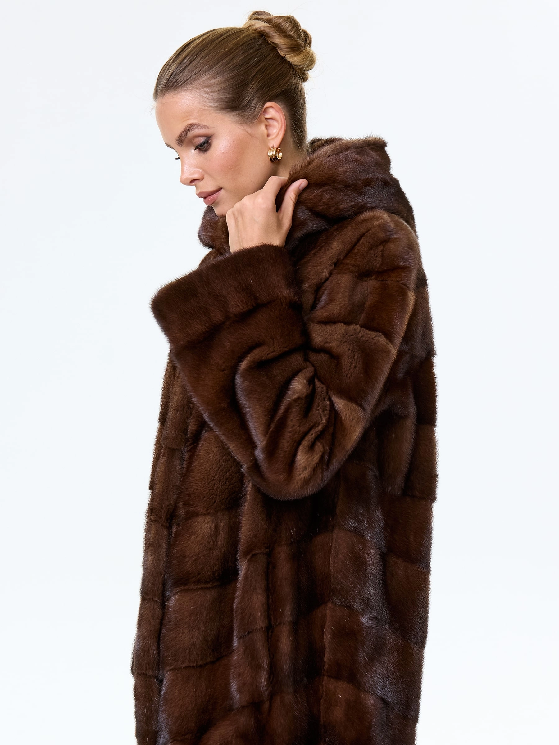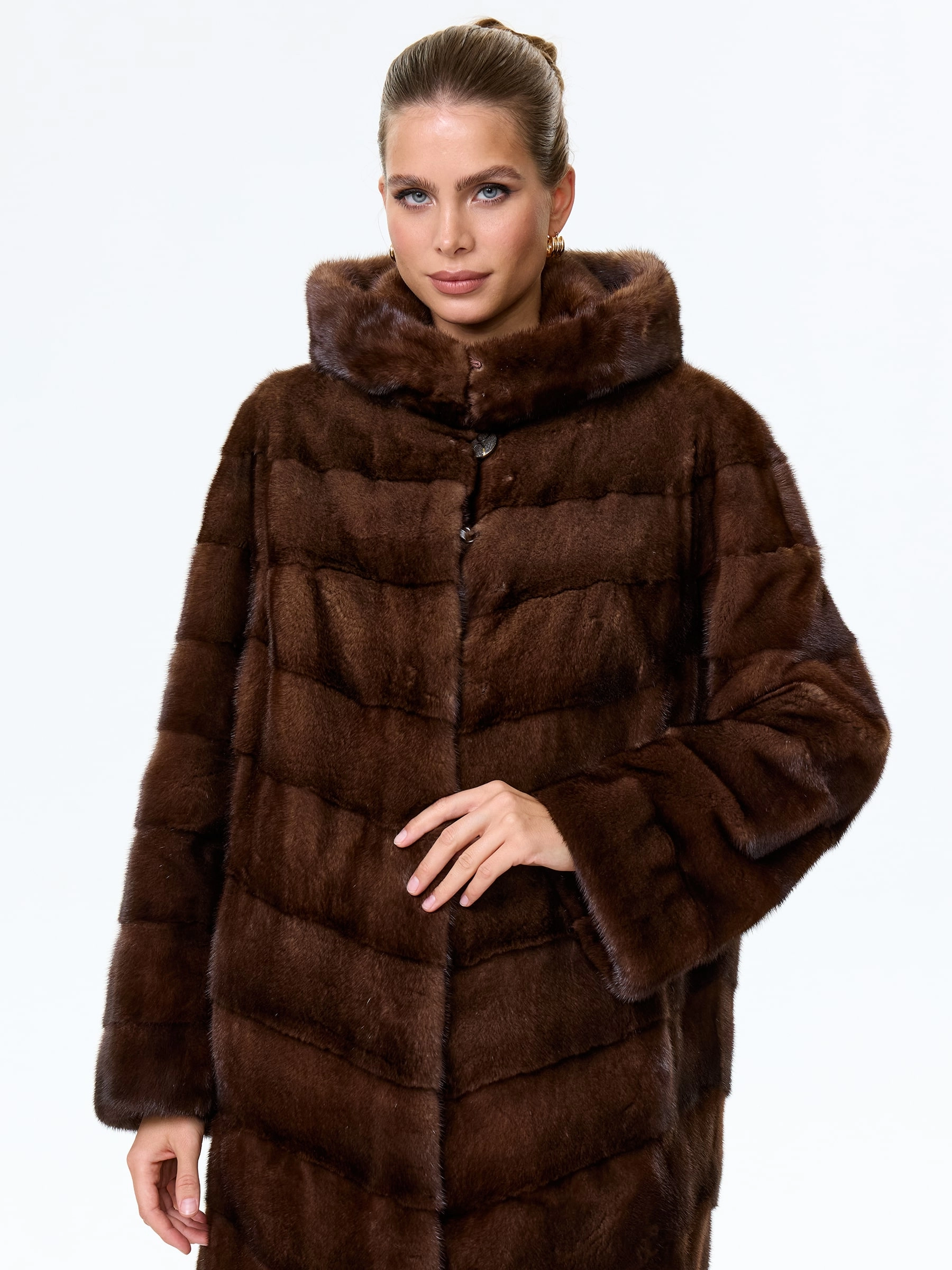 Для пошива шубы прямого кроя использовали шелковистый мех норки. Модель дополнили двумя боковыми карманами и объемным капюшоном. Изделие застегивается клипсами.