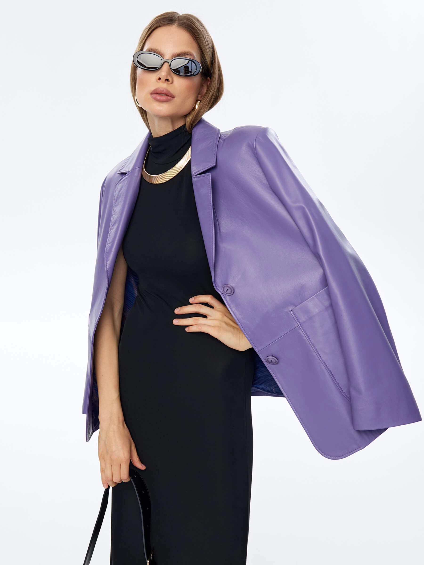Элегантный пиджак длиной 70 см из нежнейшей натуральной кожи сиреневого оттенка. Прямой силуэт с английским воротником и застёжкой на пуговицах создаёт сдержанный образ, а накладные карманы подчёркивают лаконичный дизайн. Идеальная посадка по фигуре и ювелирная работа мастеров обеспечивают премиальное качество. Сочетайте с кожаными брюками для монохромного ансамбля, джинсами-скинни для повседневного стиля или шёлковым платьем для элегантного контраста!
