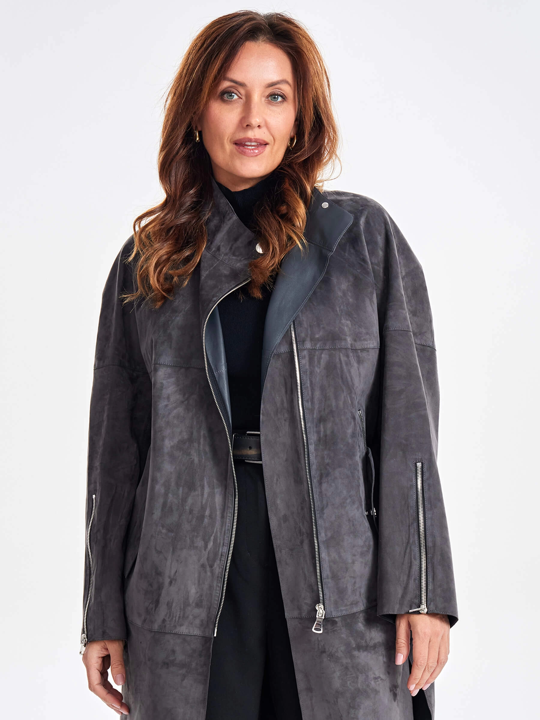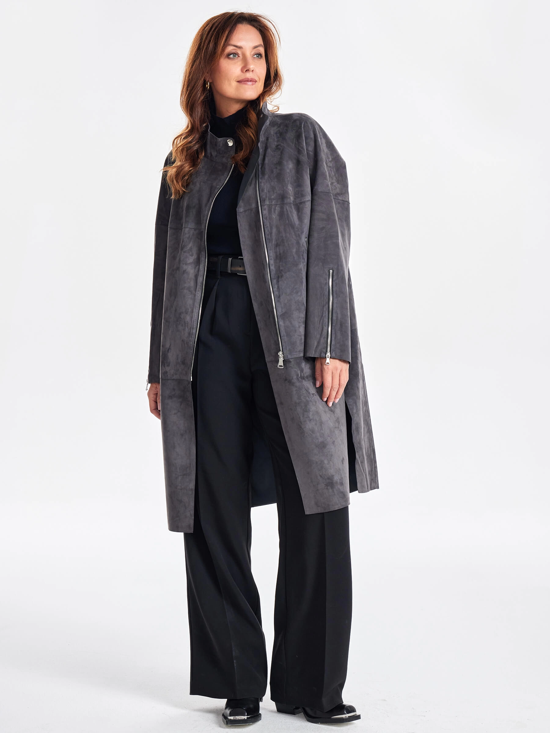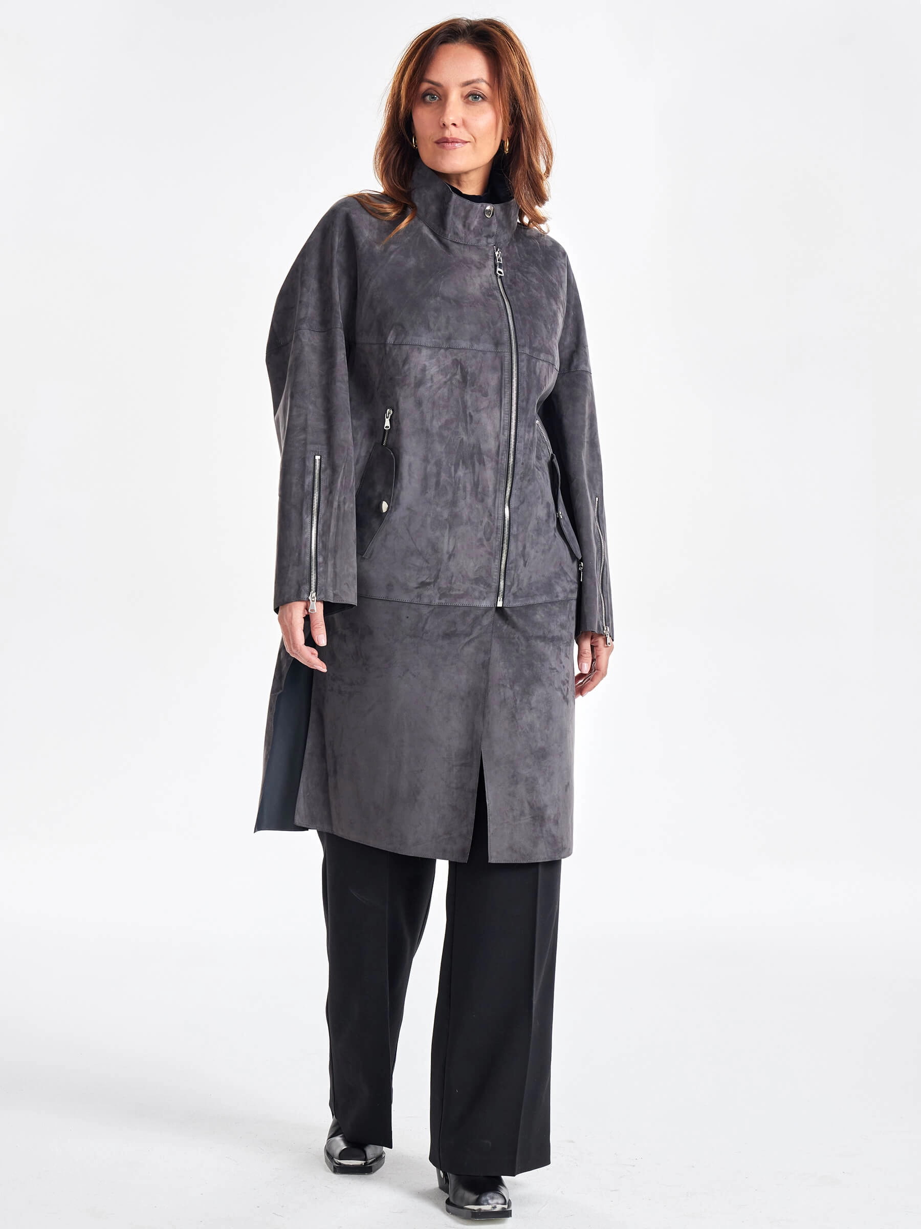 Товар стильное замшевое пальто оверсайз для женщин премиум класса 3041з, серое, размер 54, артикул 64100 выполнен из натуральной замши с застежкой молния. Рассчитан на сезон: весна-лето. Длина изделия 105 см, силуэт оверсайз.