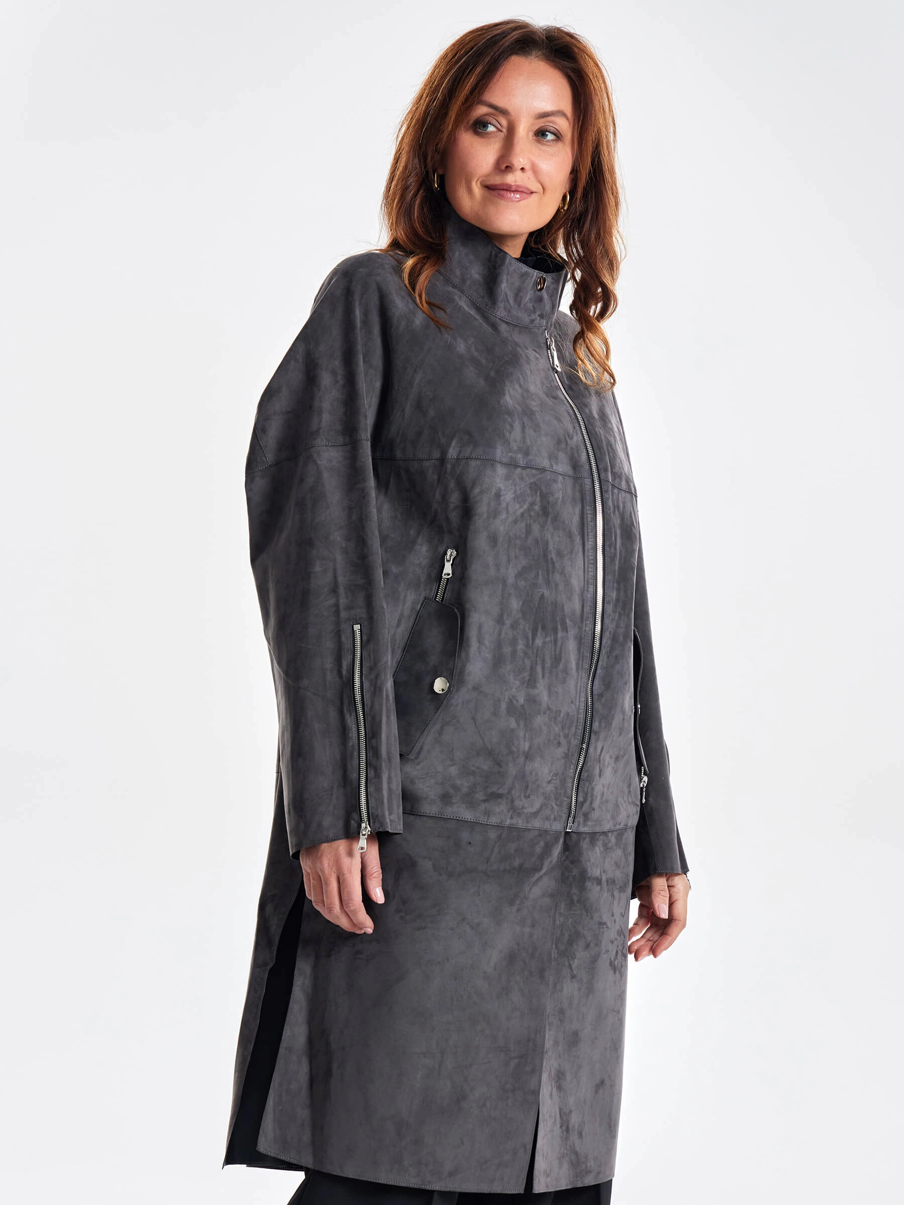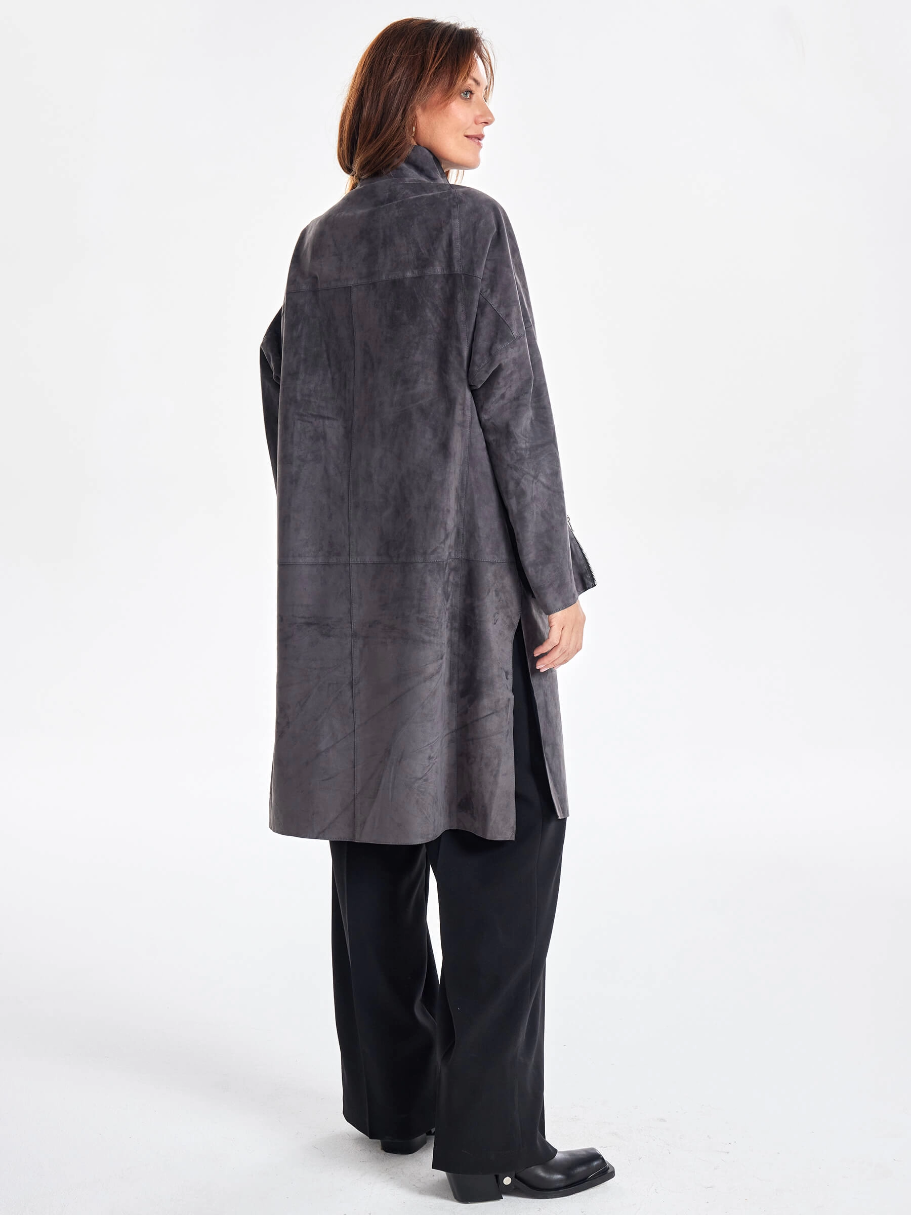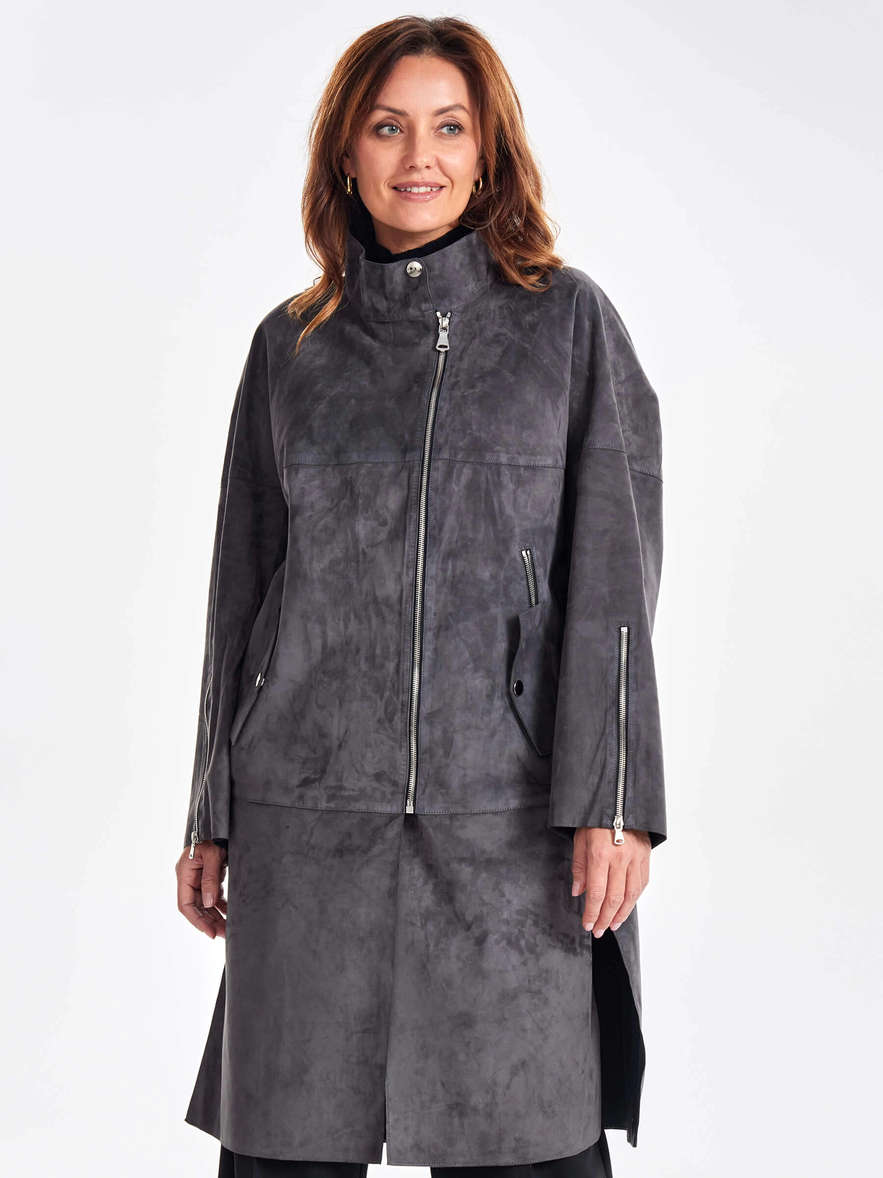 Товар стильное замшевое пальто оверсайз для женщин премиум класса 3041з, серое, размер 54, артикул 64100 выполнен из натуральной замши с застежкой молния. Рассчитан на сезон: весна-лето. Длина изделия 105 см, силуэт оверсайз.