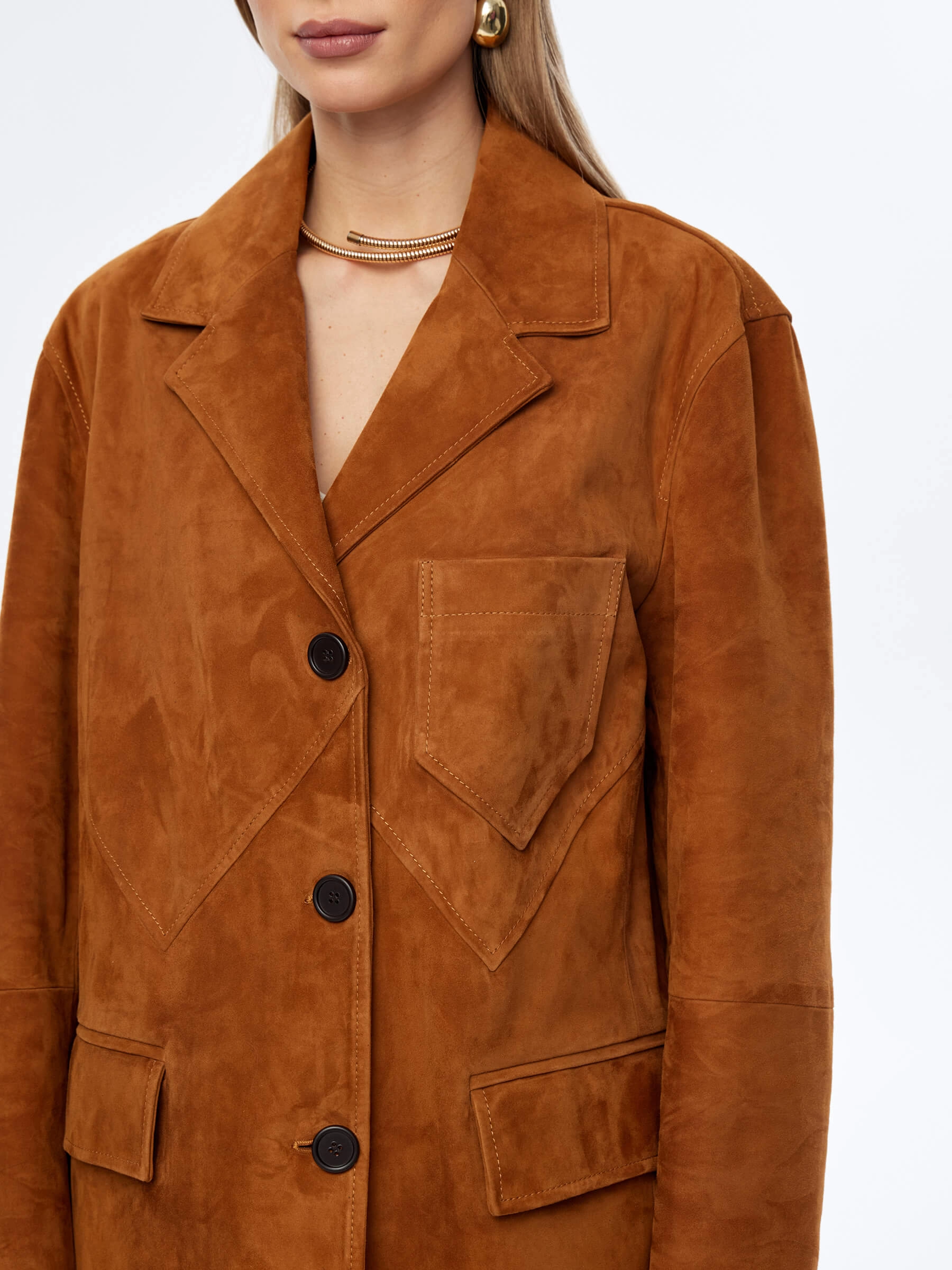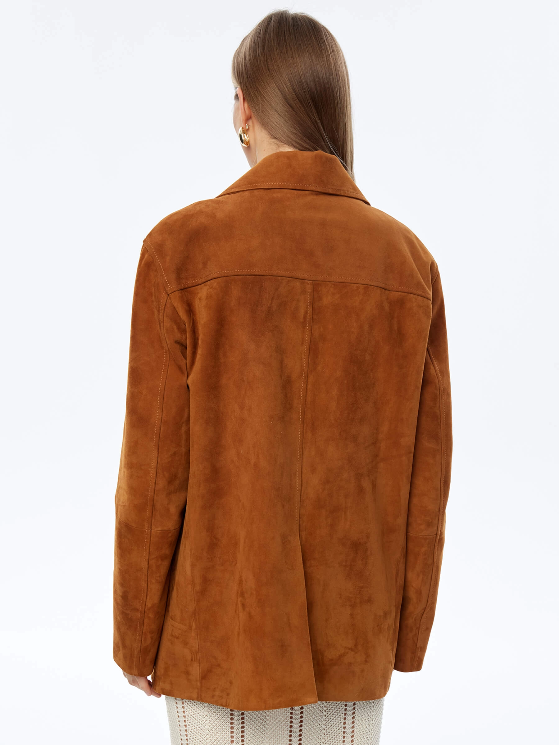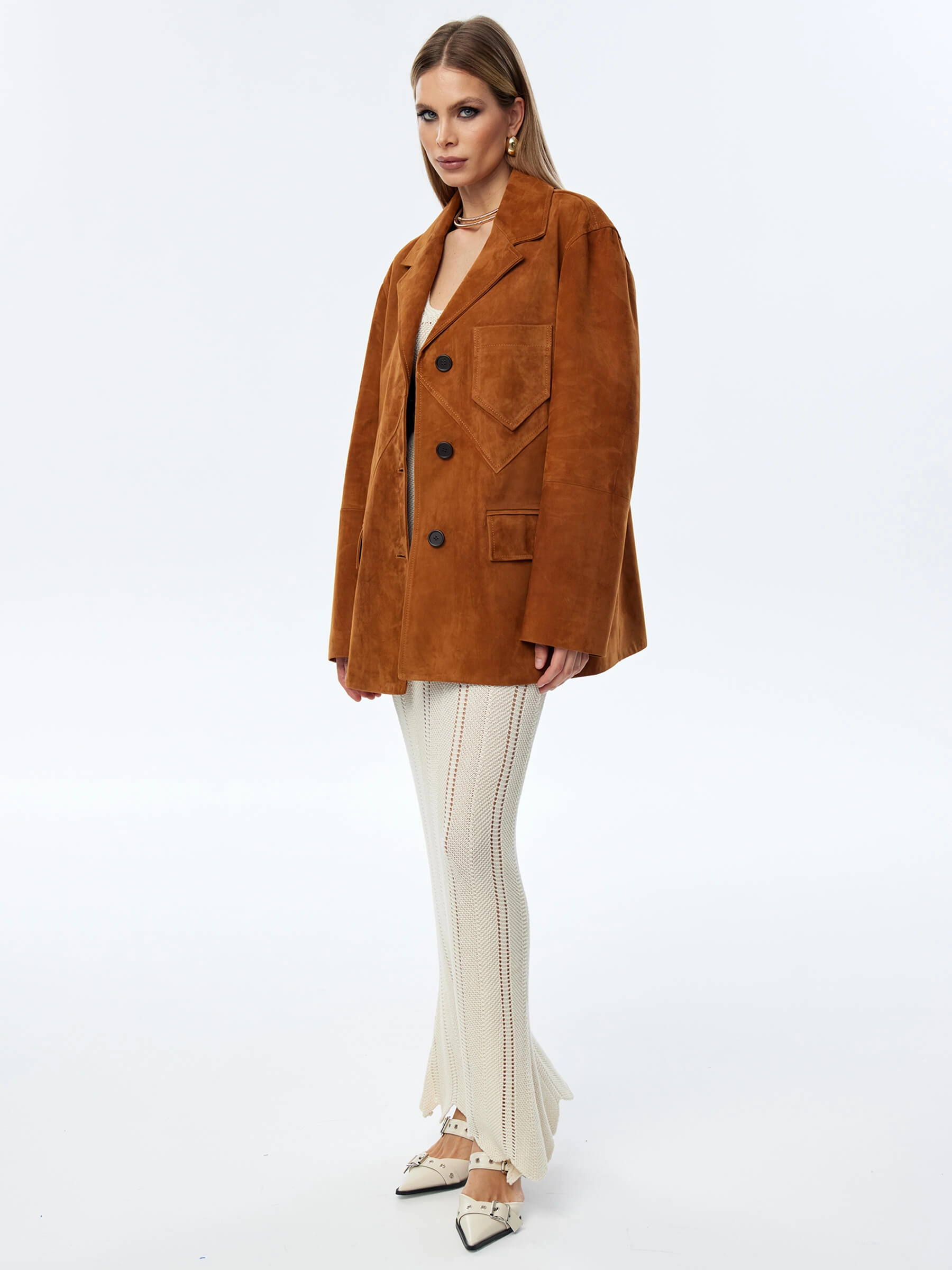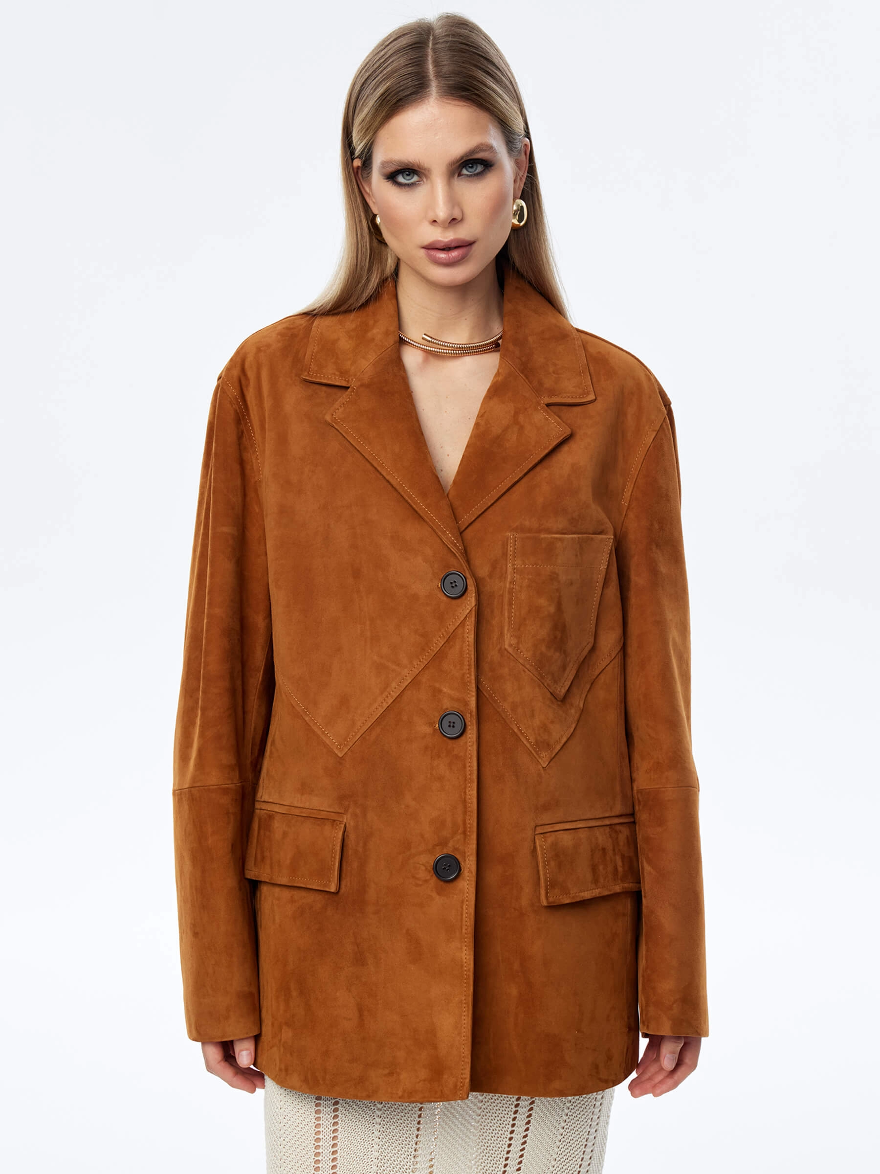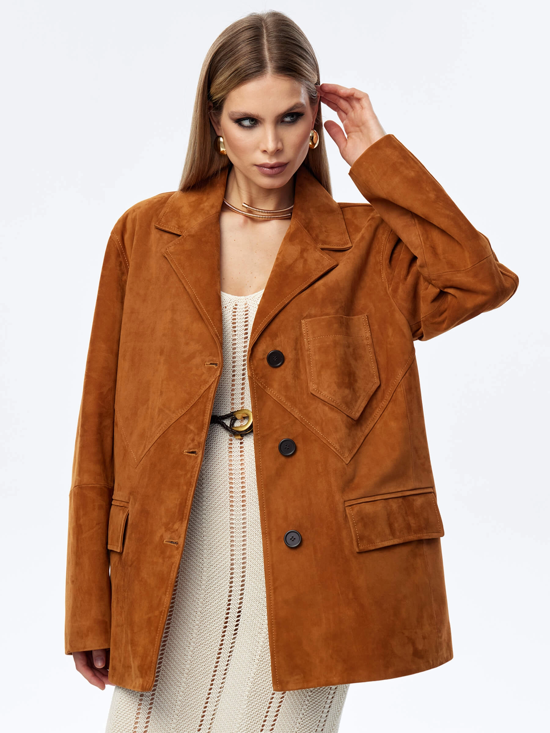 Стильный удлиненный замшевый женский пиджак премиум класса 3069з, виски, размер 44, артикул 23840
