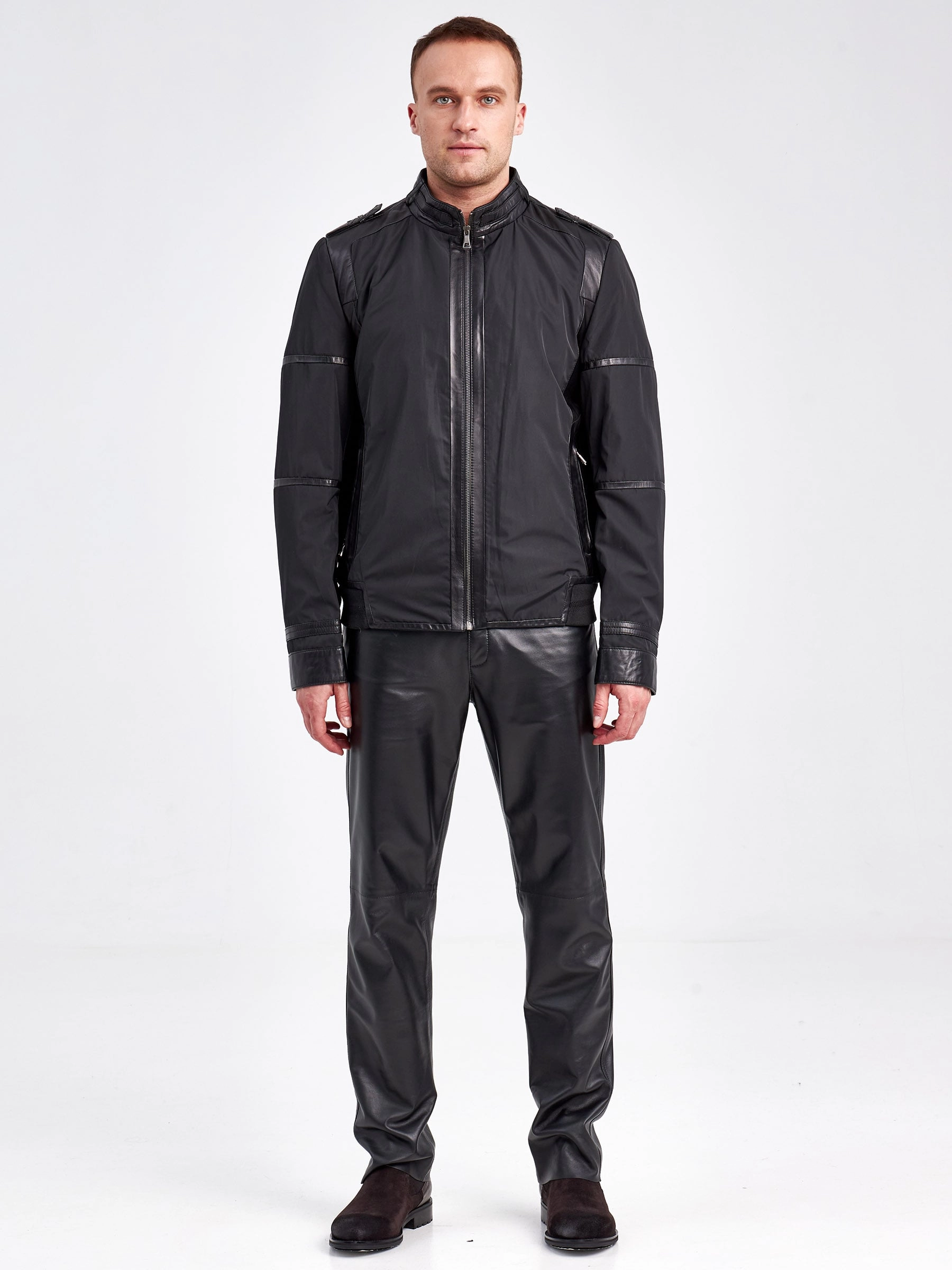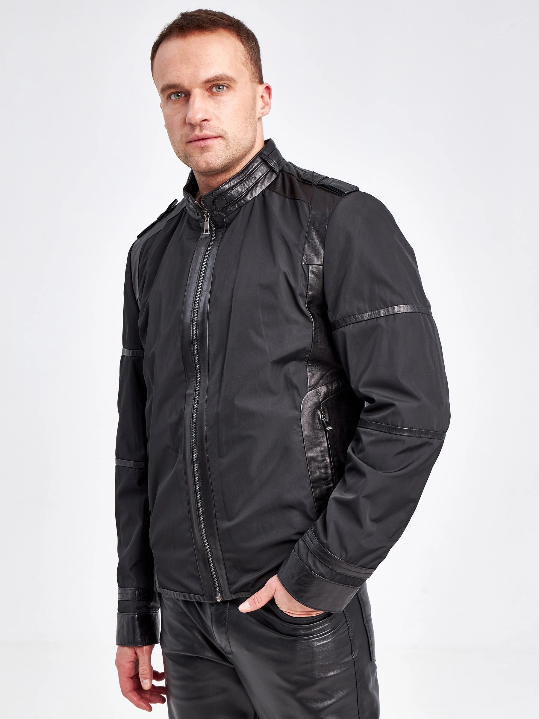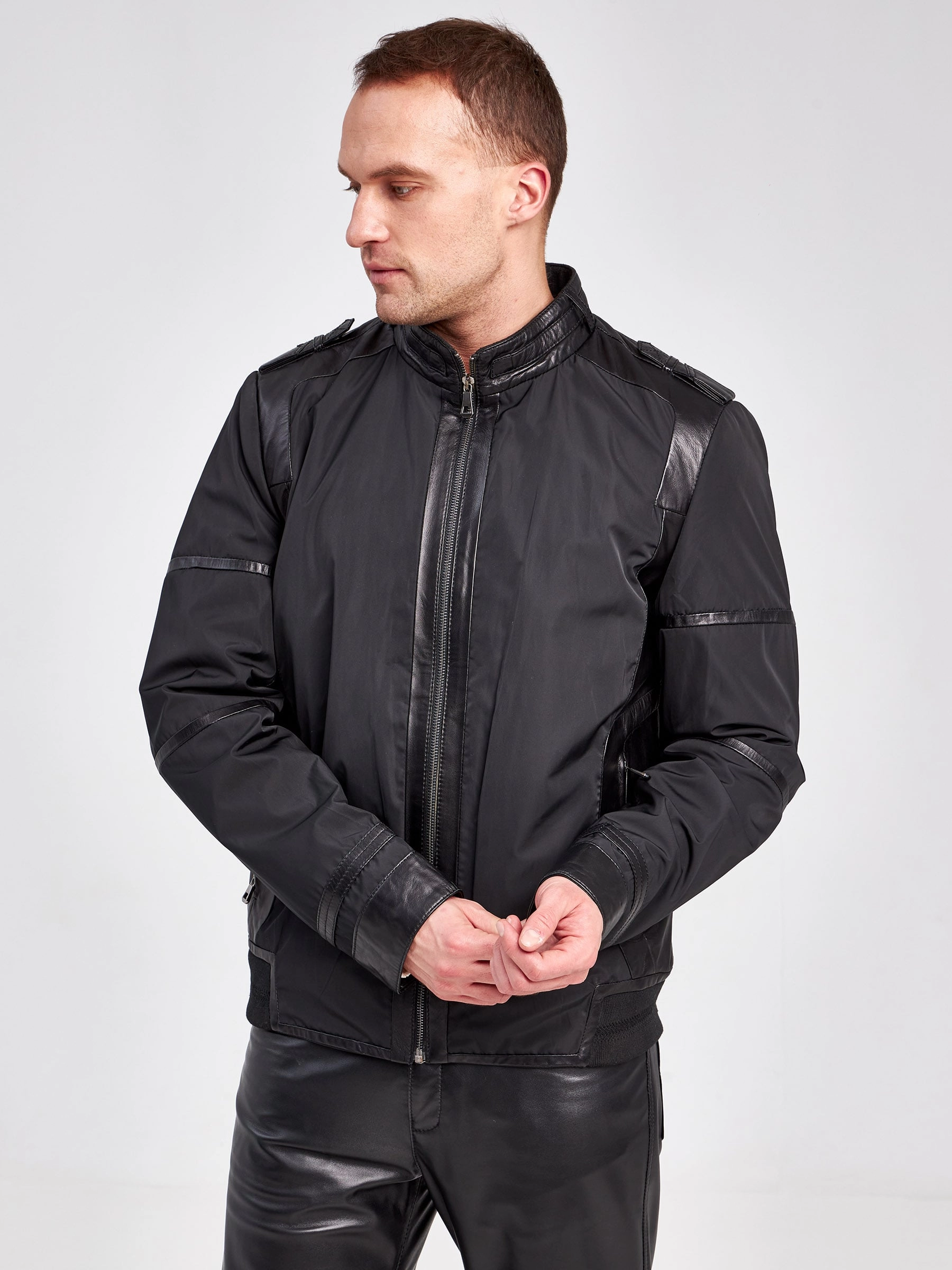 Современная мужская демисезонная куртка с отделками из натуральной кожи.