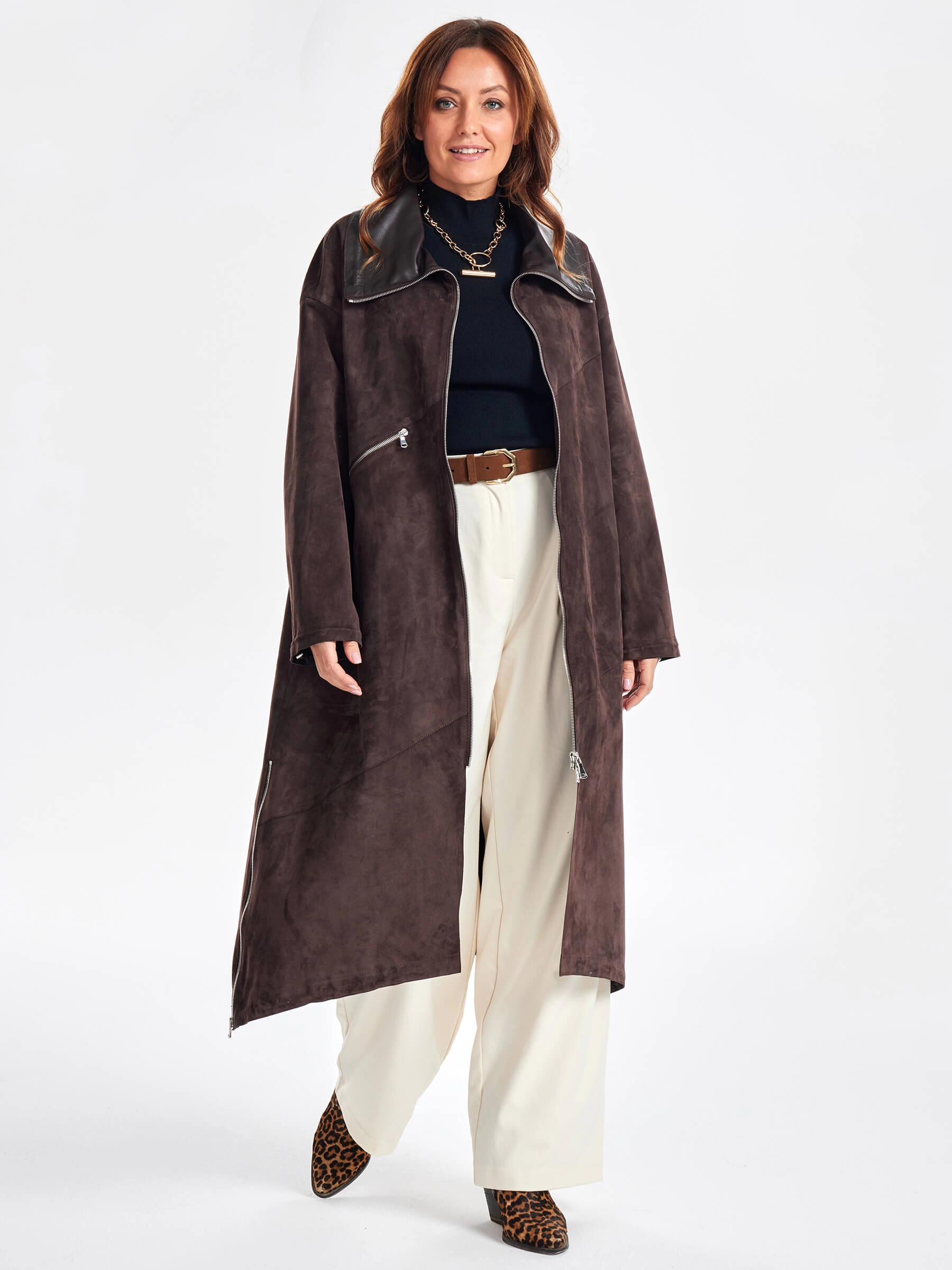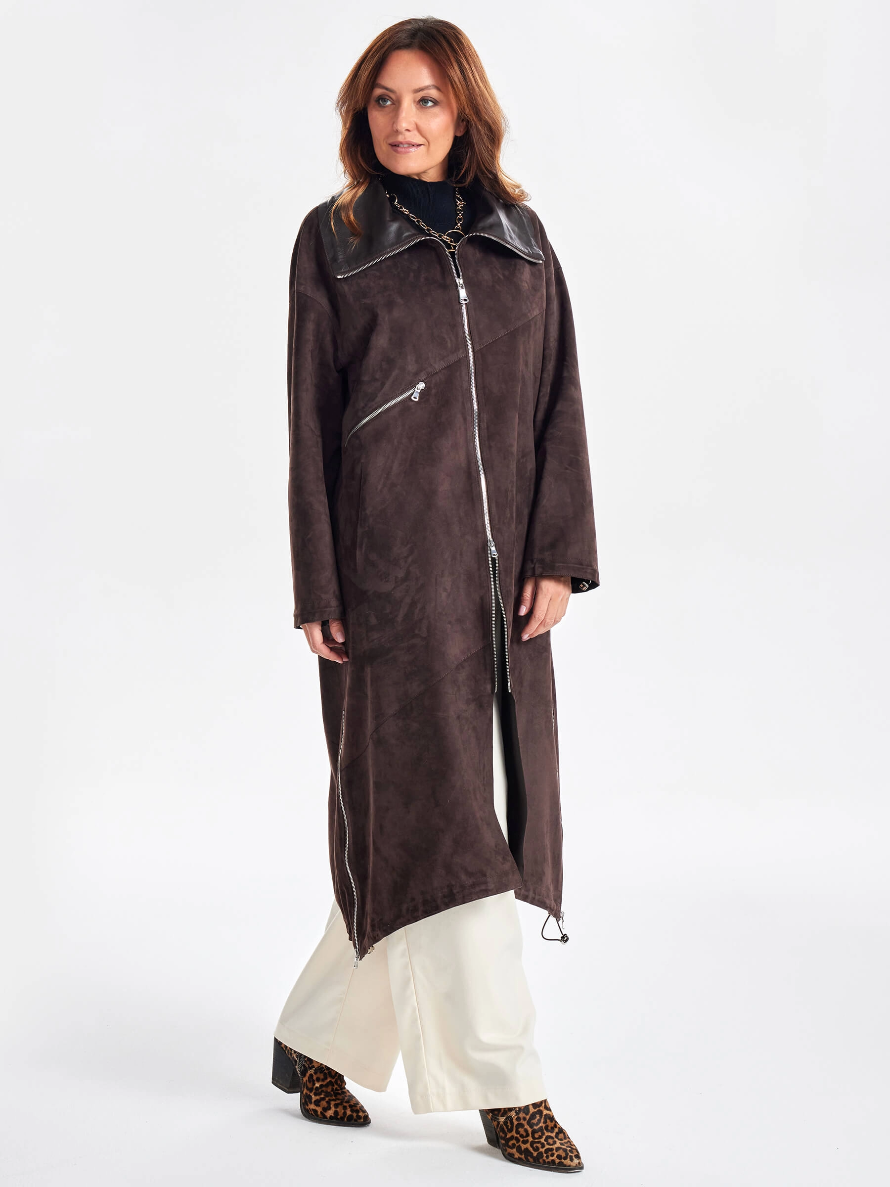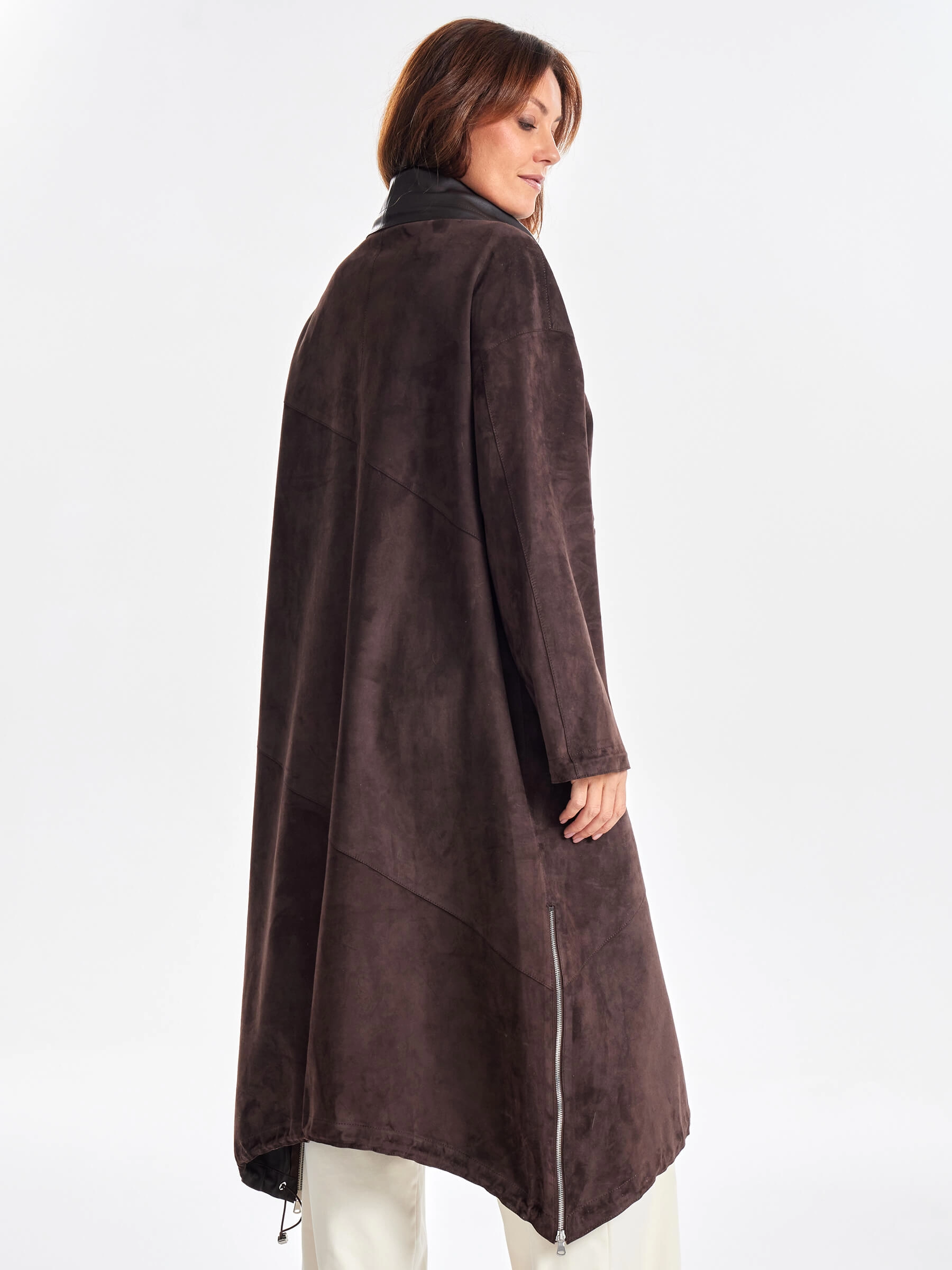 Товар трендовое женское замшевое пальто оверсайз премиум класса 3061з, коричневое, размер 50, артикул 63430 выполнен из натуральной замши с застежкой молния. Рассчитан на сезон: весна-лето. Длина изделия 115 см, силуэт оверсайз.