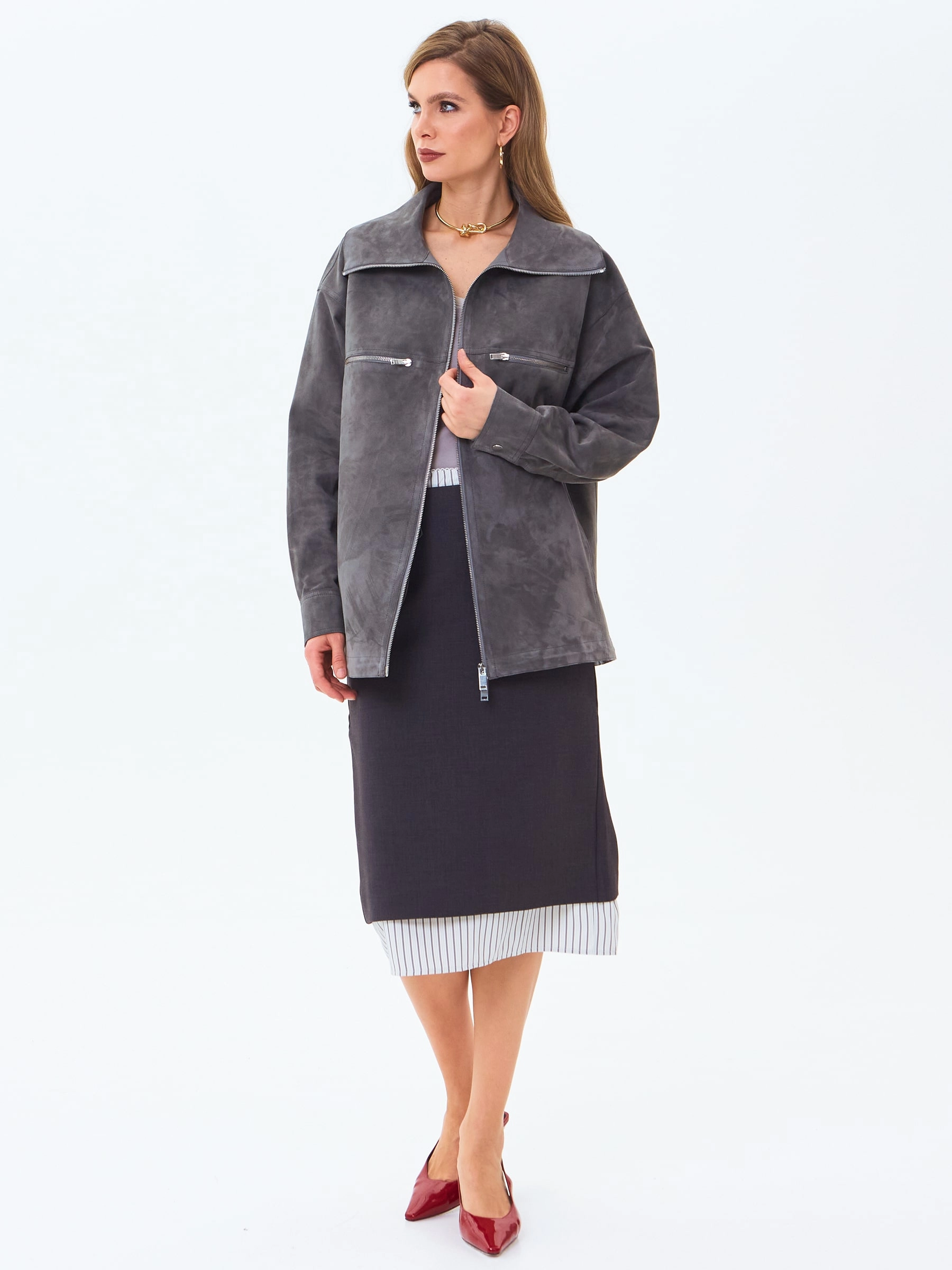 Товар удлиненная женская замшевая куртка премиум класса 3084з, серая, размер 46, артикул 24680 выполнен из натуральной замши с застежкой молния. Рассчитан на сезон: весна-лето. Длина изделия 71 см, силуэт свободный.