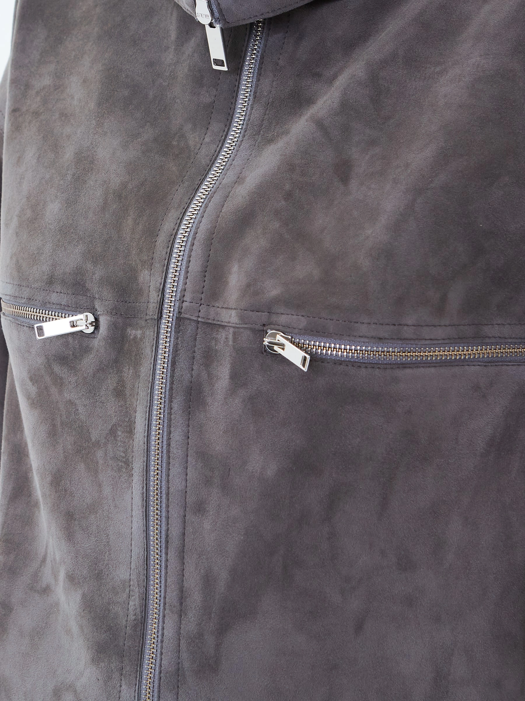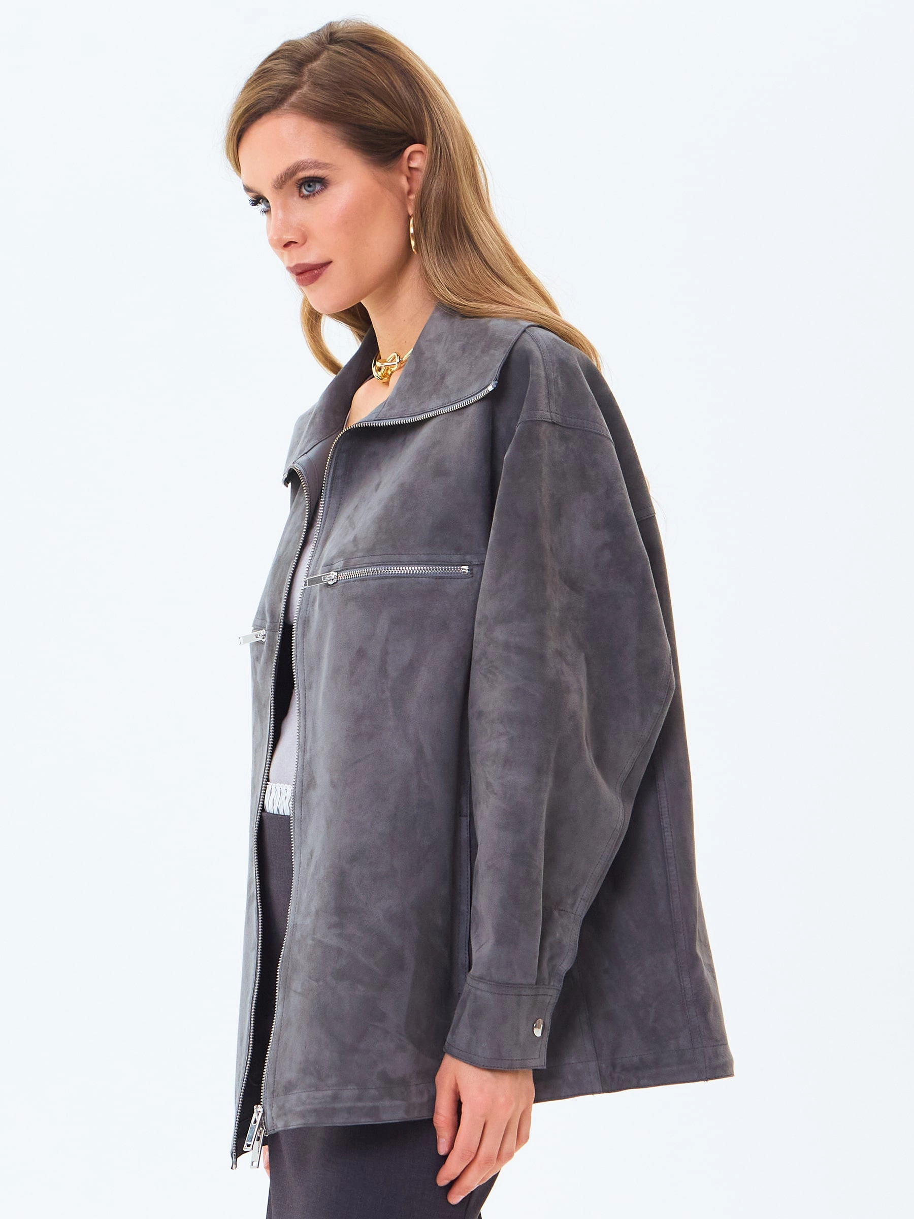 Куртку со спущенной линией плеч свободного кроя, выполнили из тонкой замши премиум класс. Высокий воротник стойку можно легко изменить на отложной. Модель с двумя боковыми карманами застегивается крупной двухзамковой молнией.