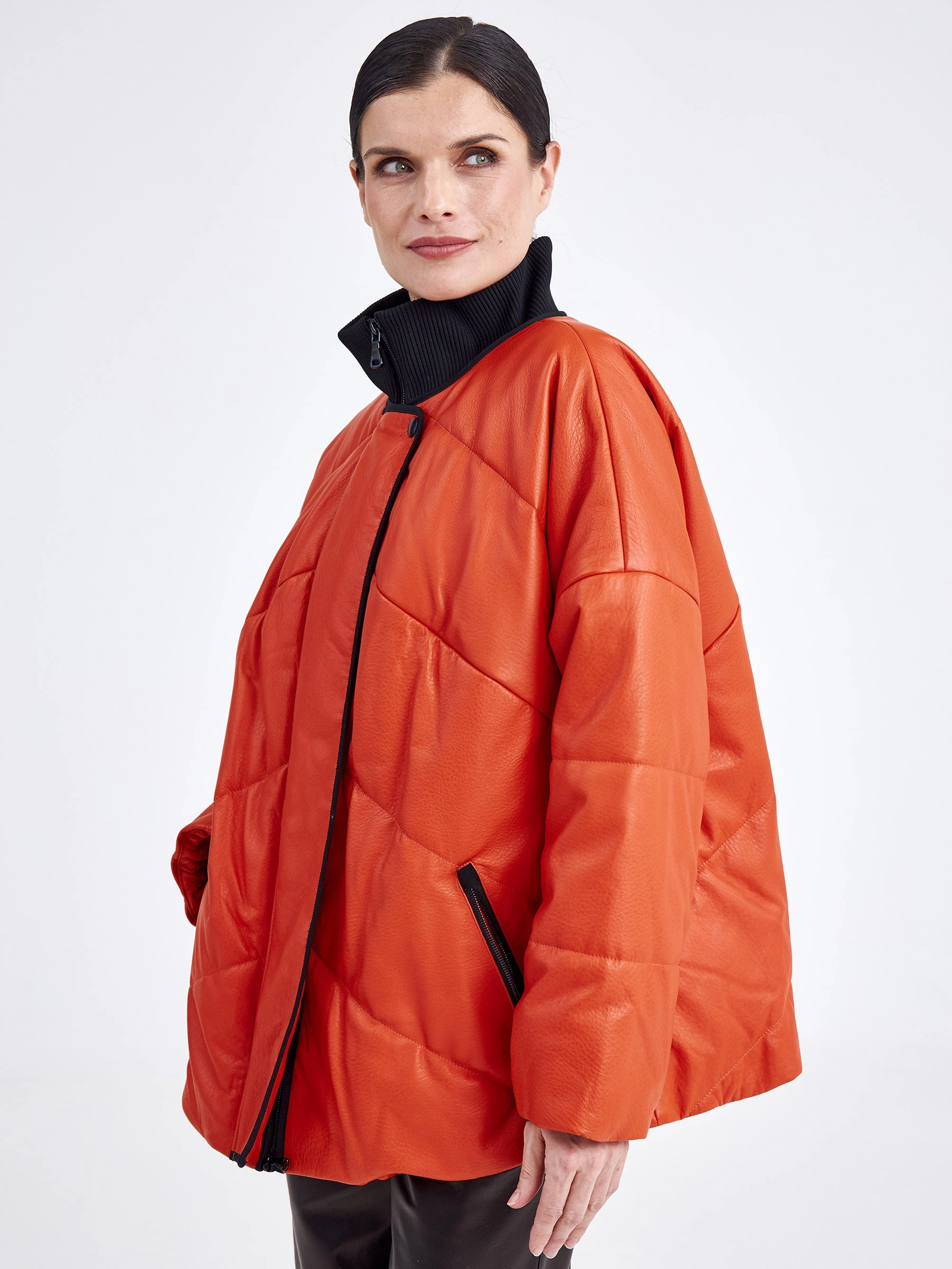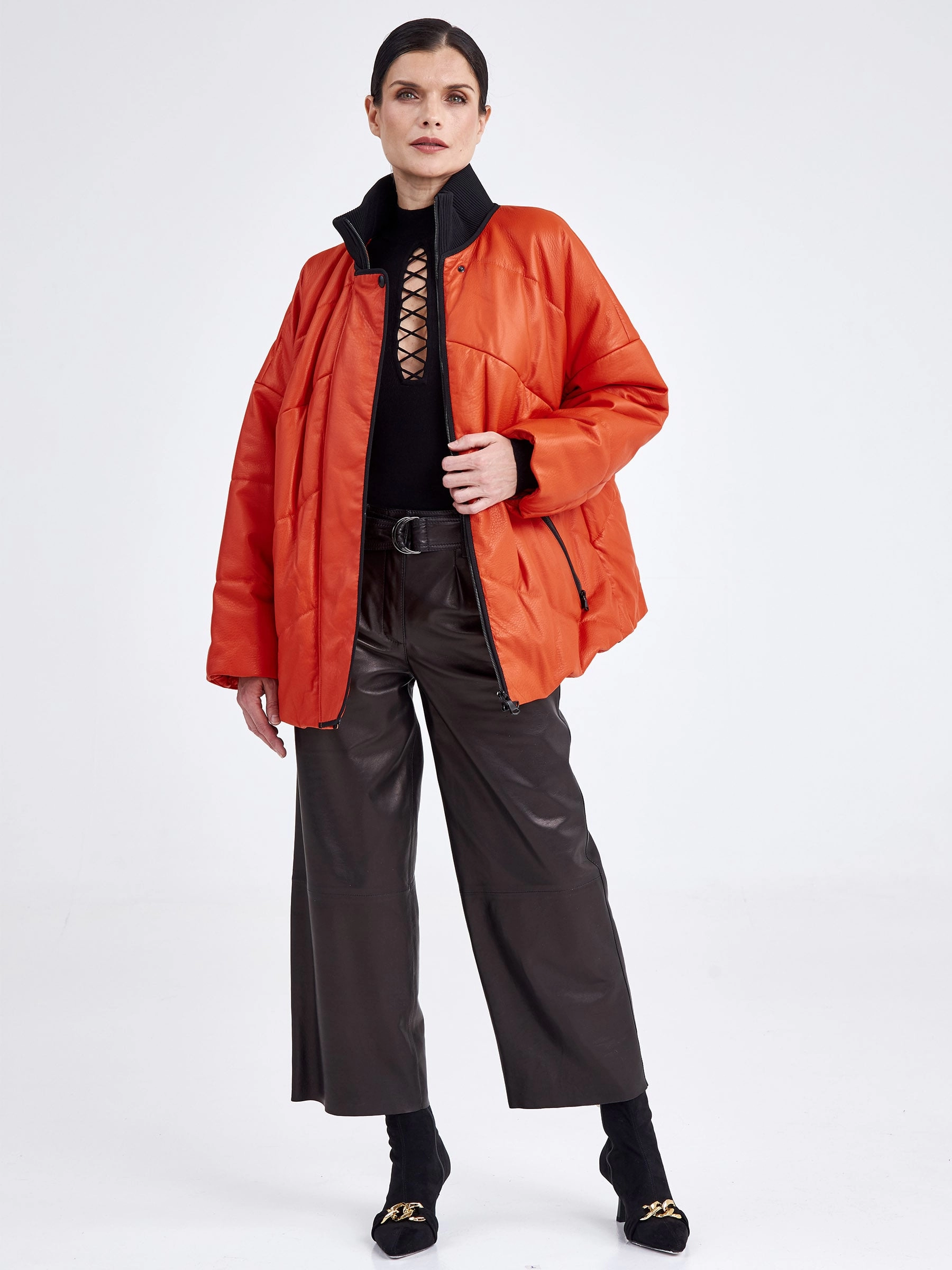 Короткий пуховик свободного кроя длиной до середины бедра (51–74 см) сшит из натуральной кожи насыщенного оранжевого цвета, который заряжает энергией и улучшает настроение. Лаконичный дизайн без декора и застёжка-молния с ветрозащитным клапаном делают модель универсальной, а высокая стойка из плотного трикотажа обеспечивает комфорт и защиту от ветра. Практичность дополняют подкладка из 100% полиэстера и немецкий утеплитель синтепон Freudenberg, гарантирующий отличную теплоизоляцию, воздухопроницаемость и простой уход в демисезонный период. Совет стилиста: Яркий акцент вашего образа — носите эту куртку с нейтральной базой (чёрные, белые, серые или джинсовые вещи), чтобы цвет стал главным героем. Идеально сочетать с облегающими брюками или джинсами и минималистичной обувью, например, кроссовками или ботильонами на плоской подошве.