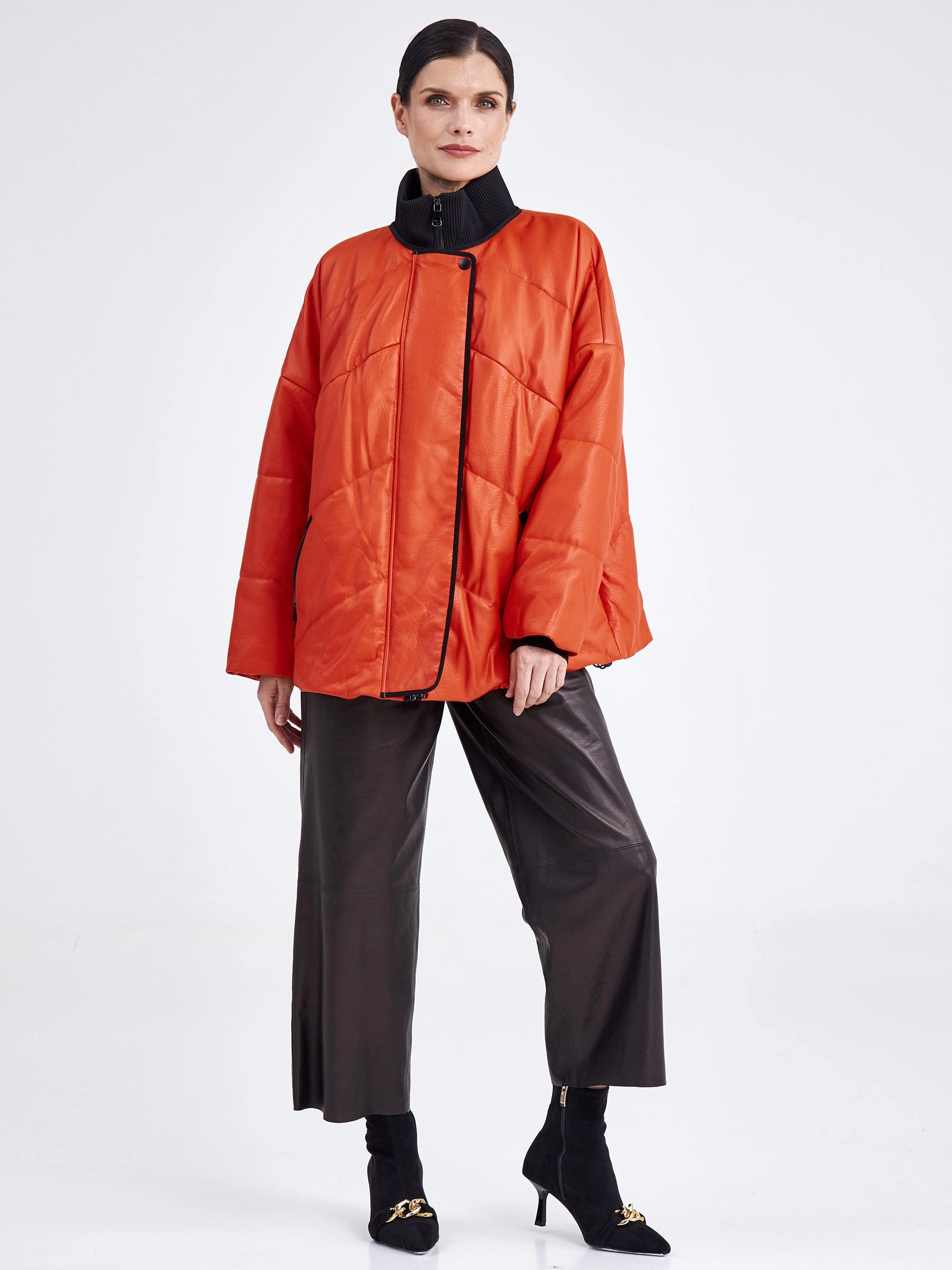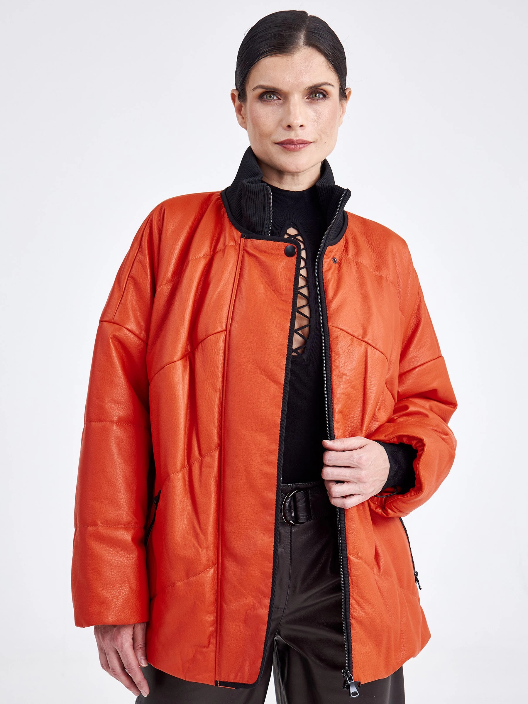 Товар утепленная женская кожаная куртка оверсайз премиум класса 3022, оранжевая, размер 44, артикул 23350 выполнен из натуральной кожи с застежкой молния. Рассчитан на сезон: демисезон. Длина изделия 51-74 см, силуэт свободный.