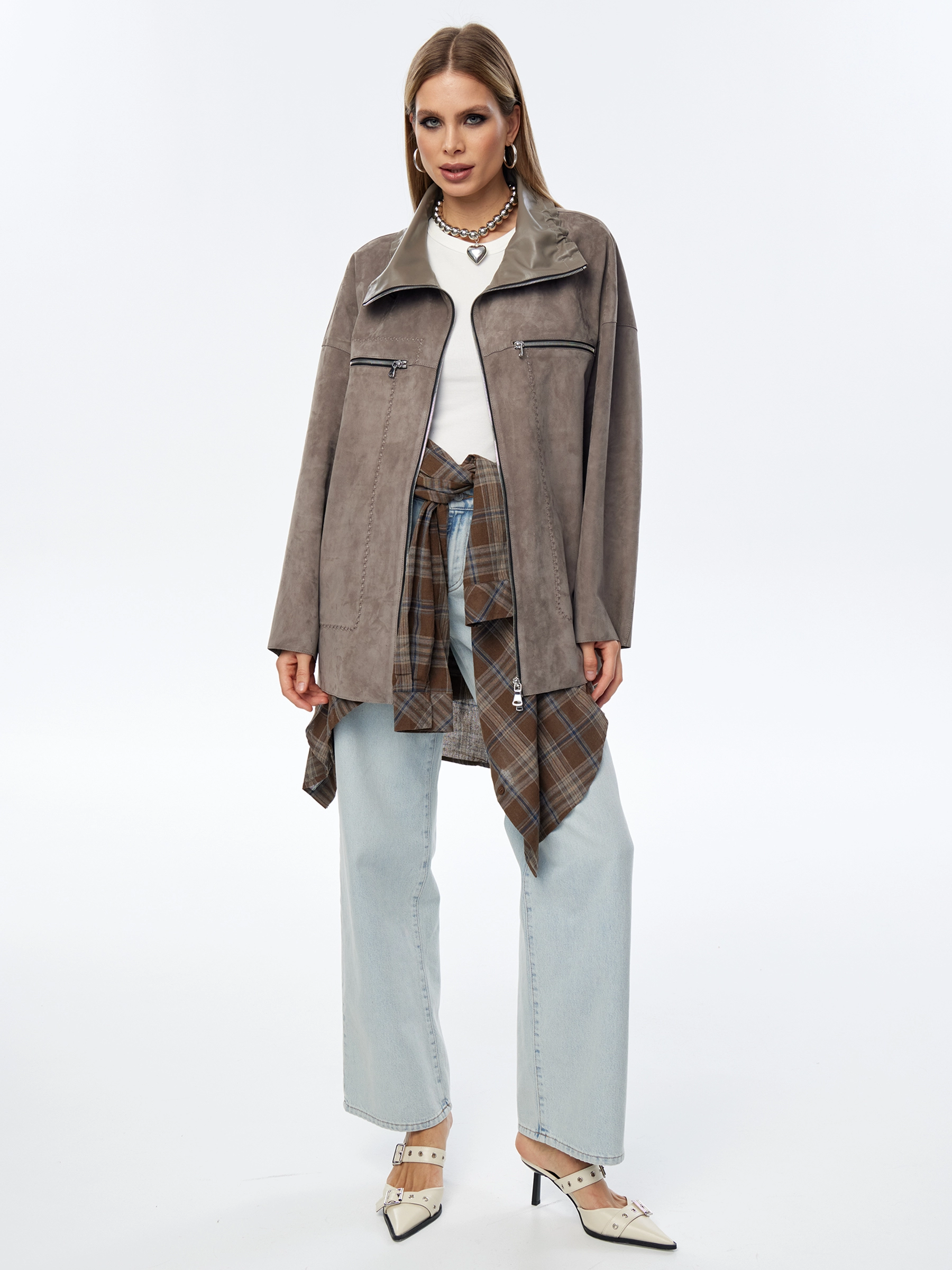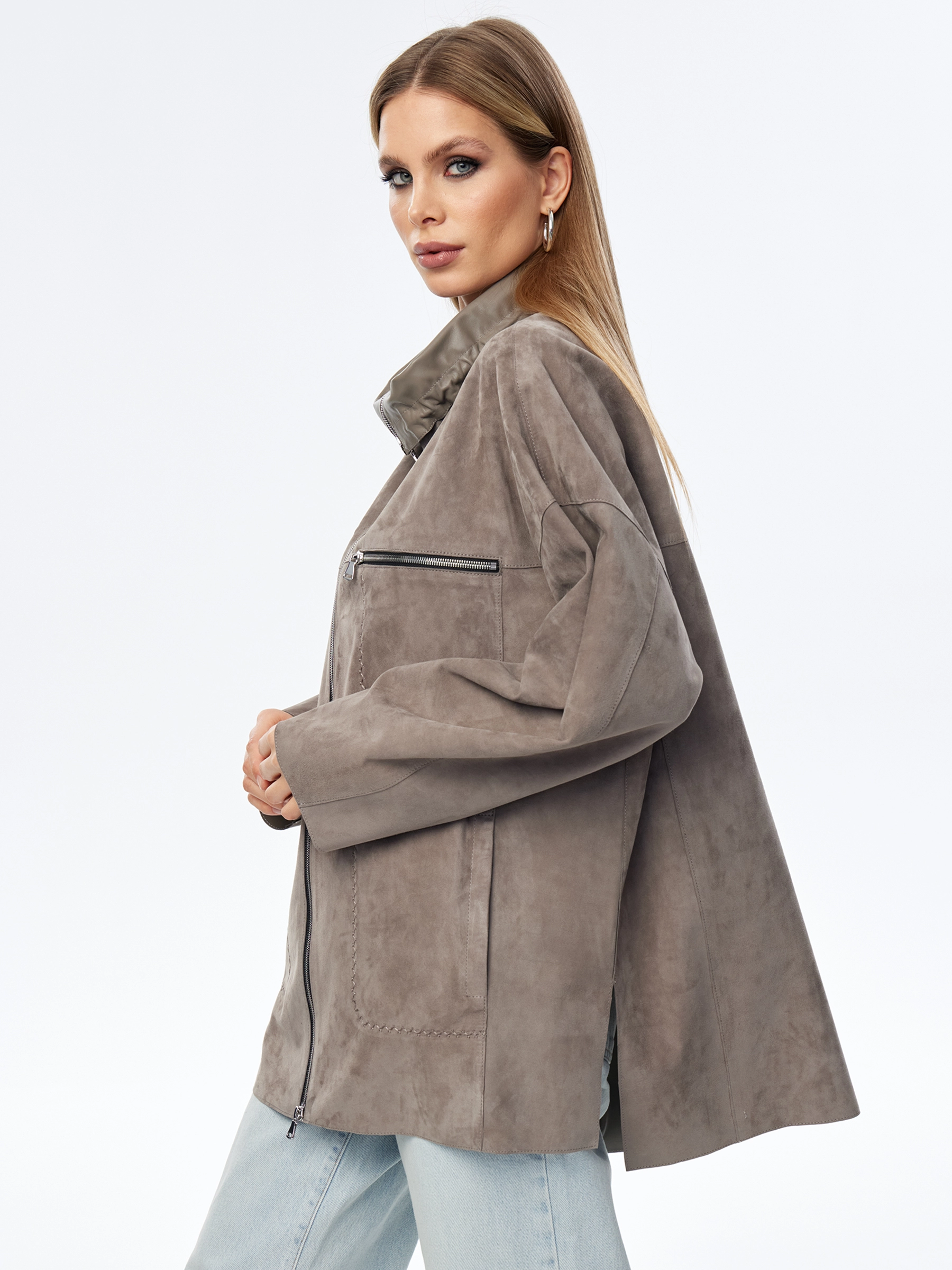 Товар замшевая куртка оверсайз для женщин премиум класса 3055з, серая, размер 50, артикул 24010 выполнен из натуральной замши с застежкой молния. Рассчитан на сезон: весна-осень. Длина изделия 80 см, силуэт оверсайз.