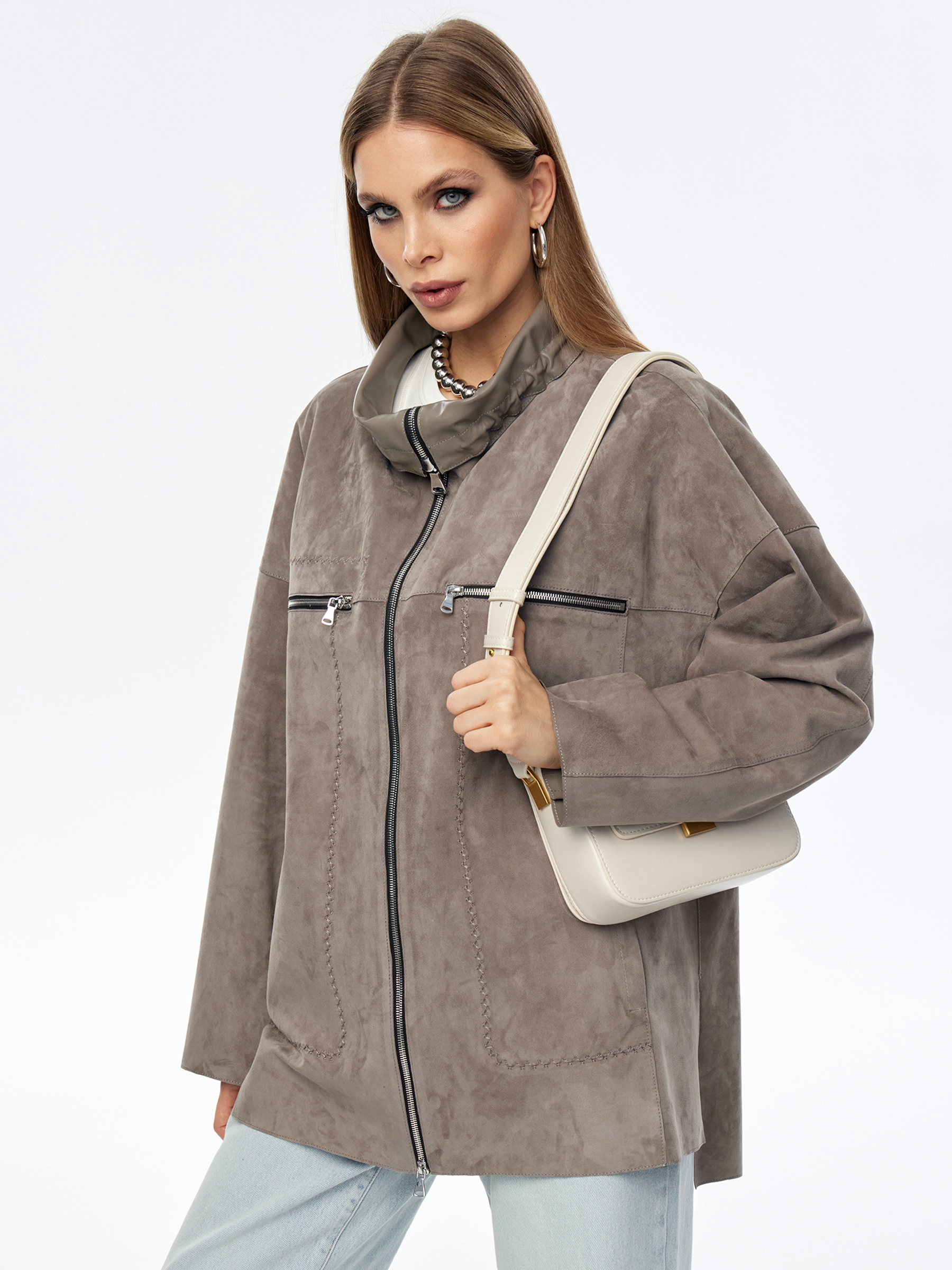 Замшевая куртка оверсайз для женщин премиум класса 3055з, серая, размер 50, артикул 24010