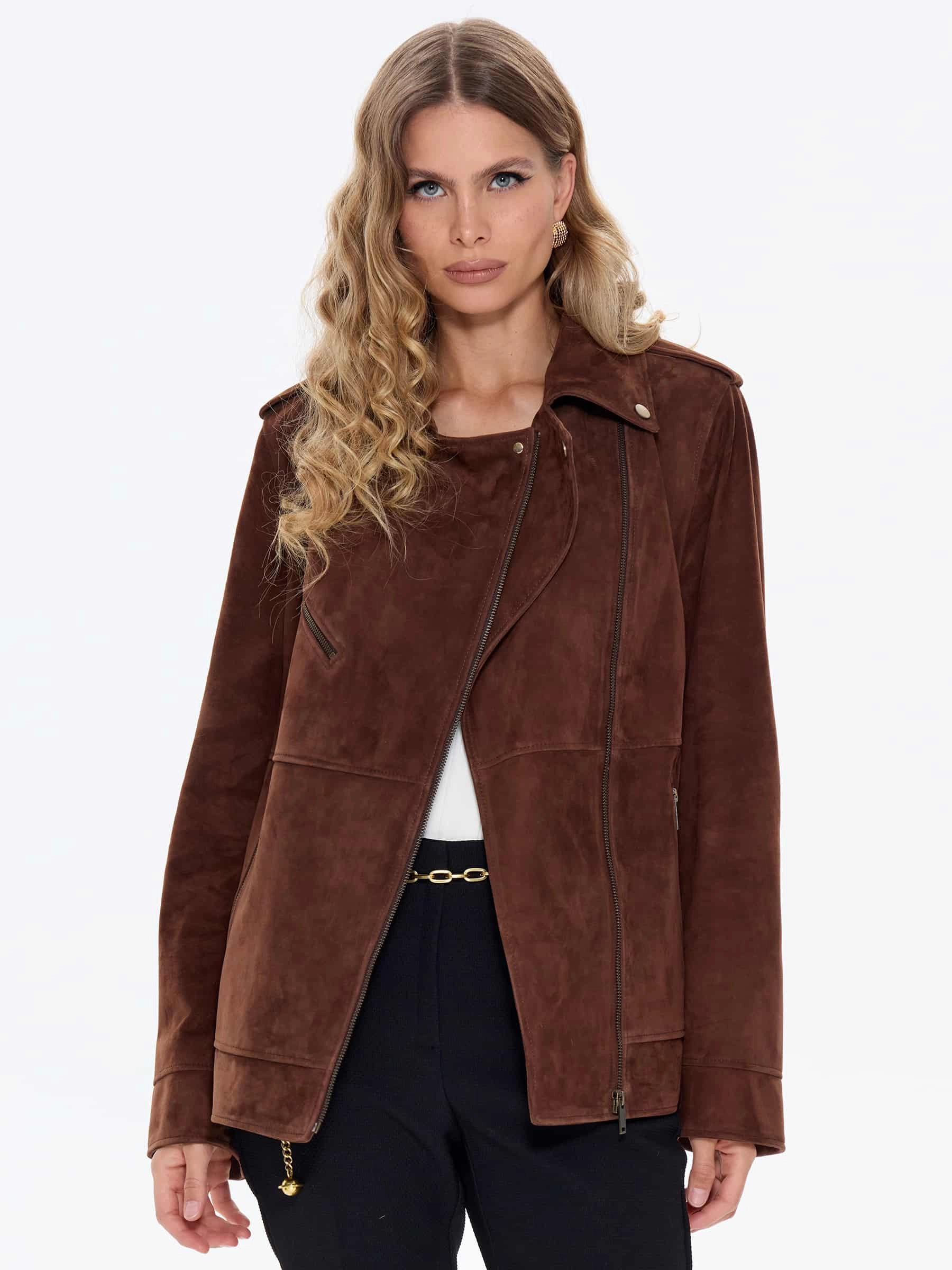 Удлиненную косуху выполнили из замши премиум класса. Прямой крой с втачными рукавами дополнили погонами. Прорезные карманы и манжеты застегиваются крупными молниями. Великолепная посадка по фигуре и свободе движений.